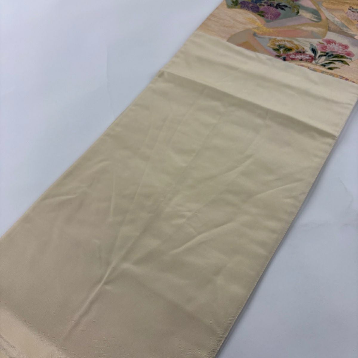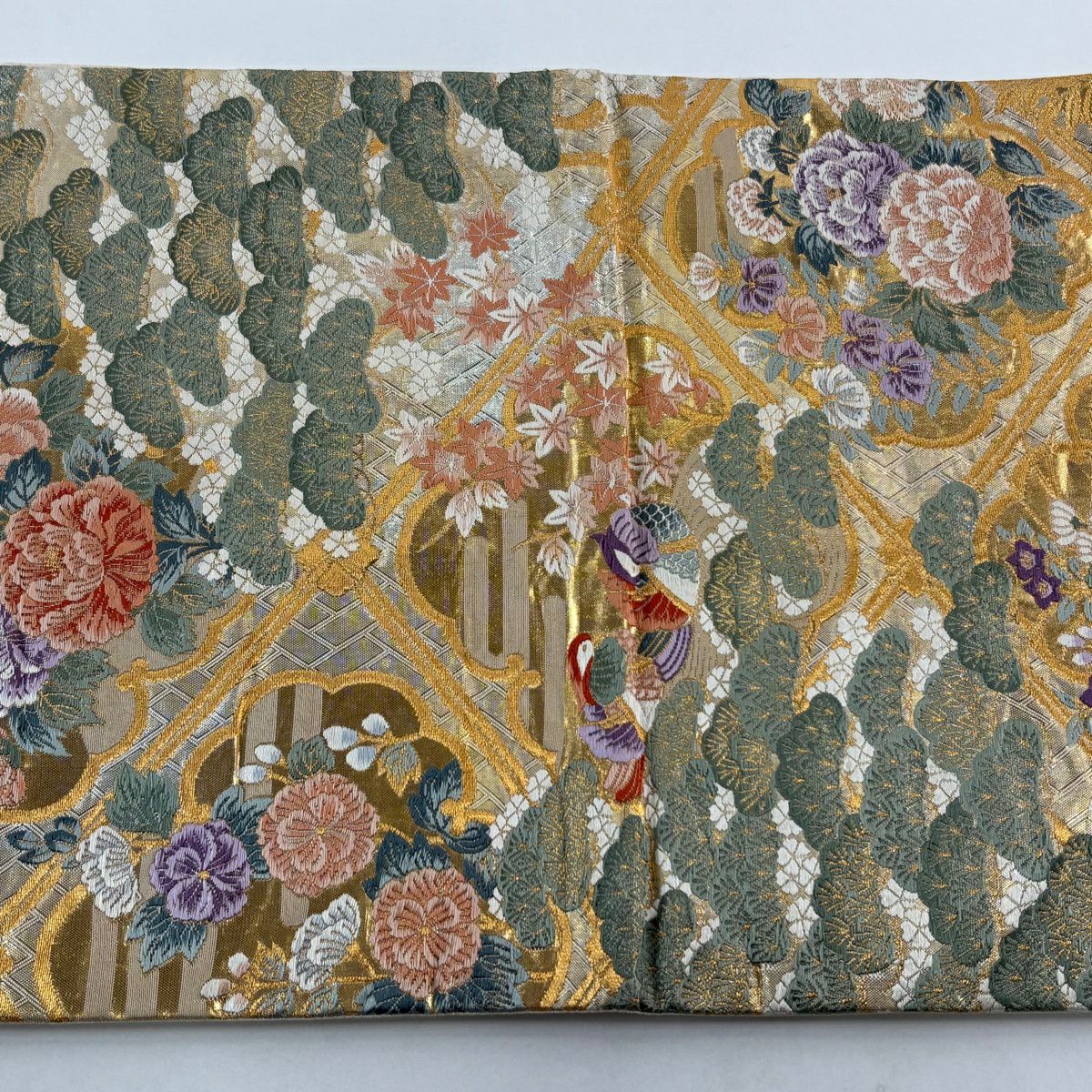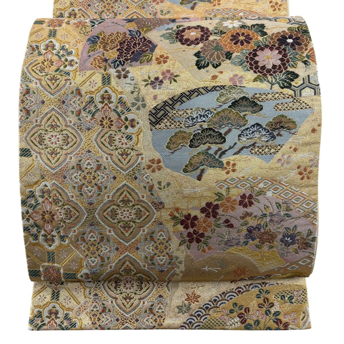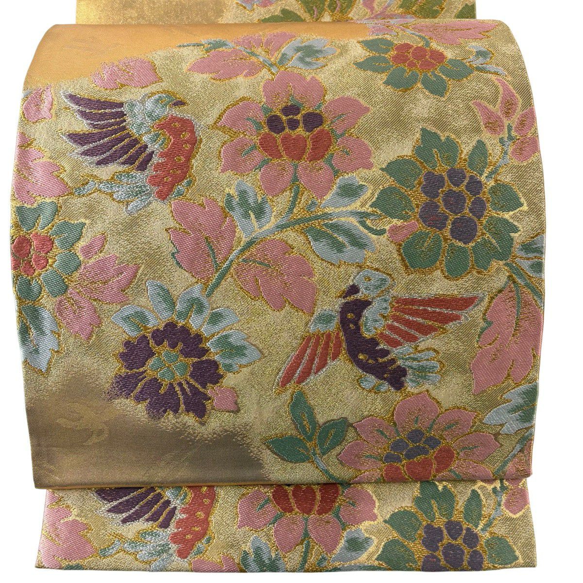 50%OFF 袋帯 秀品 扇面 花鳥 金糸 箔 金色 六通 正絹 K50