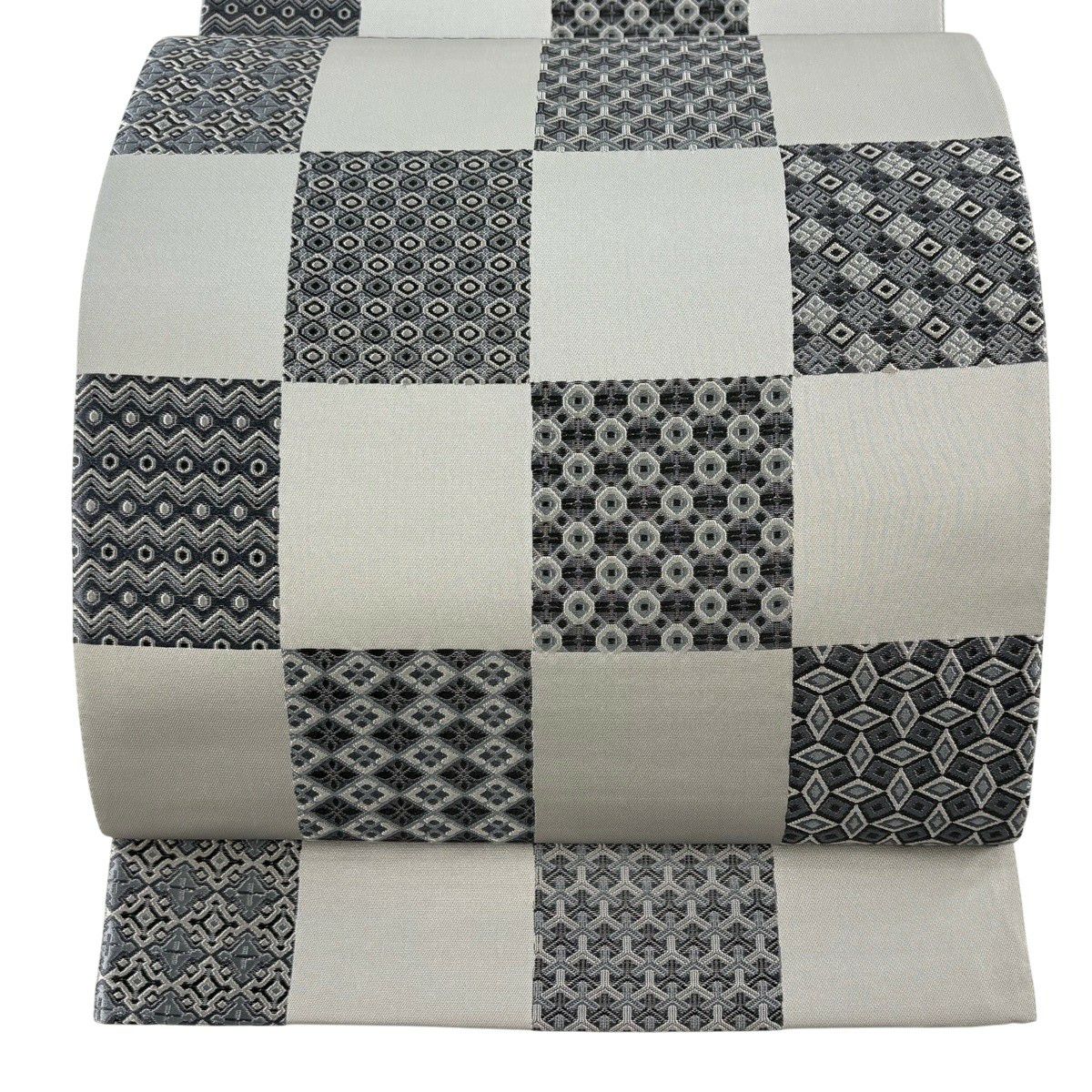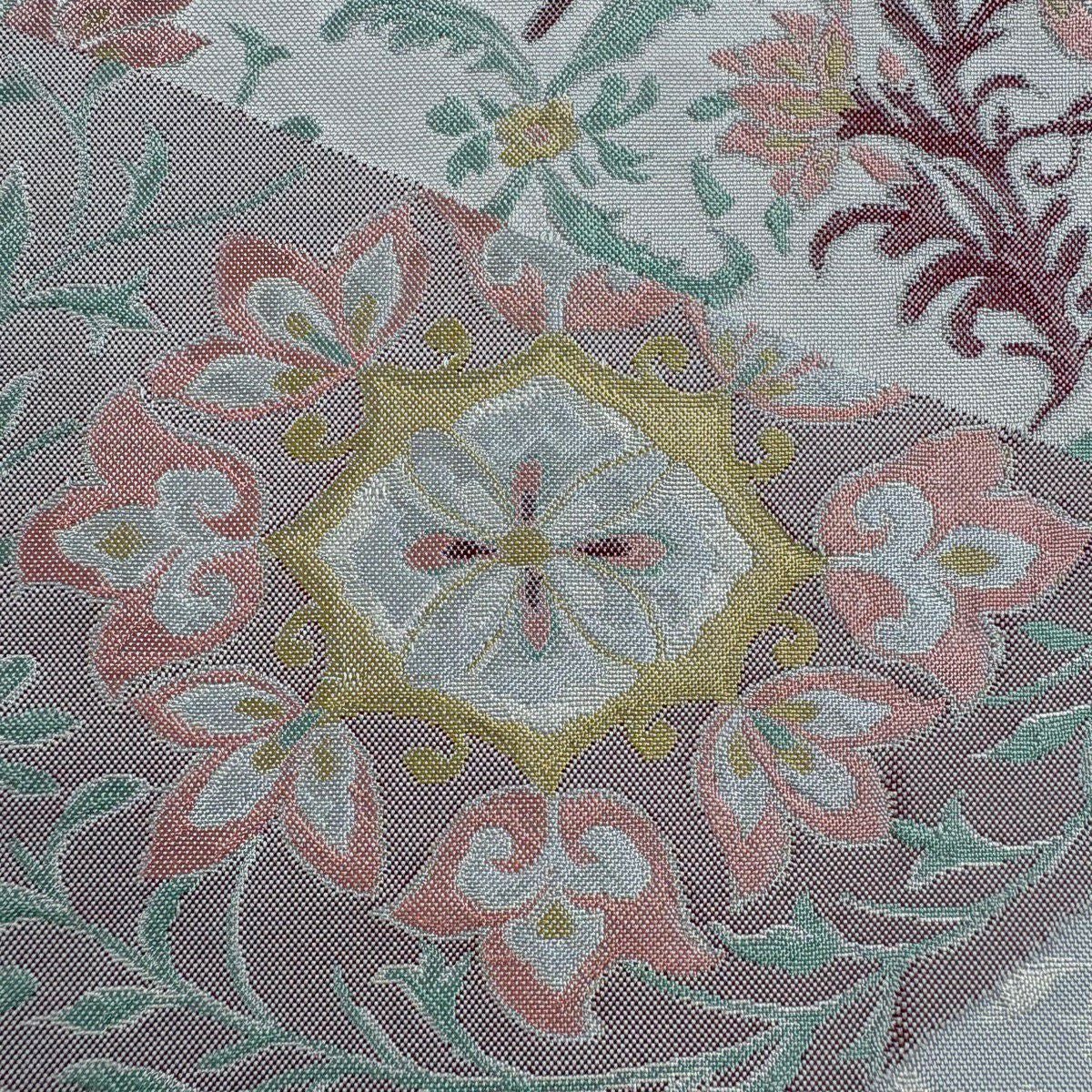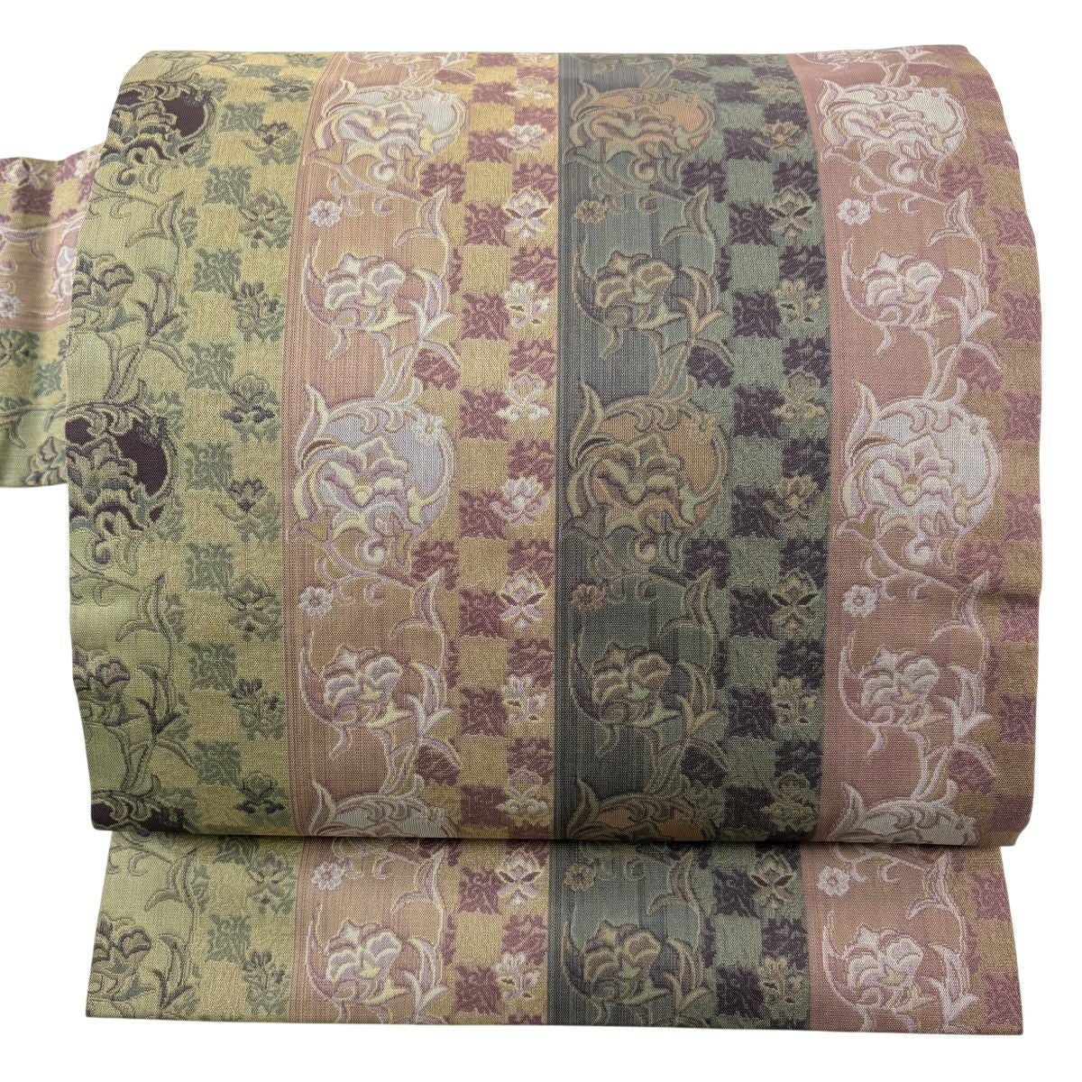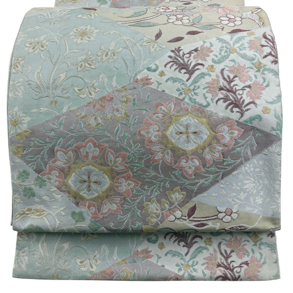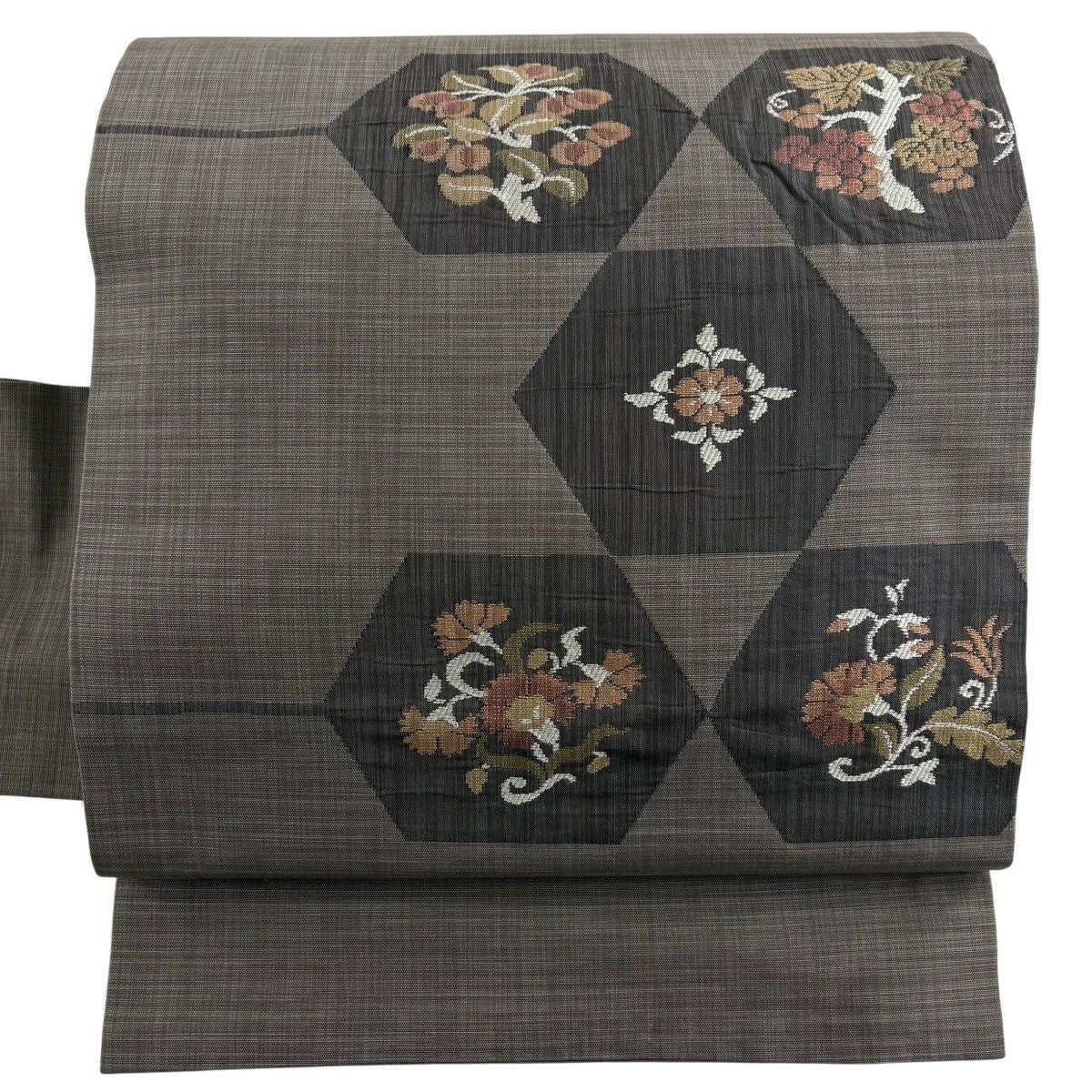 50%OFF 【美品】 名古屋帯 秀品 草花 市松 灰緑 正絹 K50