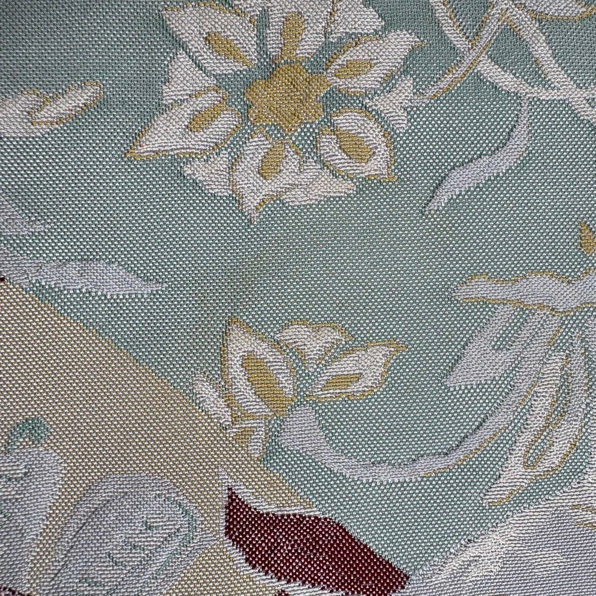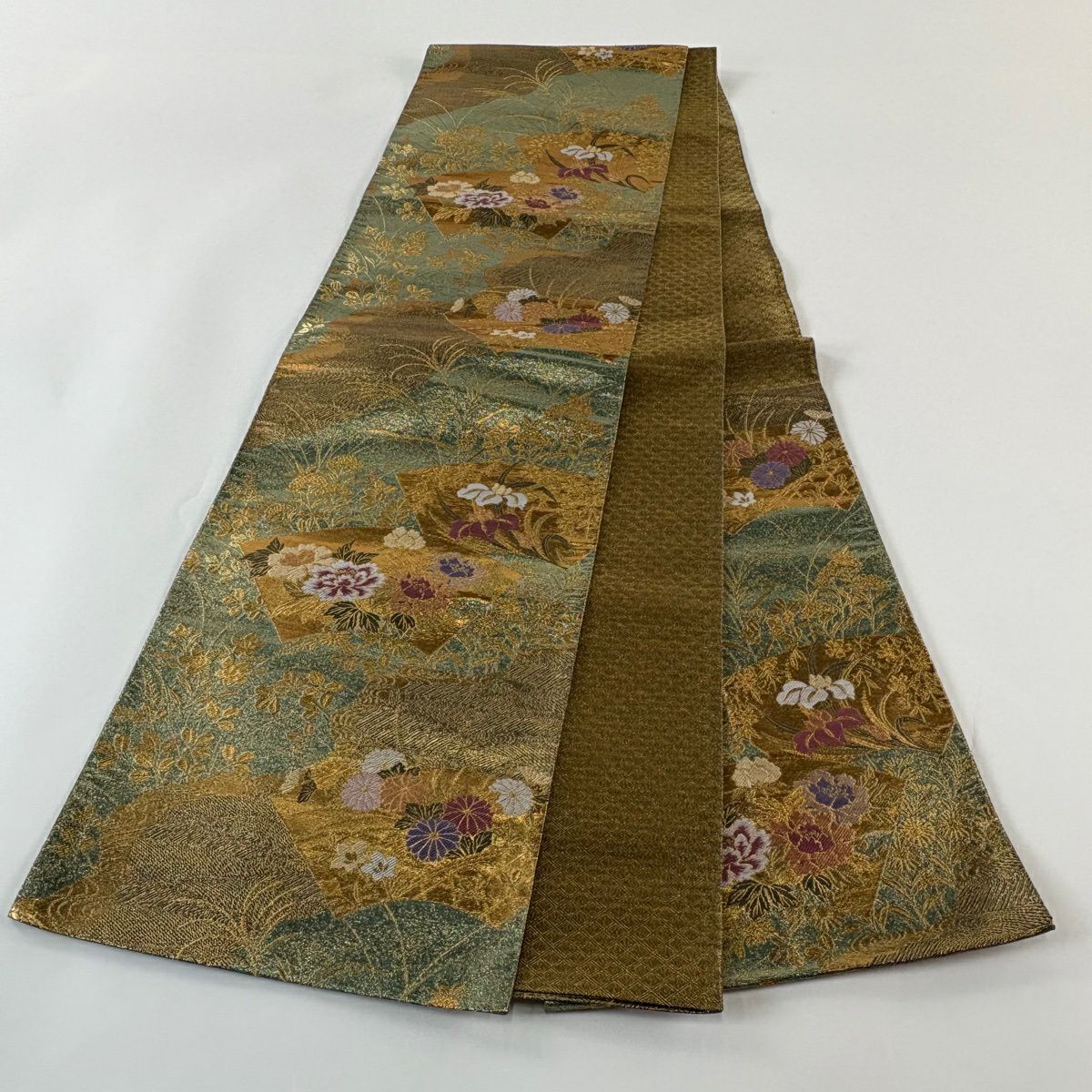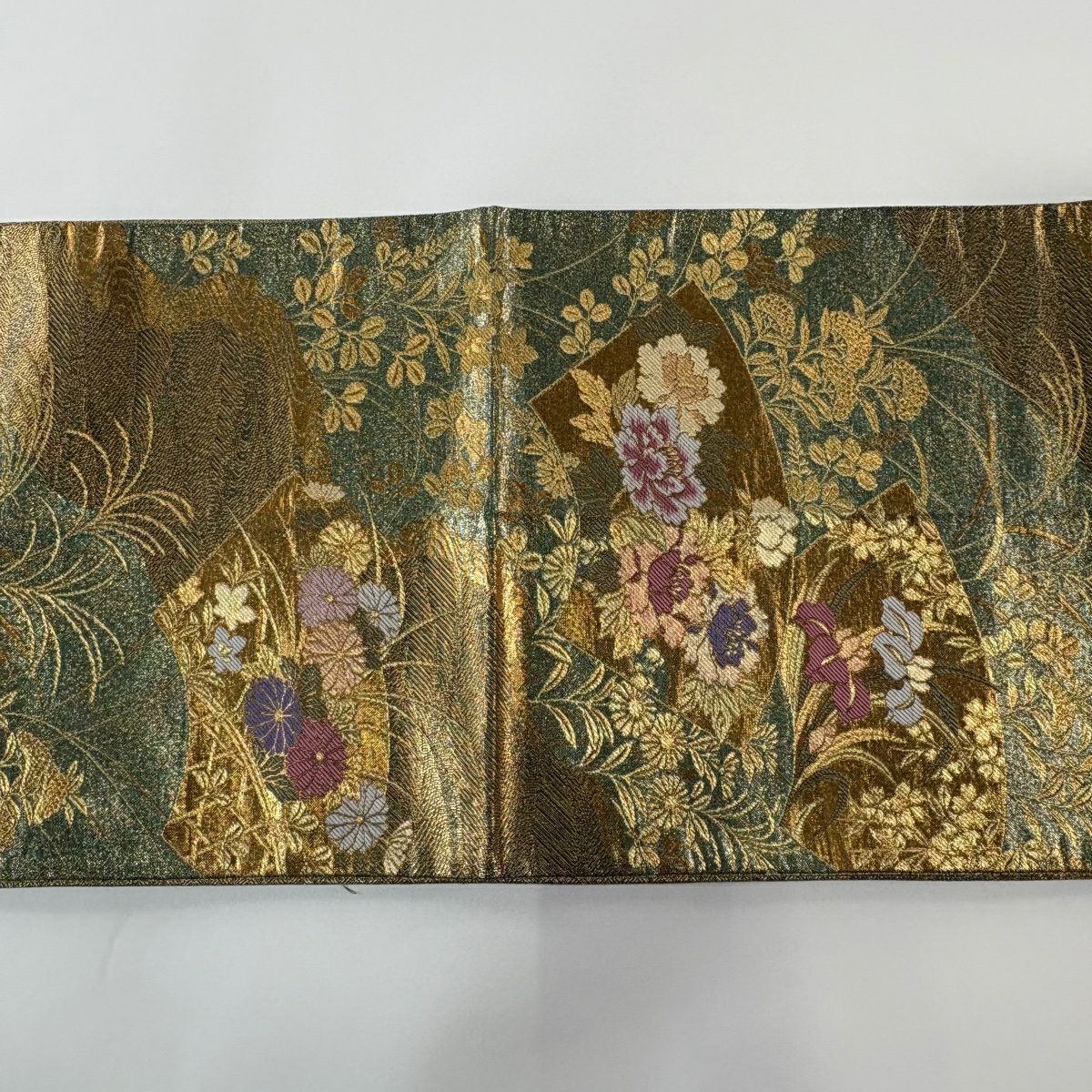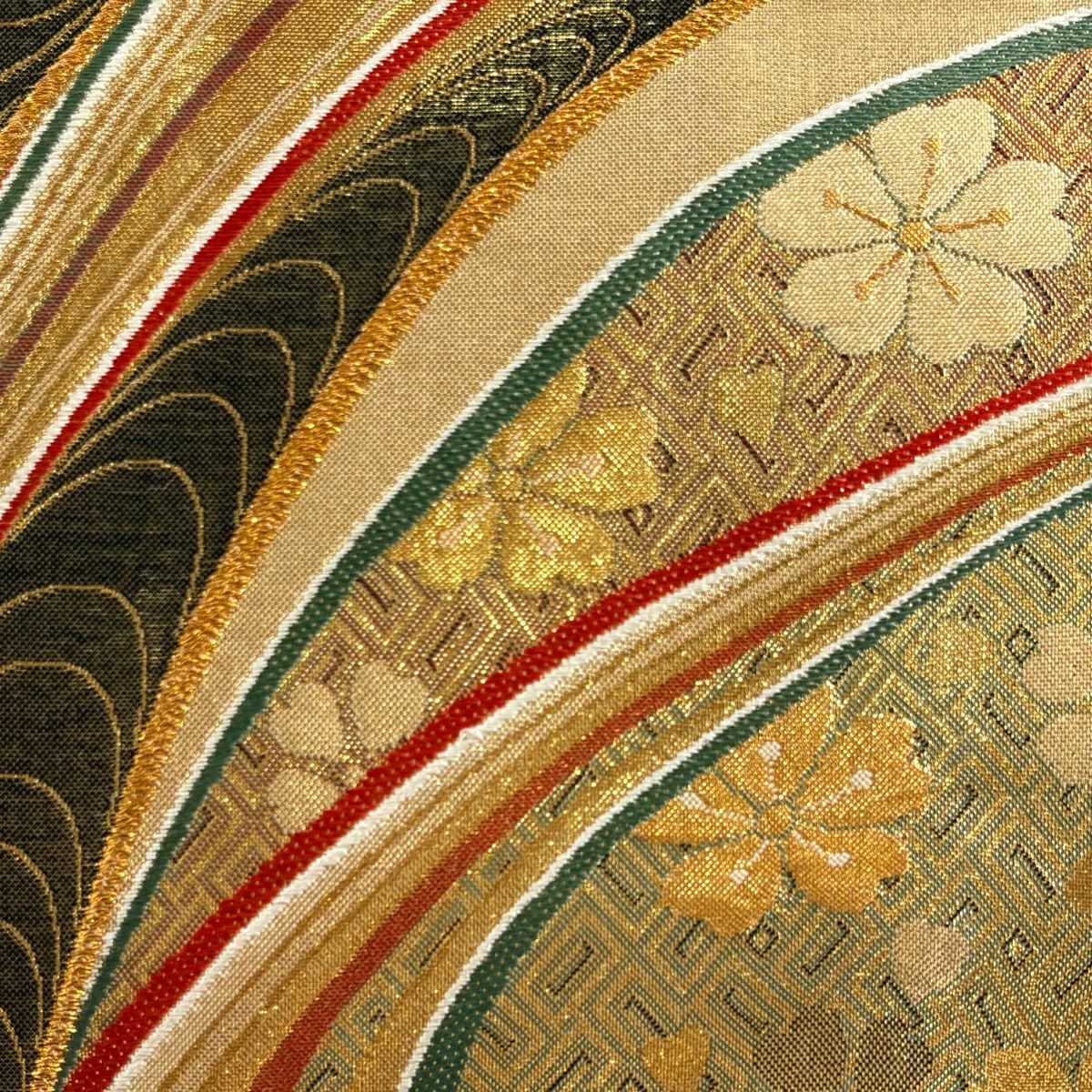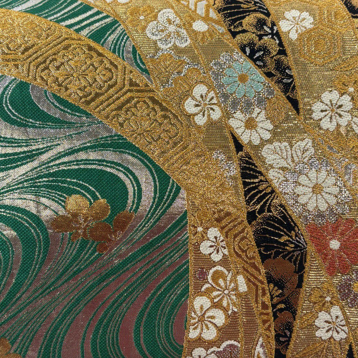 50%OFF 袋帯 秀品 扇面 草花 金糸 箔 緑 六通 正絹 K50