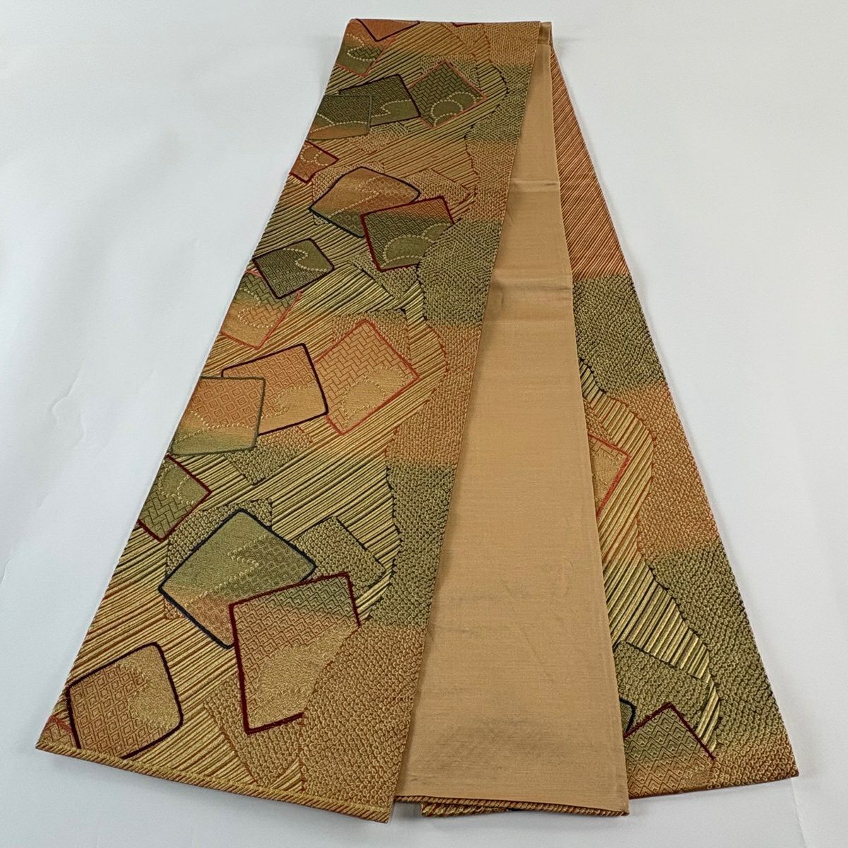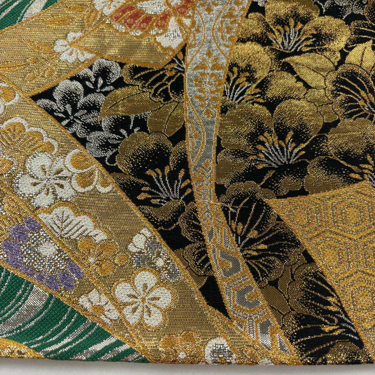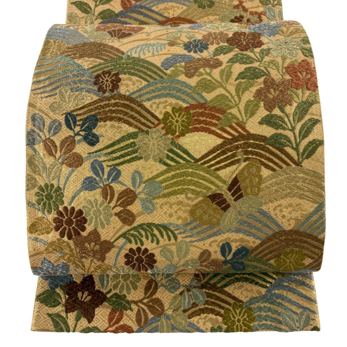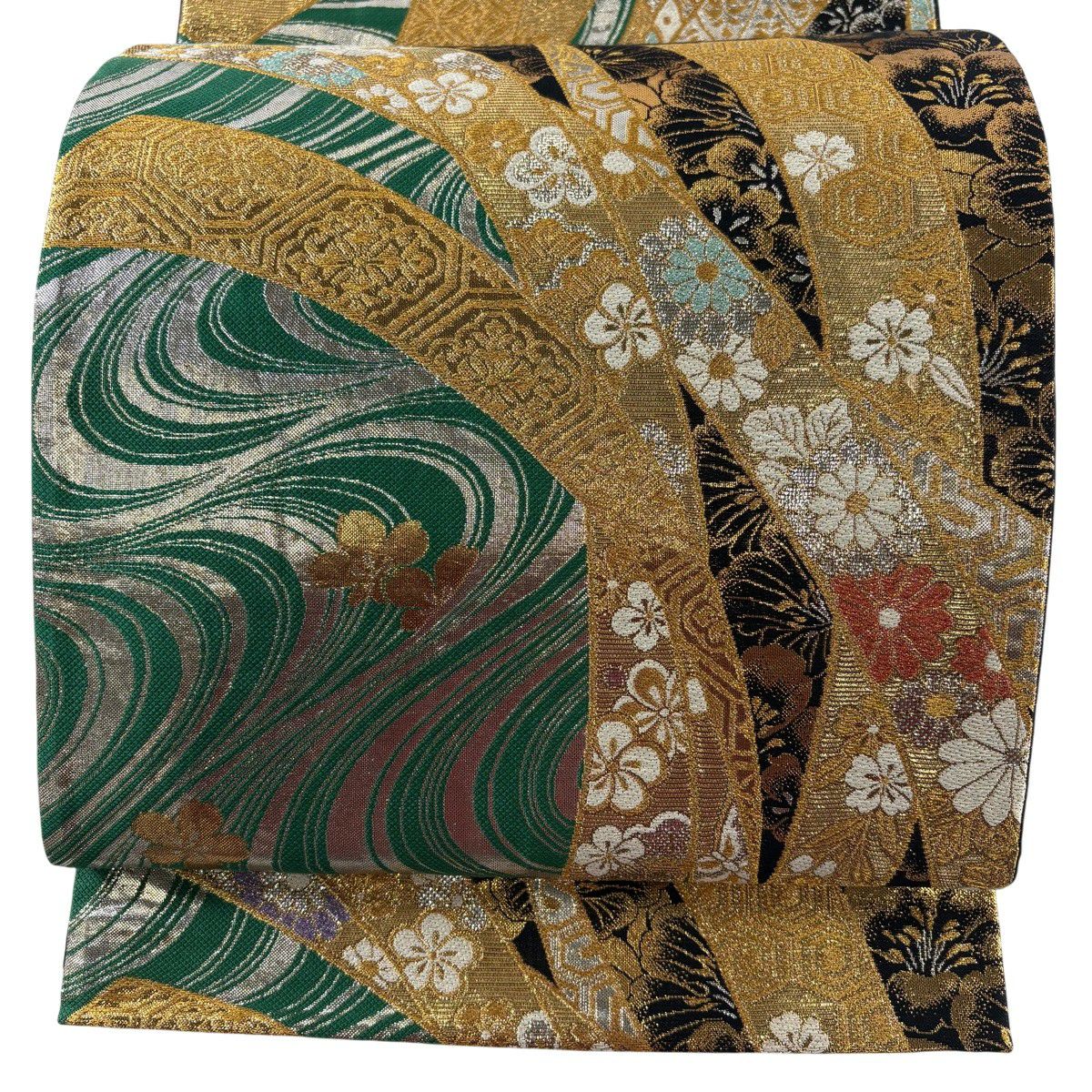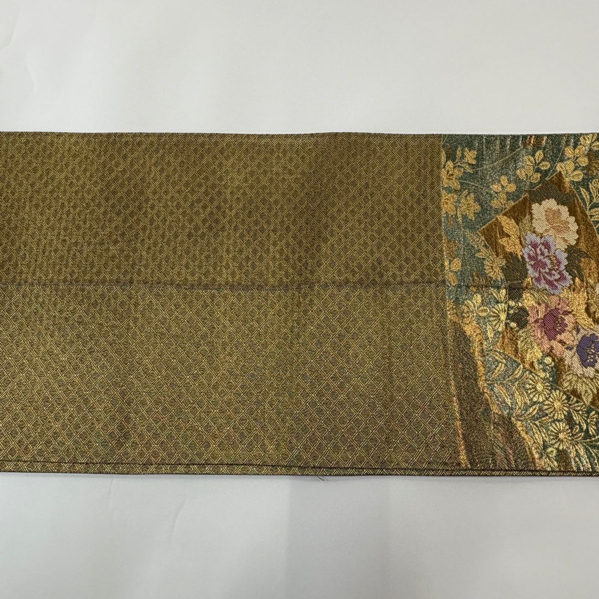 50%OFF 袋帯 秀品 扇面 草花 金糸 箔 緑 六通 正絹 K50