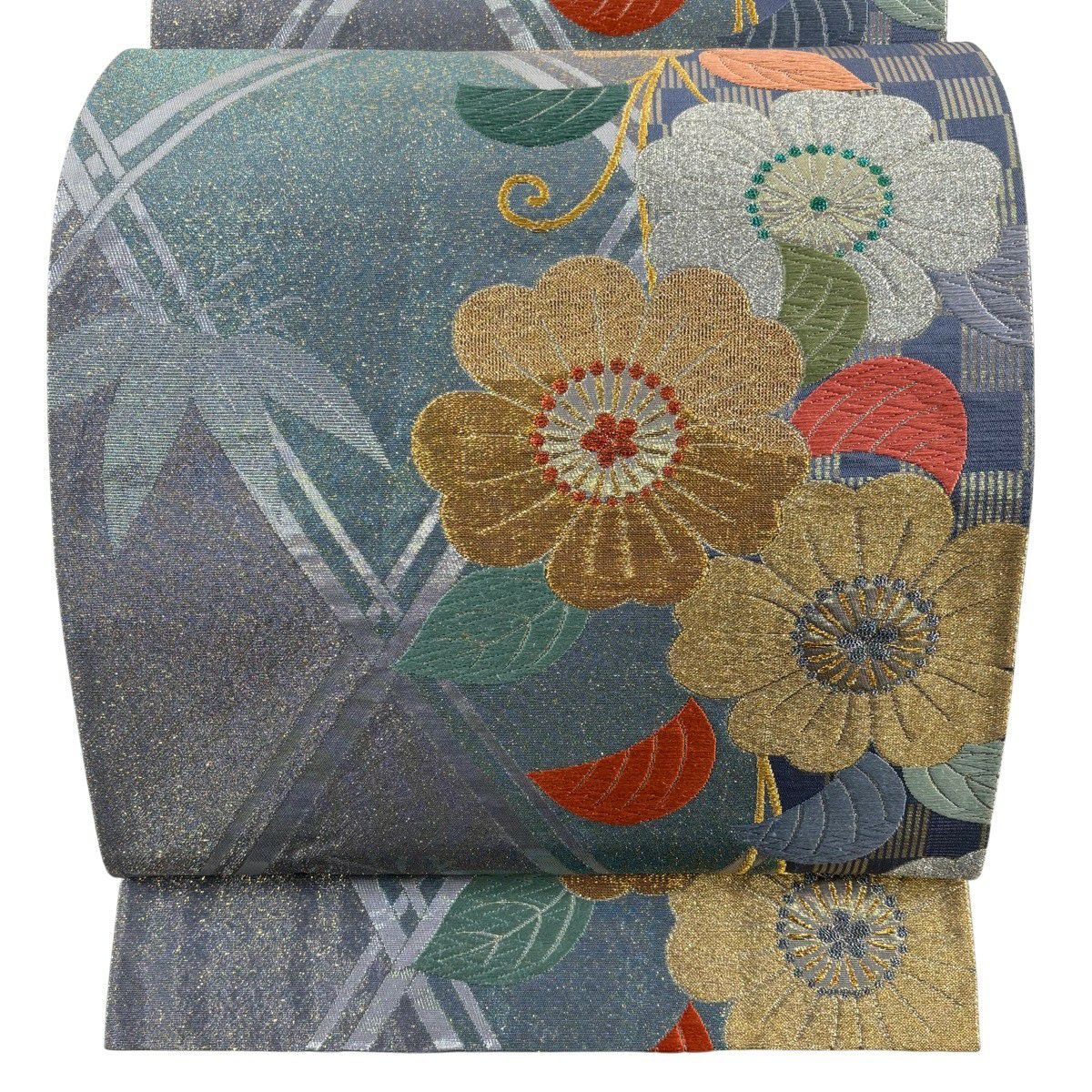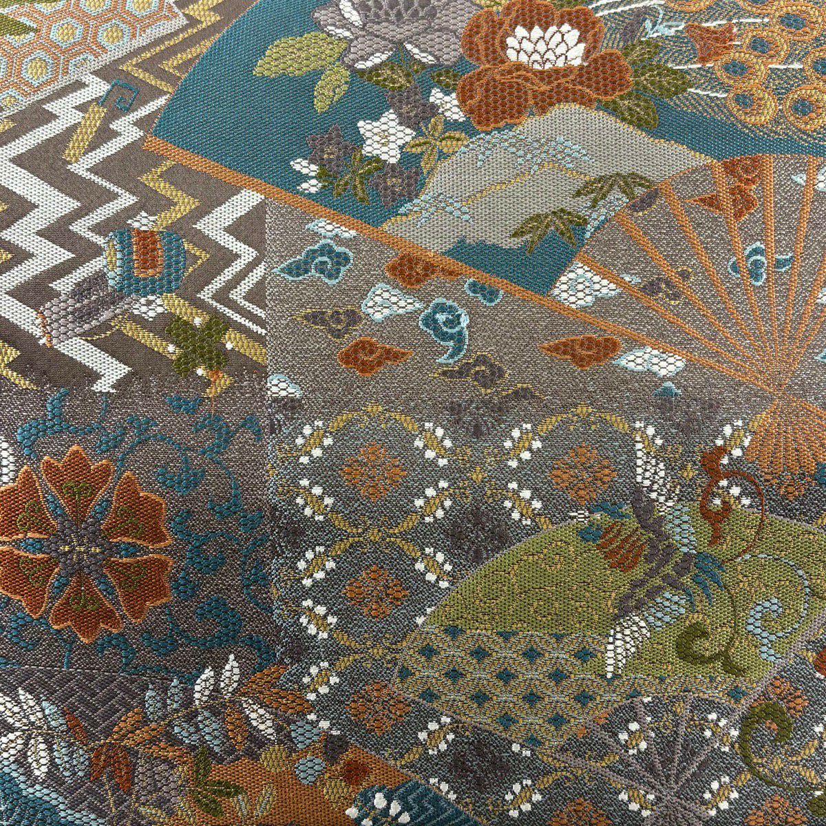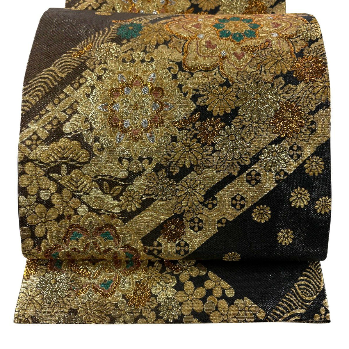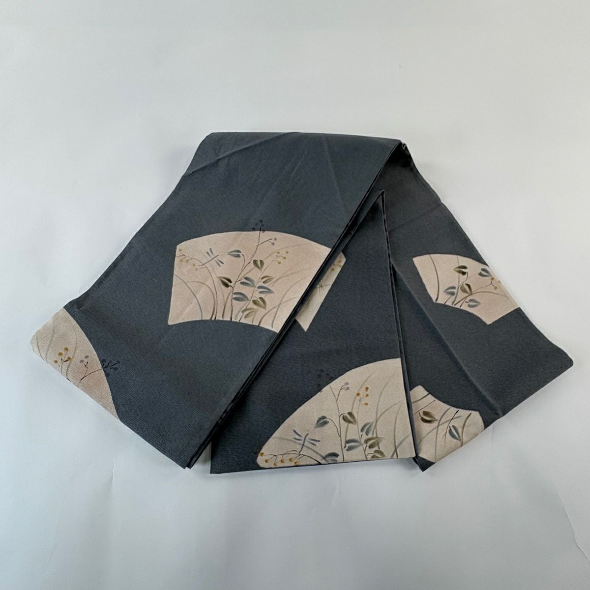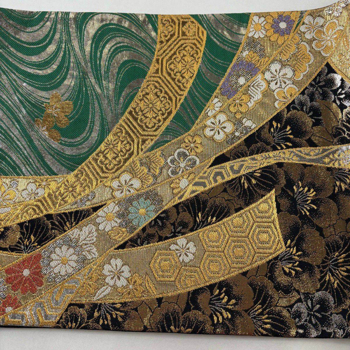 50%OFF 袋帯 秀品 扇面 草花 金糸 箔 緑 六通 正絹 K50