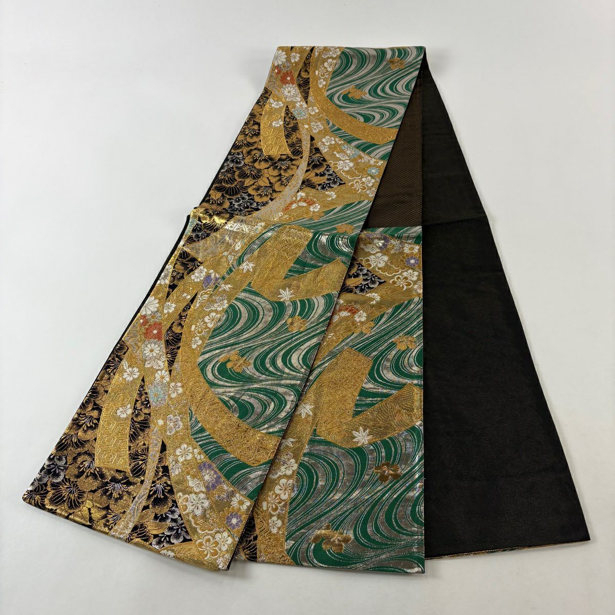 50%OFF 【美品】 袋帯 秀品 草花 箔 深緑 六通 正絹 K50