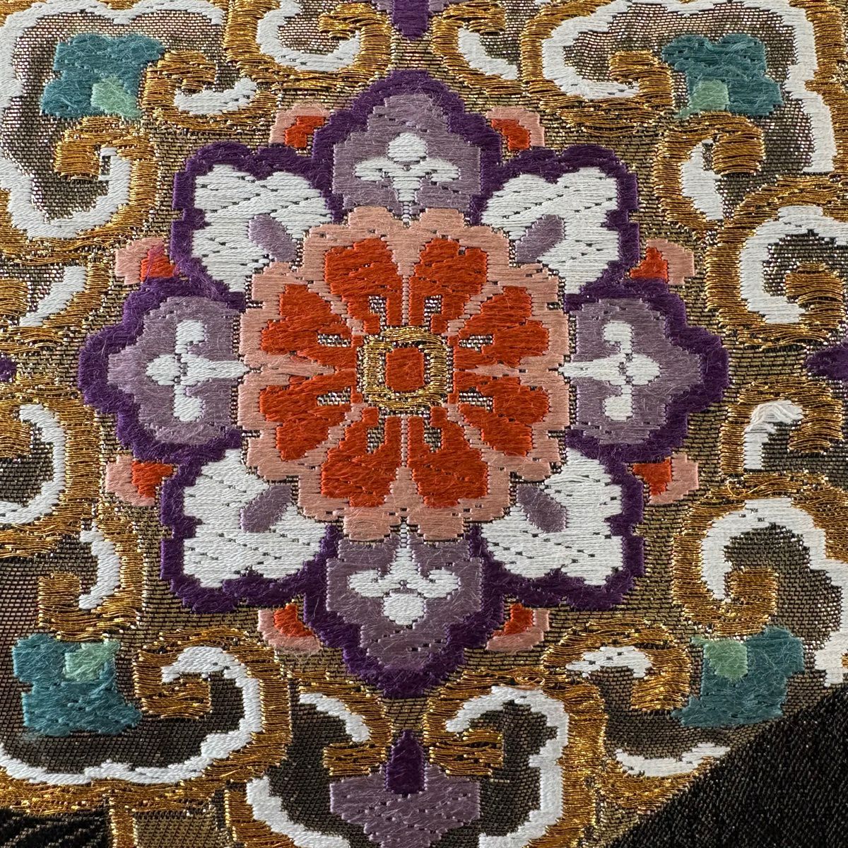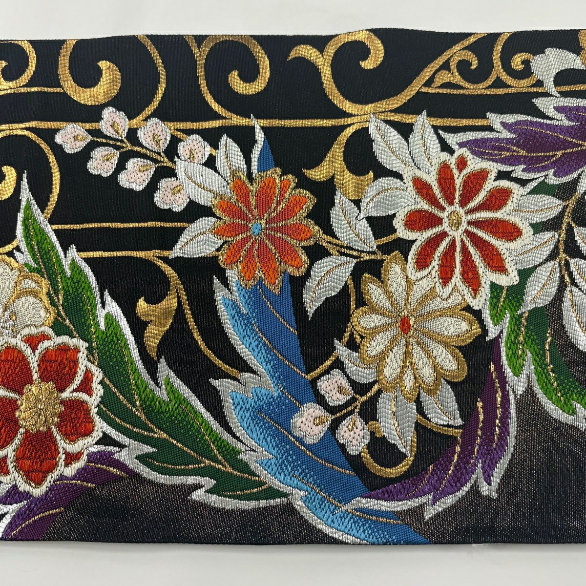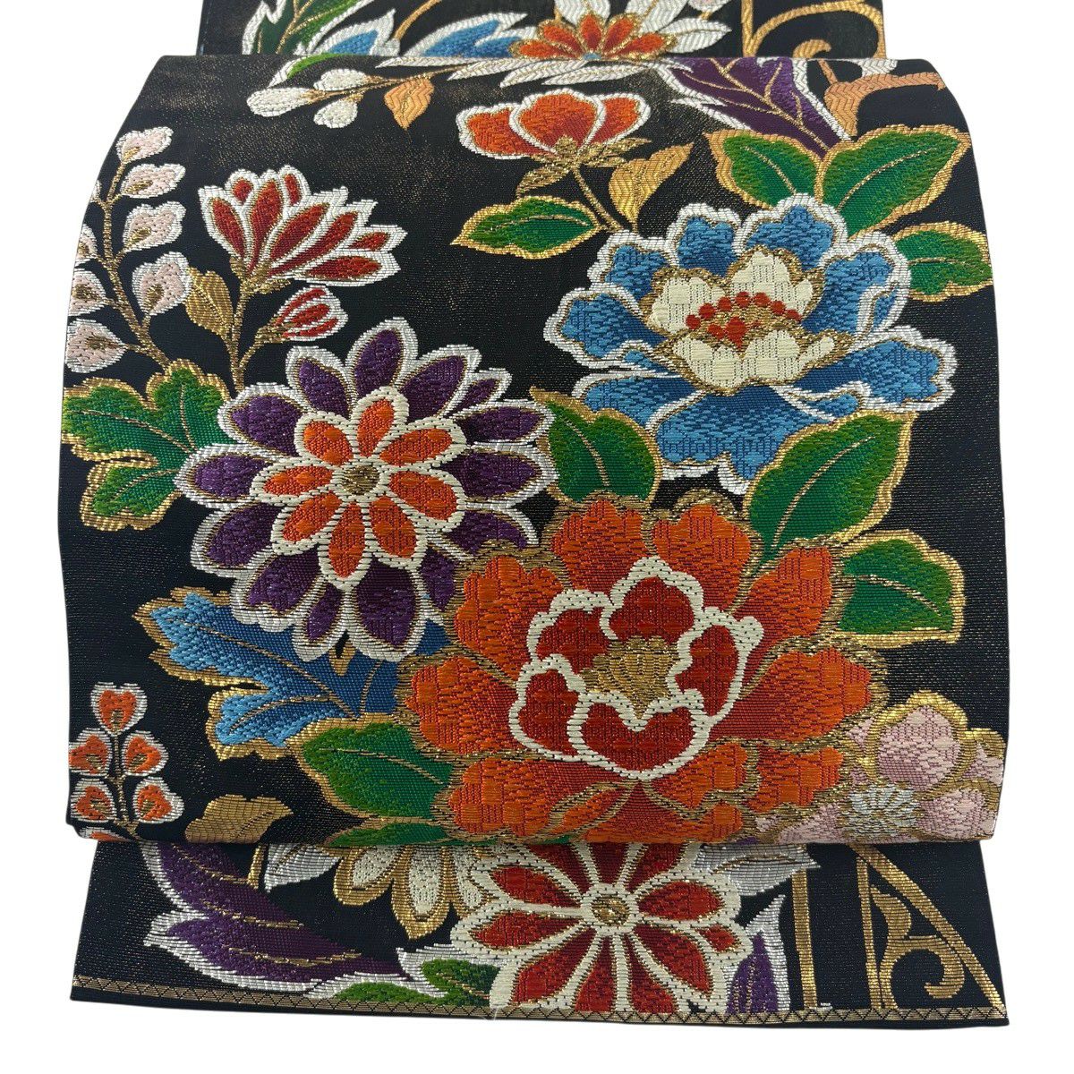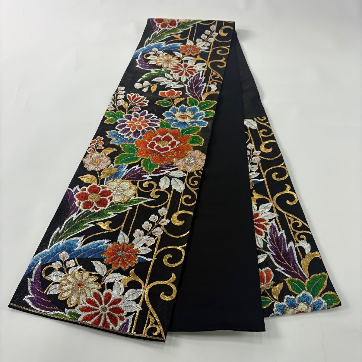 50%OFF 袋帯 秀品 牡丹 唐草 金糸 箔 黒 六通 正絹 K50