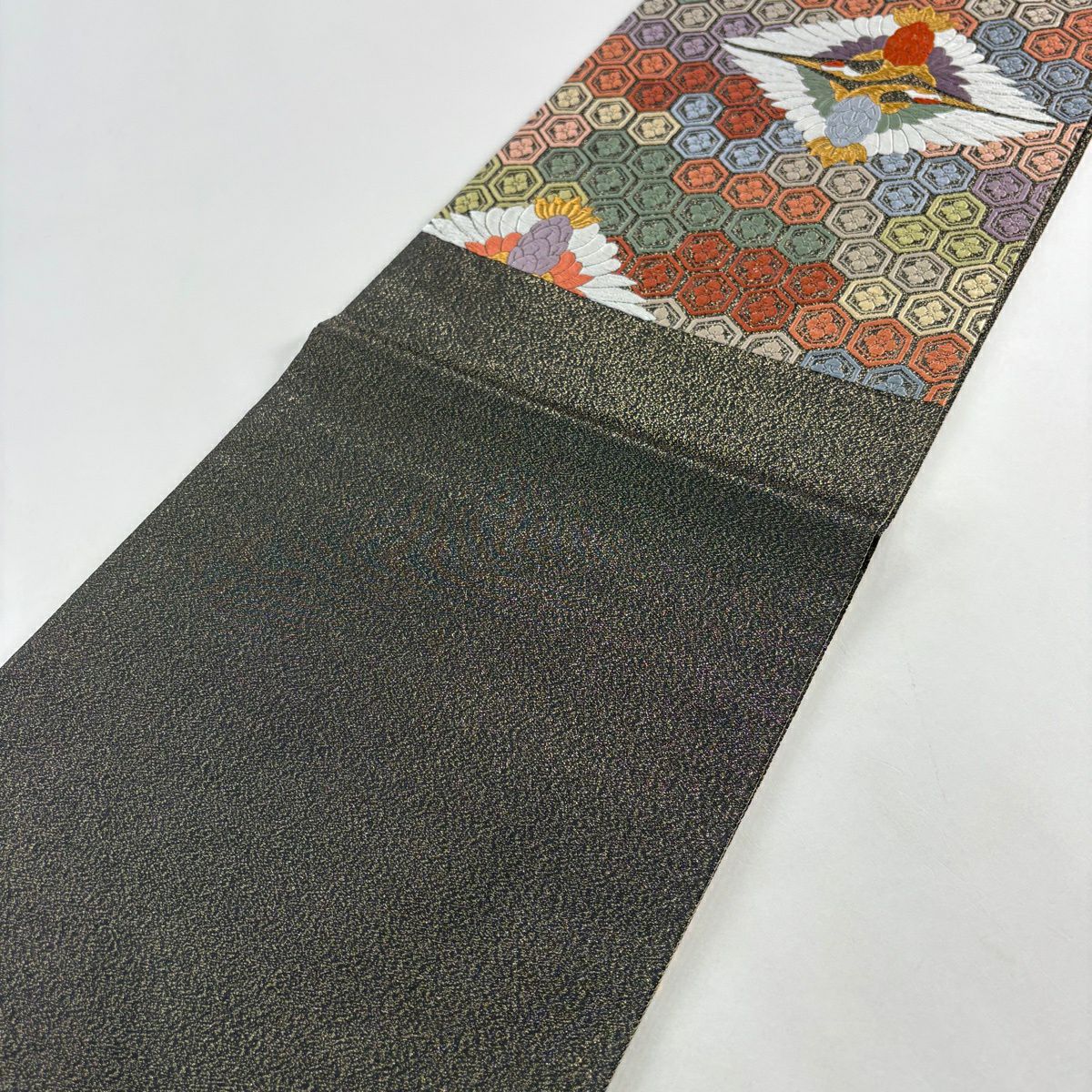 50%OFF 袋帯 秀品 鶴 亀甲 金糸 箔 黒灰 六通 正絹 K50