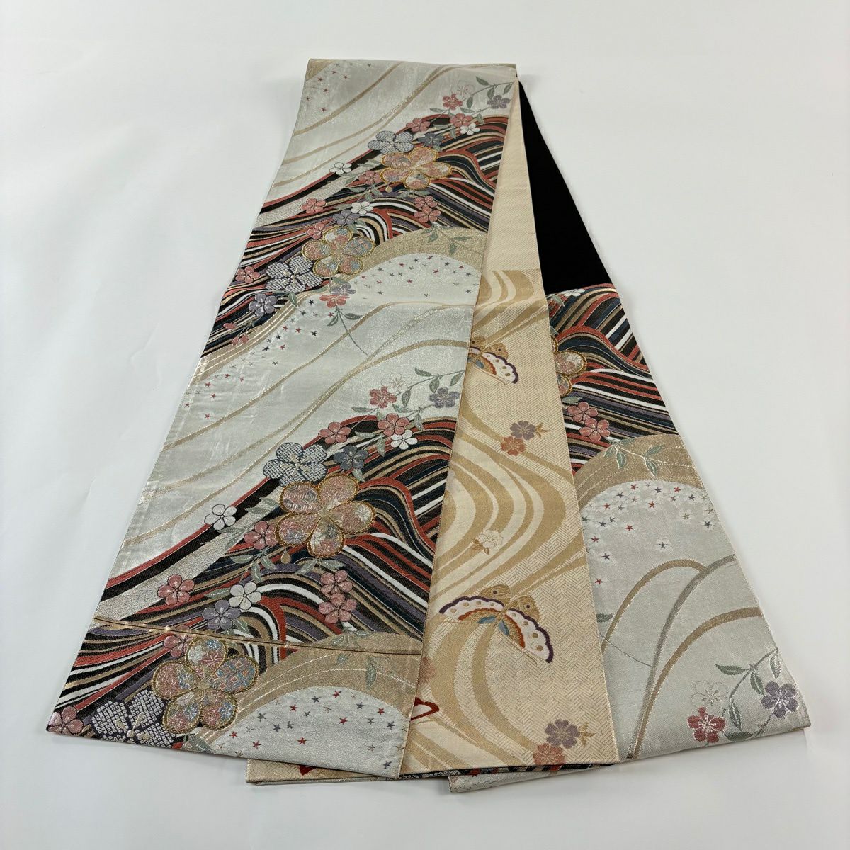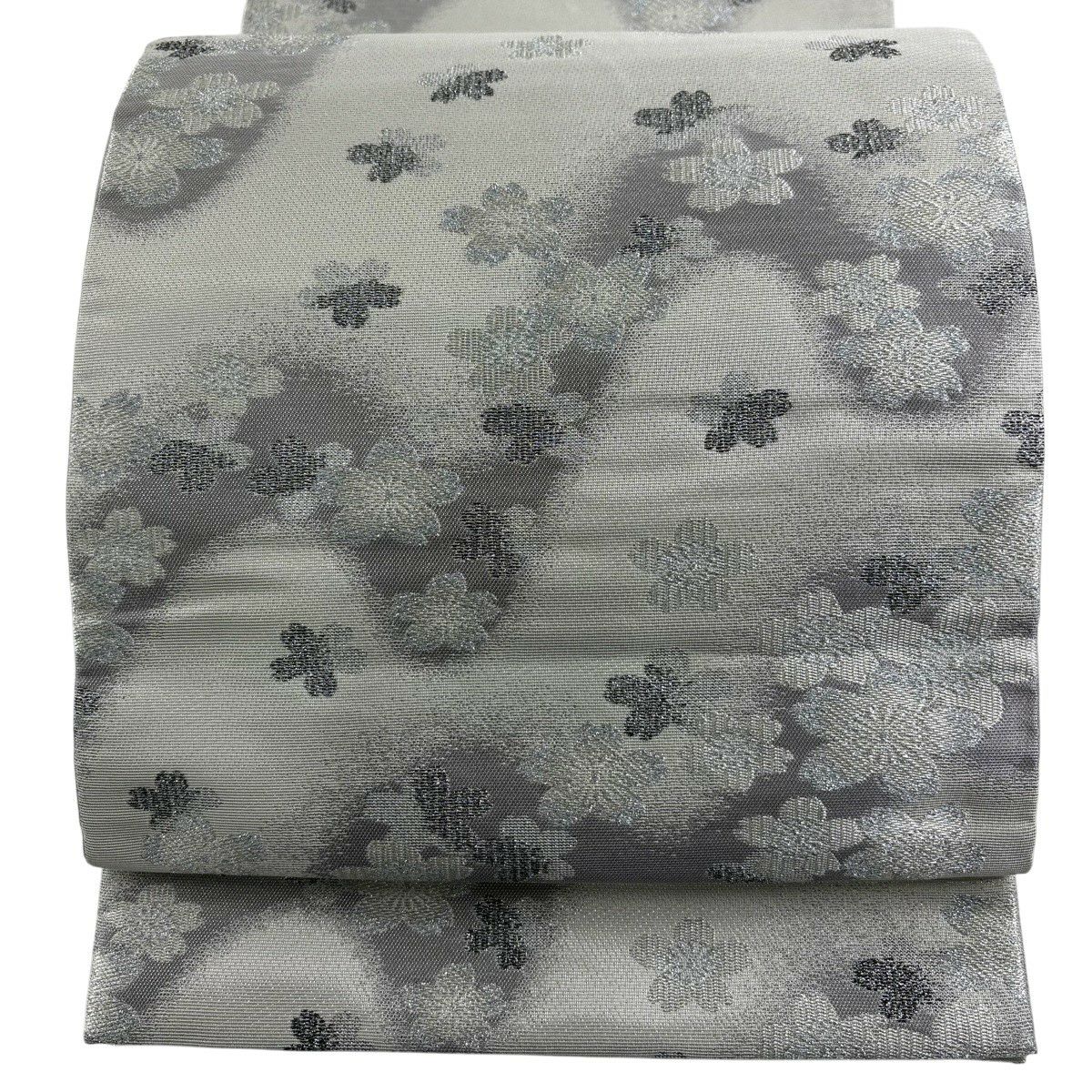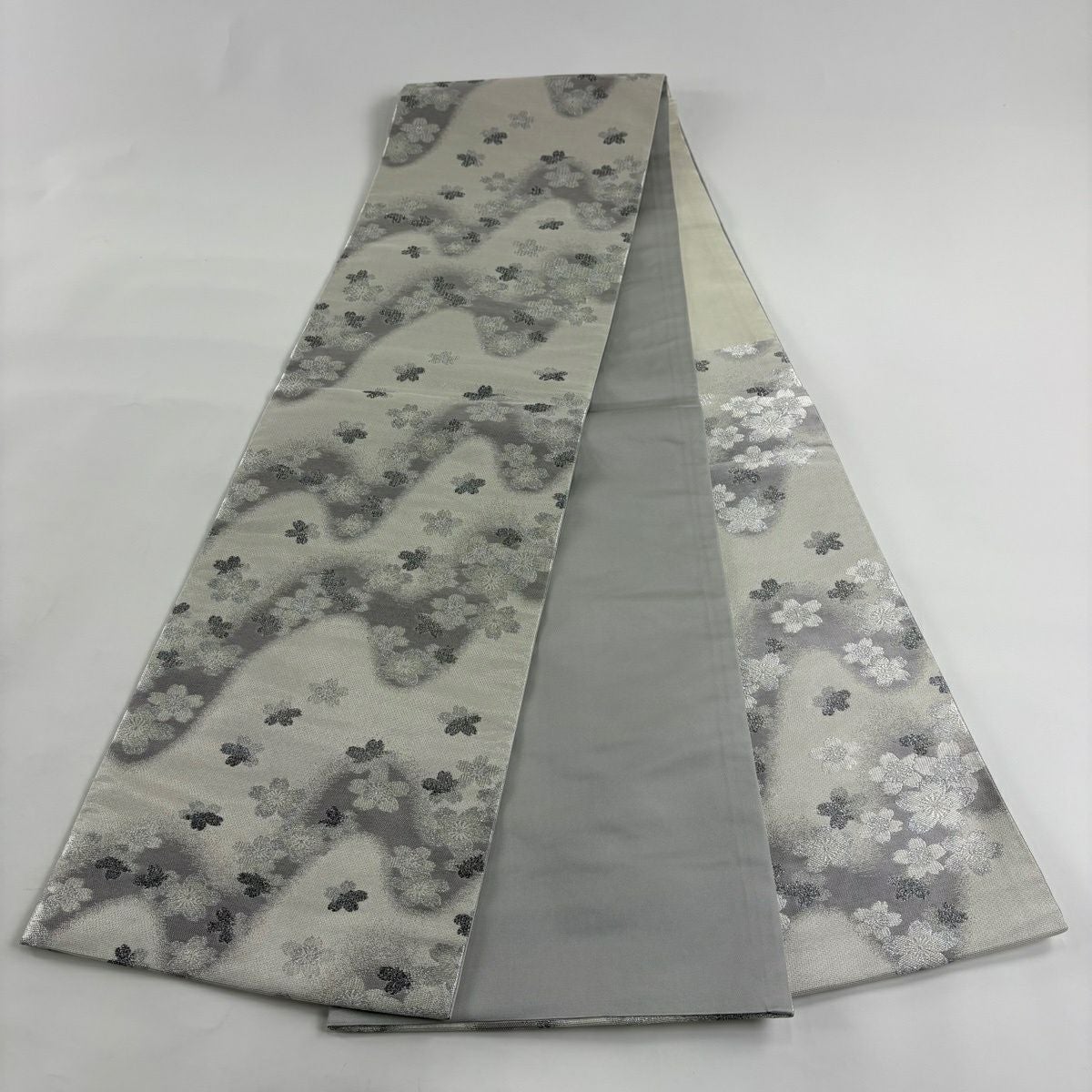 50%OFF 袋帯 秀品 桜 流水 銀糸 箔 灰白 六通 正絹 K50