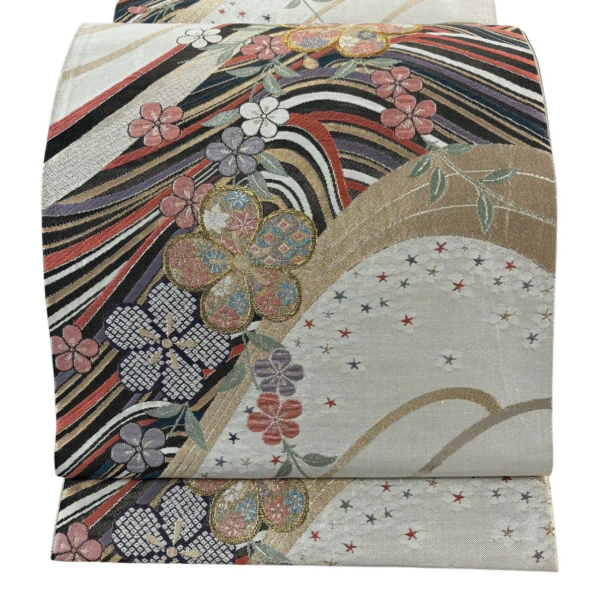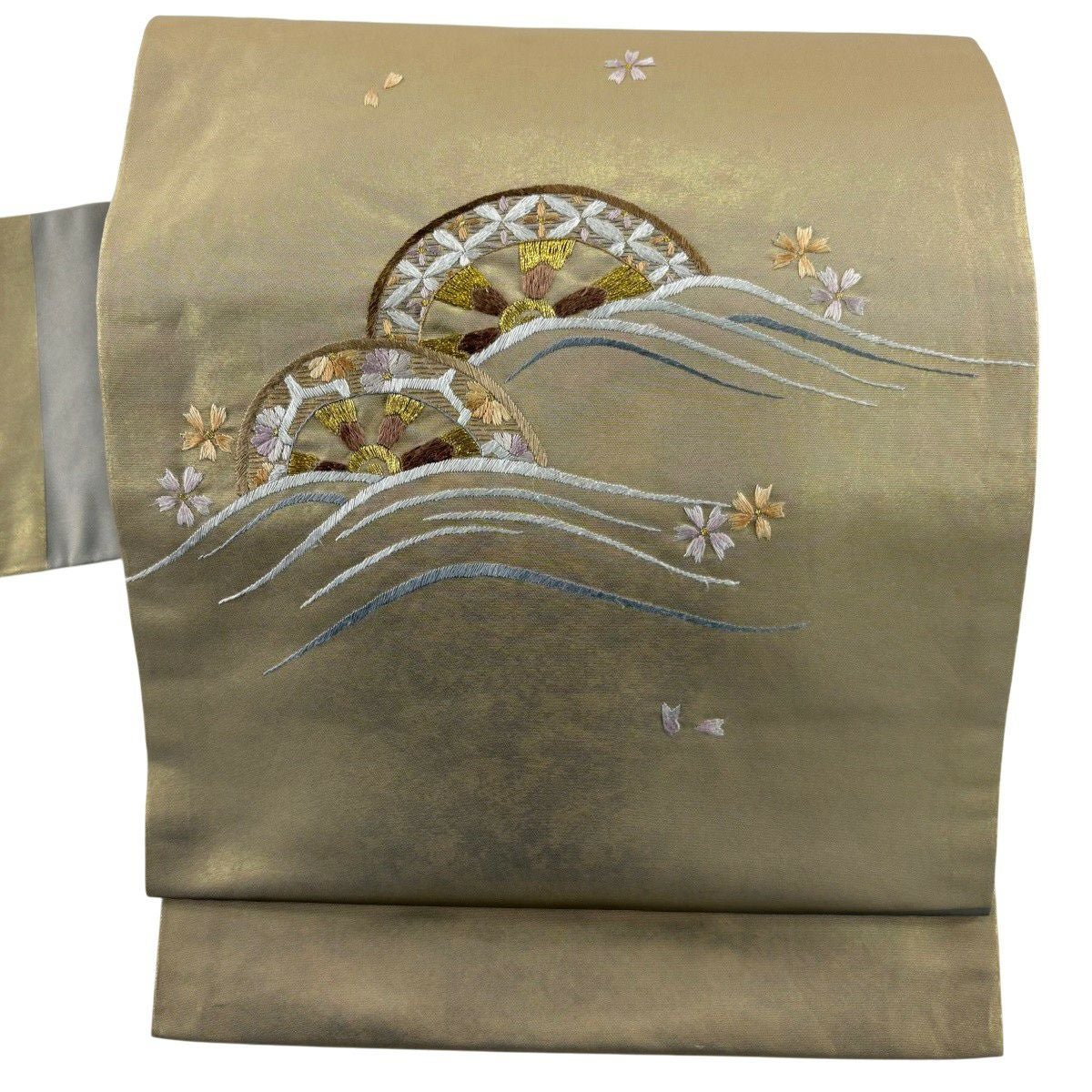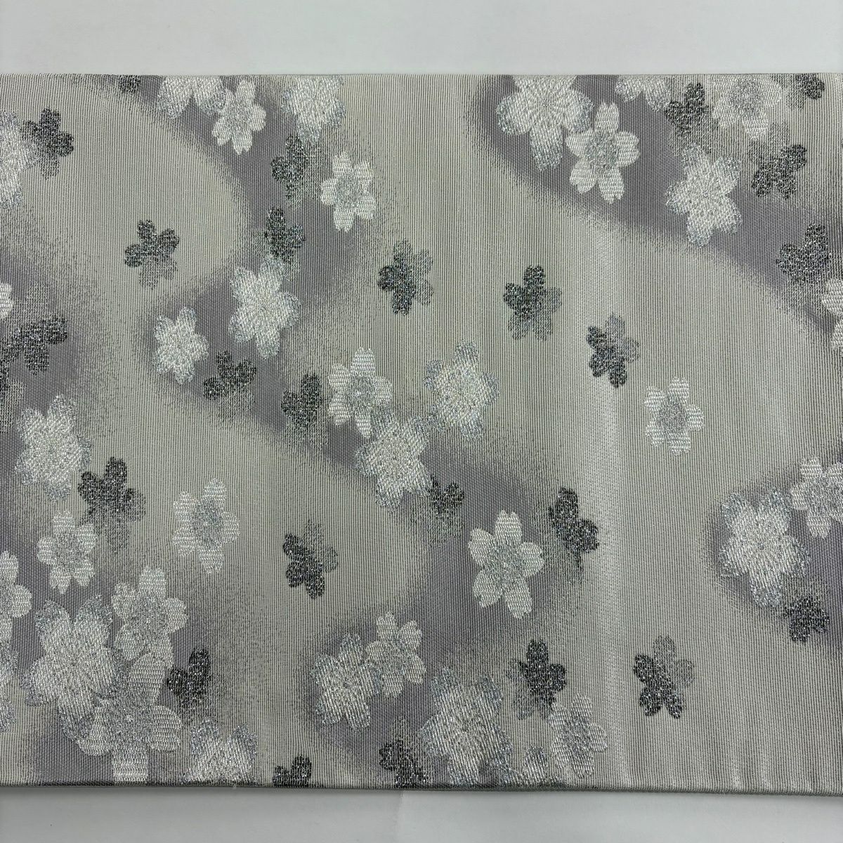 50%OFF 袋帯 秀品 桜 流水 銀糸 箔 灰白 六通 正絹 K50