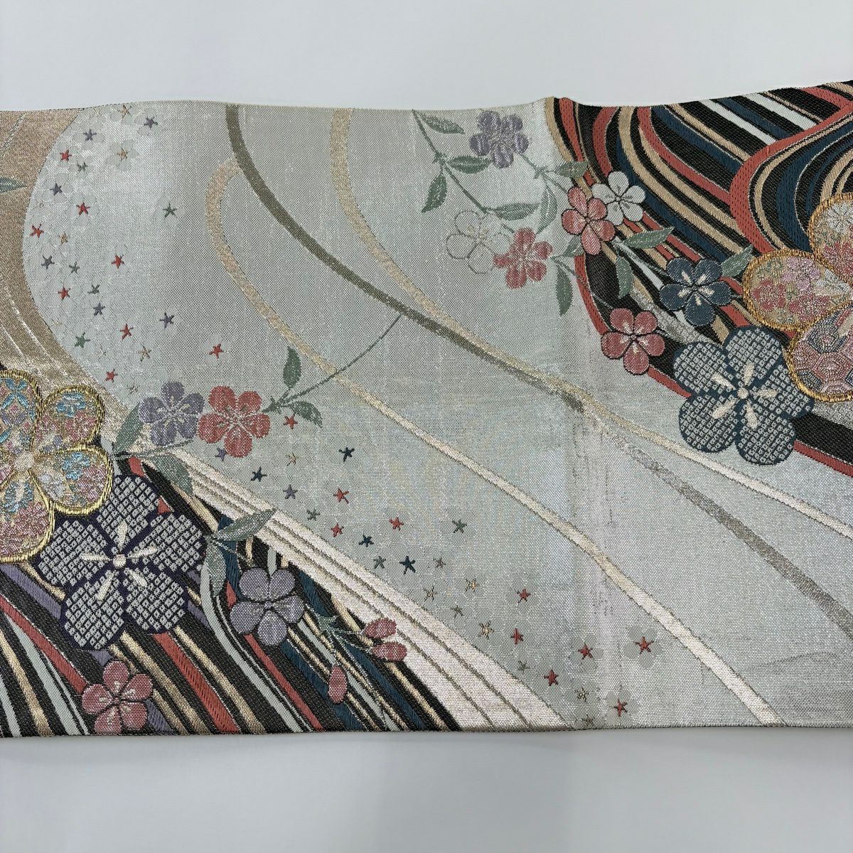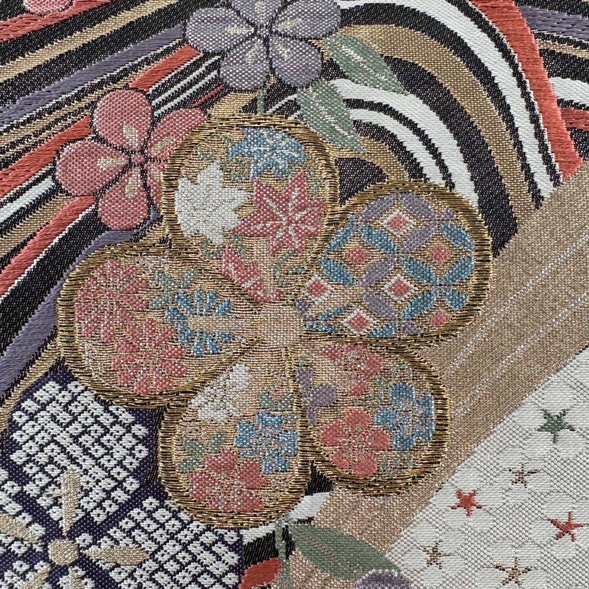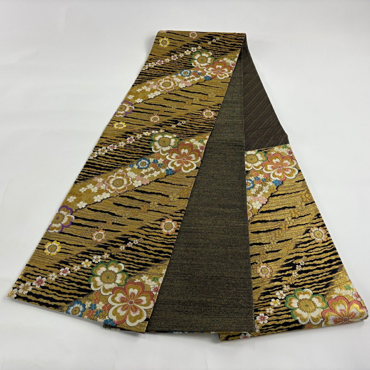 50%OFF 袋帯 秀品 草花 縞 金糸 墨色 お太鼓柄 正絹 K50