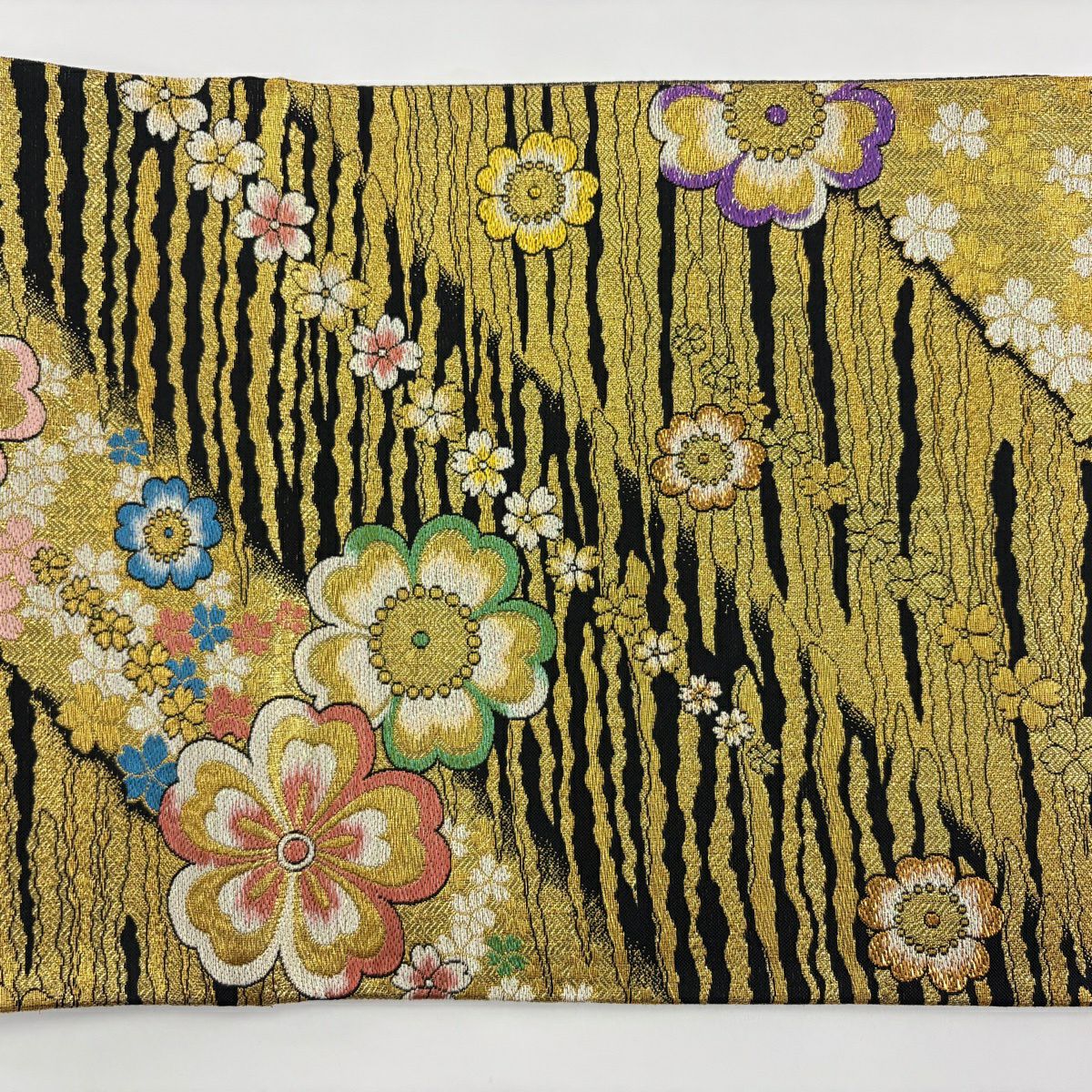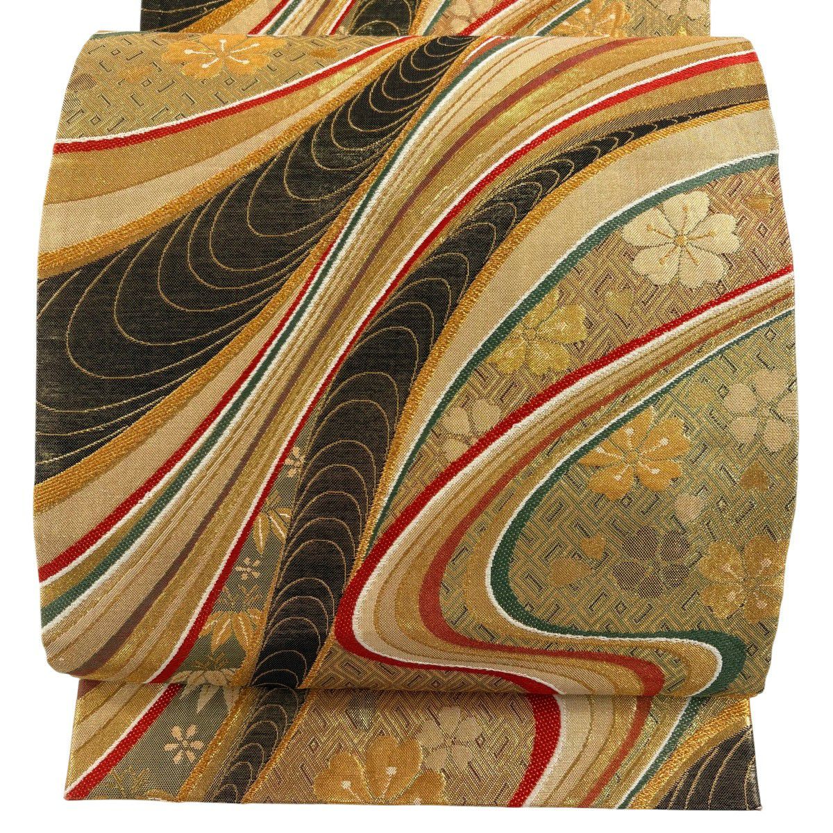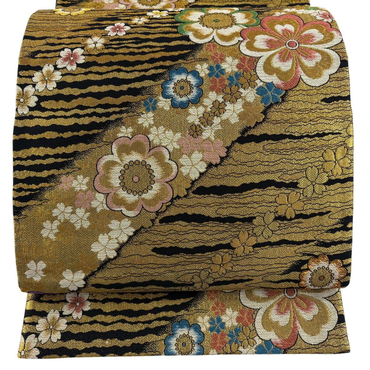 50%OFF 袋帯 秀品 草花 縞 金糸 墨色 お太鼓柄 正絹 K50
