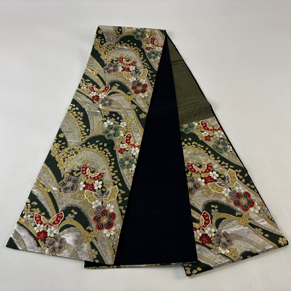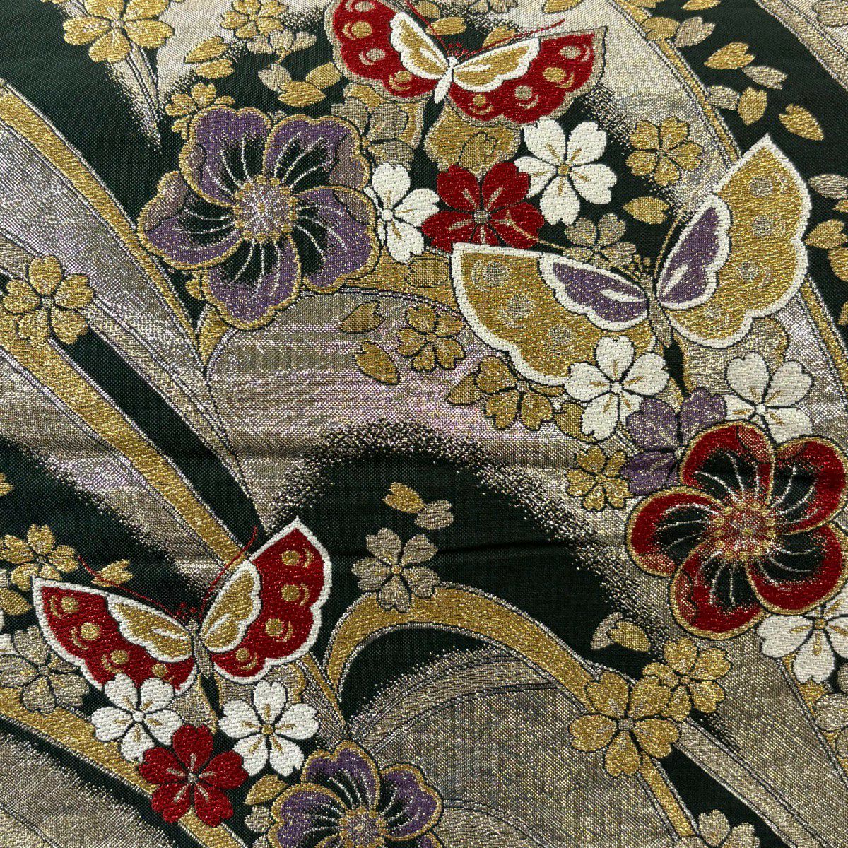 50%OFF 袋帯 秀品 蝶 桜 箔 金銀糸 深緑 六通 正絹 K50