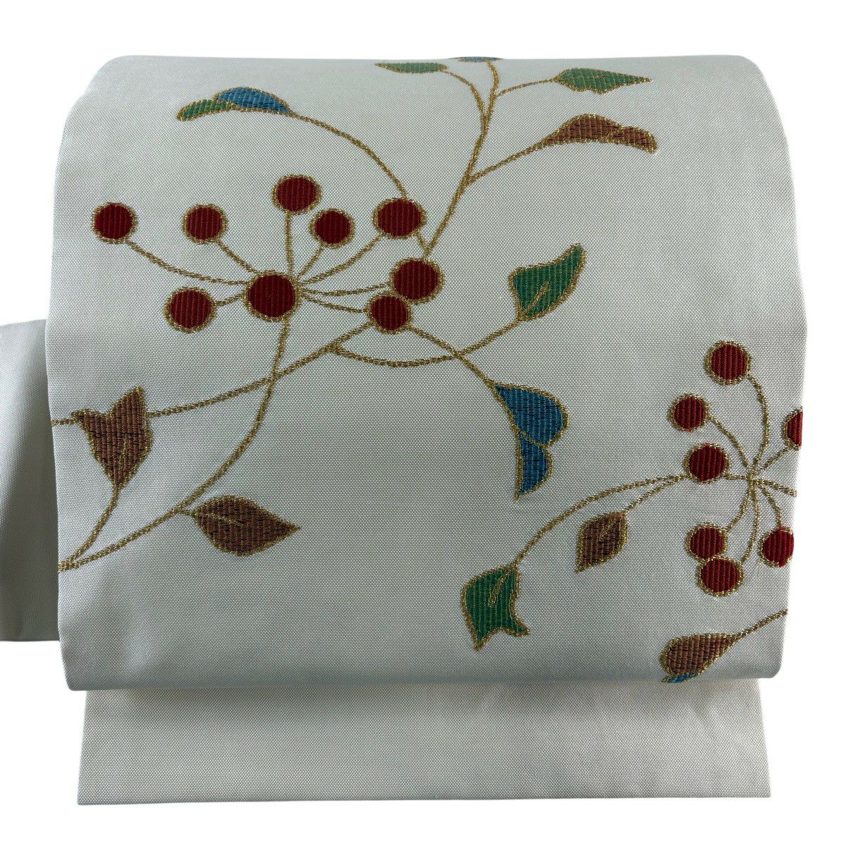 50%OFF 袋帯 秀品 葉と実 蜻蛉 青灰色 お太鼓柄 正絹 K50