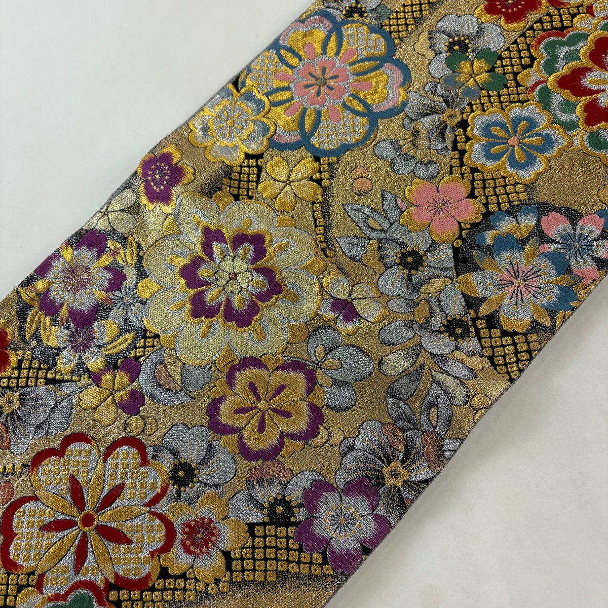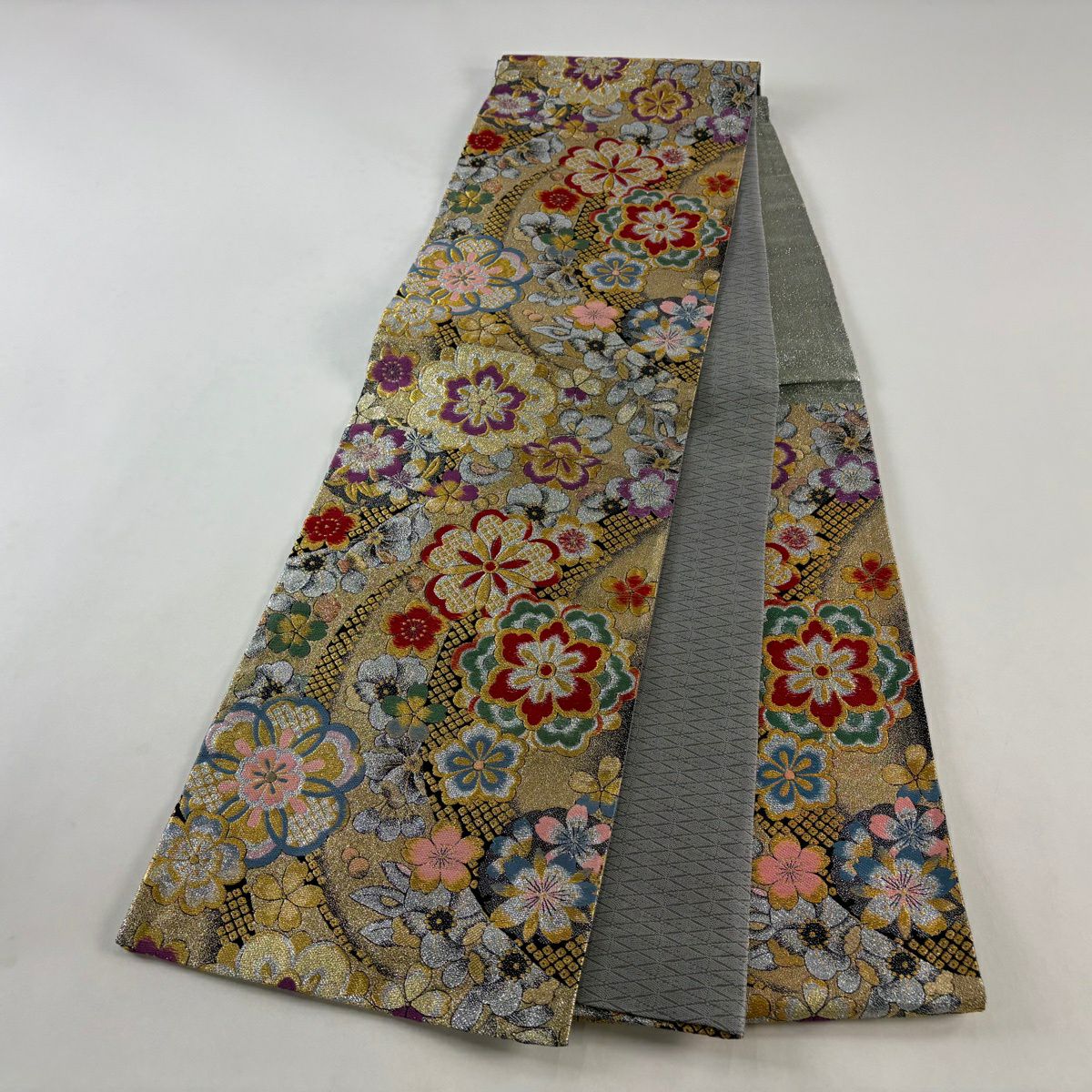 50%OFF 袋帯 秀品 桜 市松 箔 金糸 灰紫 全通 正絹 K50