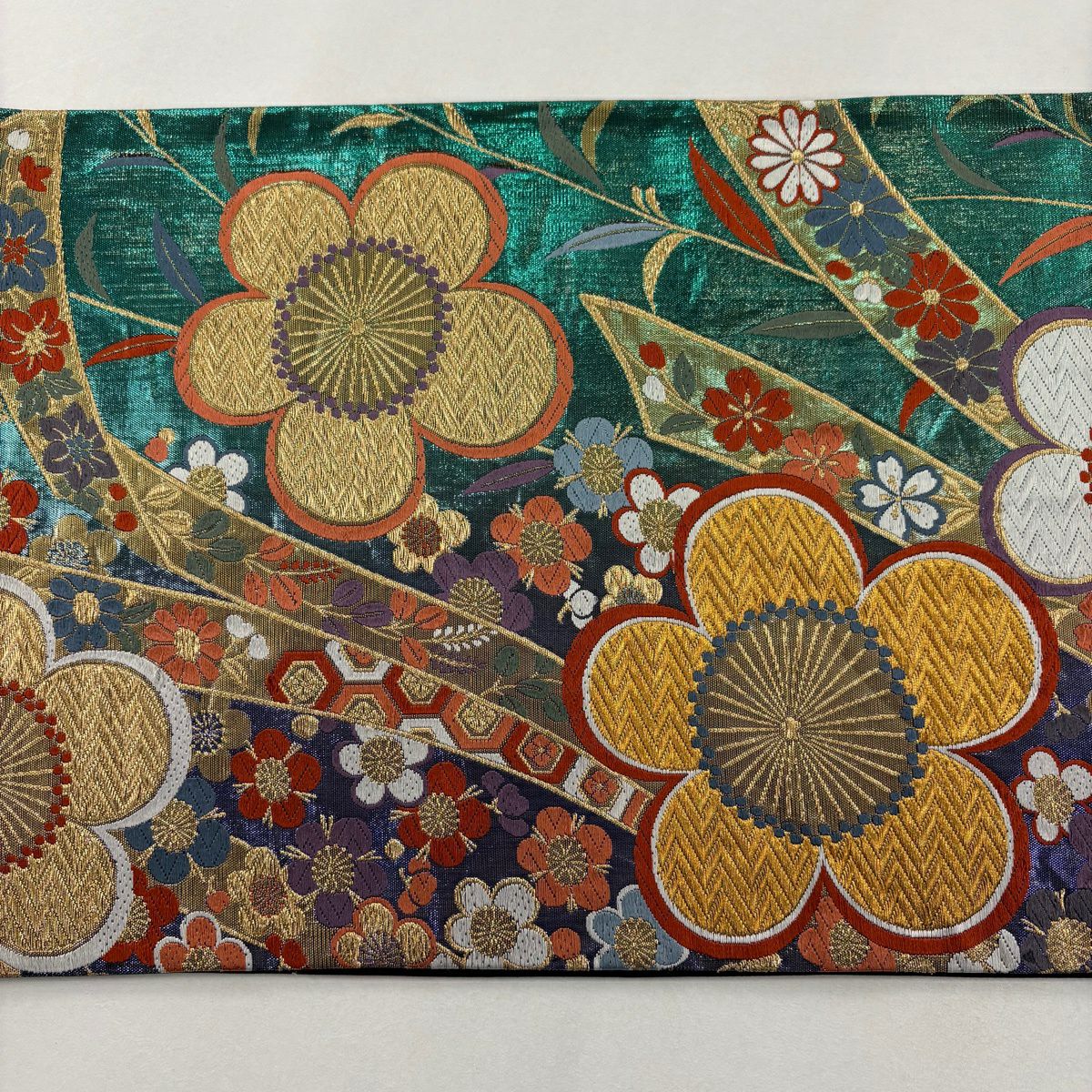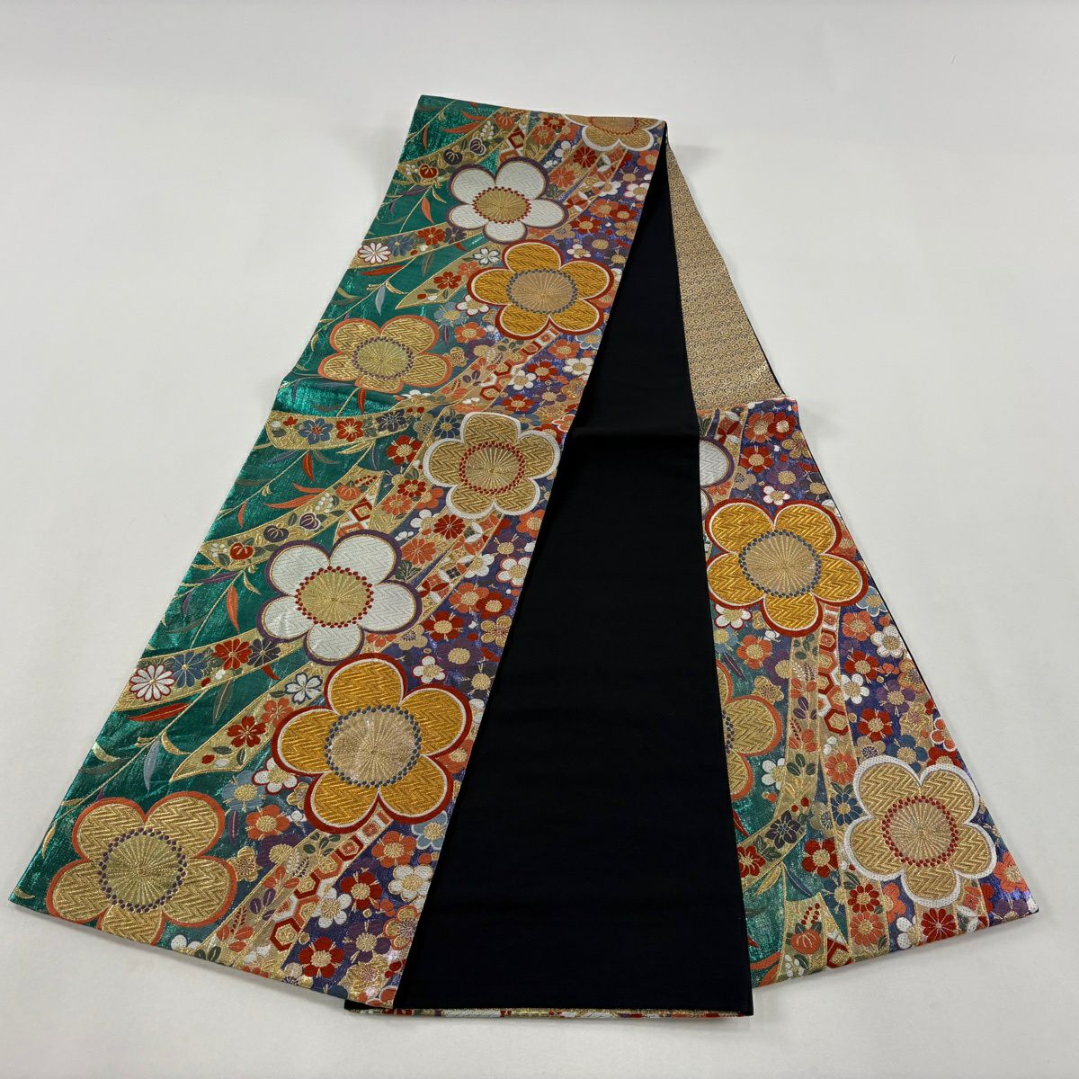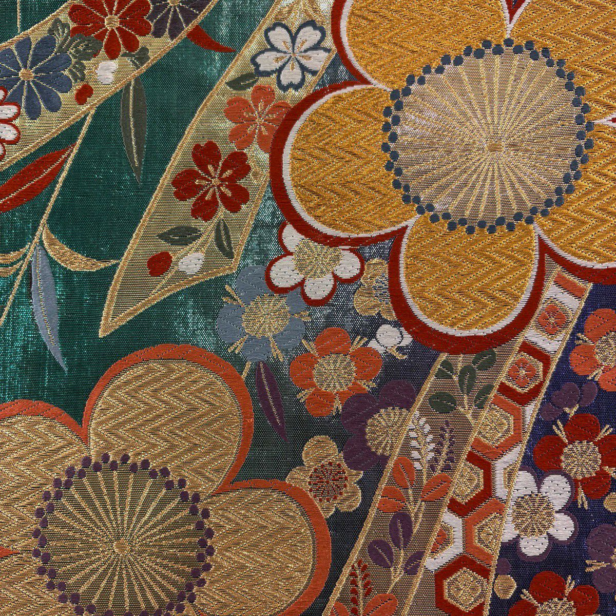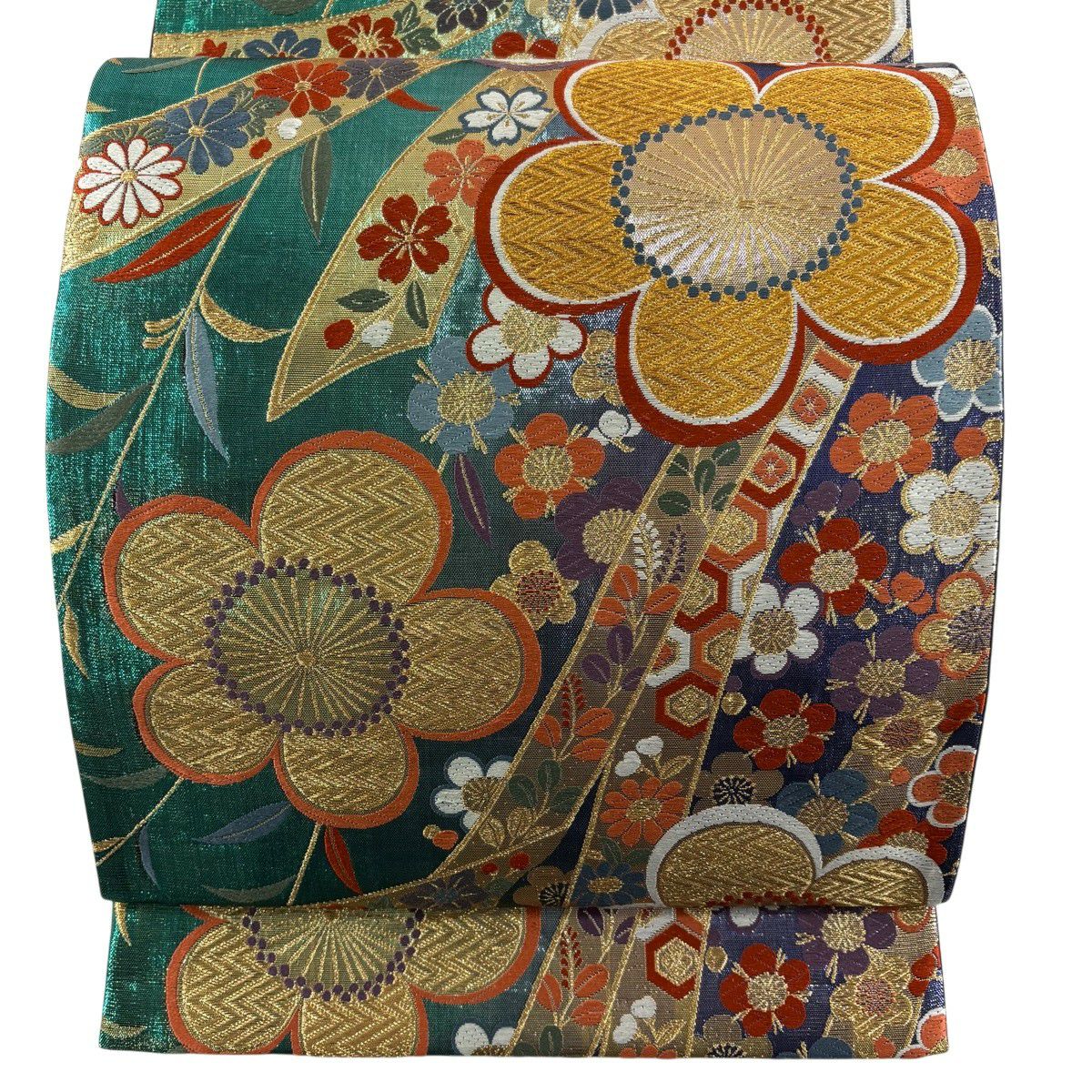 50%OFF 【美品】 袋帯 秀品 草花 箔 青緑 六通 正絹 K50