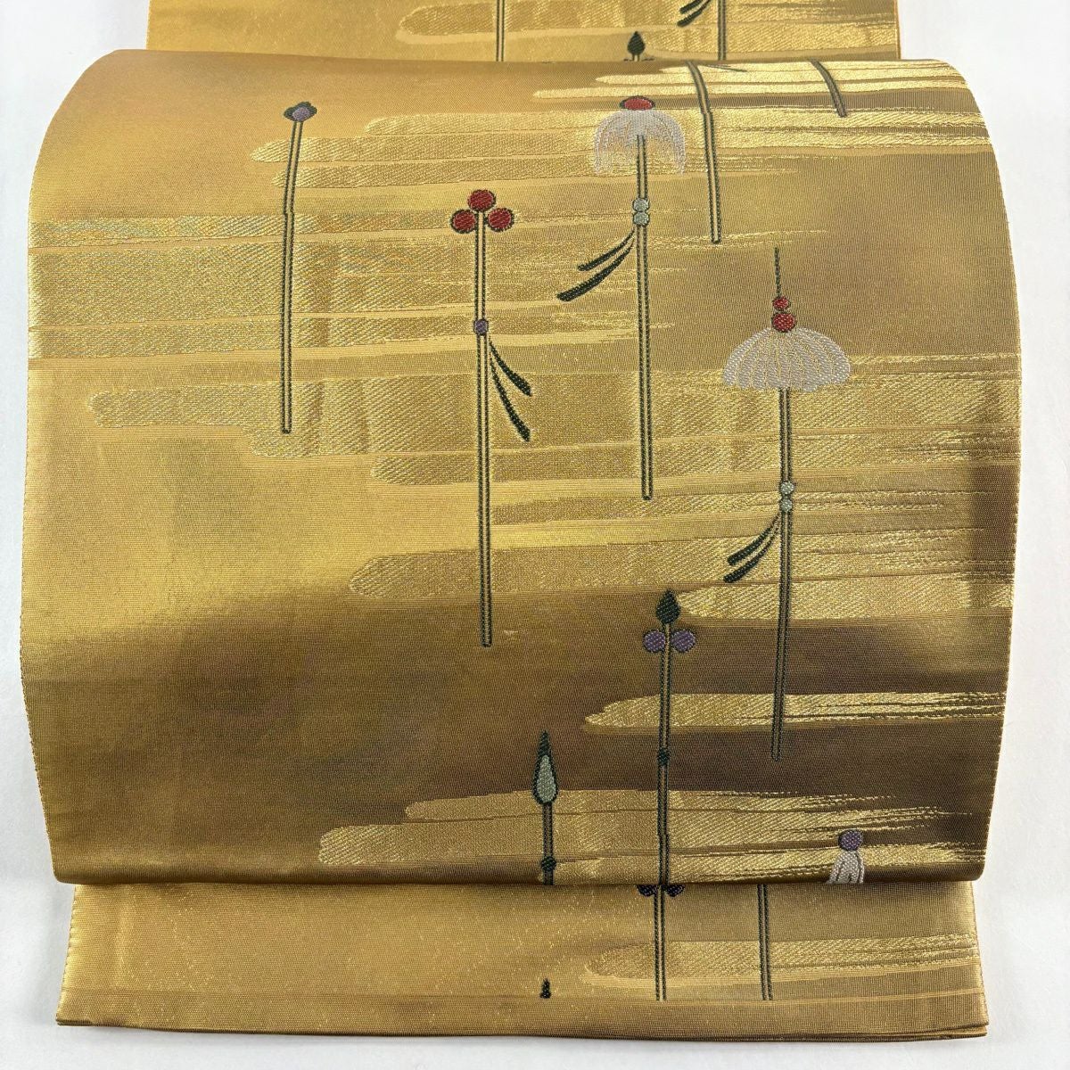 50%OFF 袋帯 秀品 草花 鳥 金銀糸 箔 金色 六通 正絹 K50