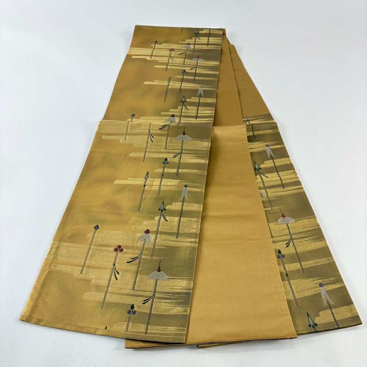 50%OFF 袋帯 秀品 草花 蝶 金銀糸 箔 金色 六通 正絹 K50