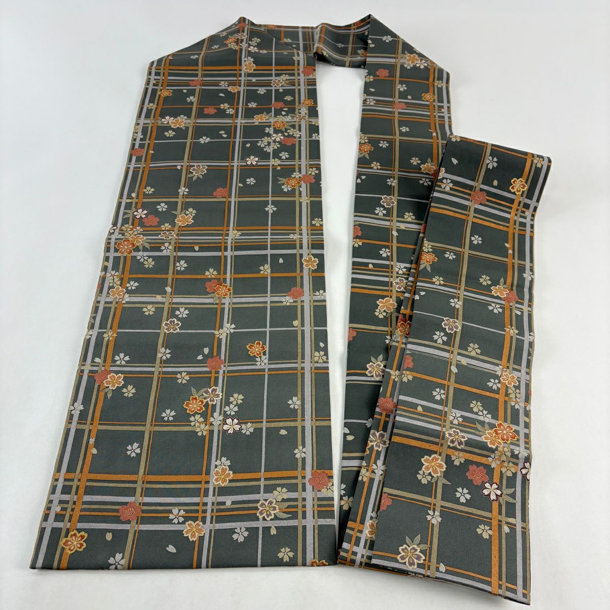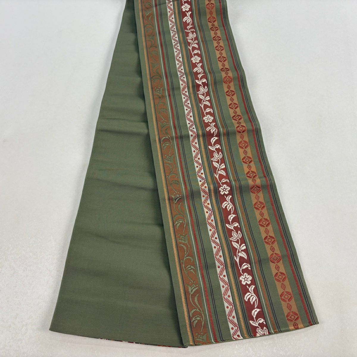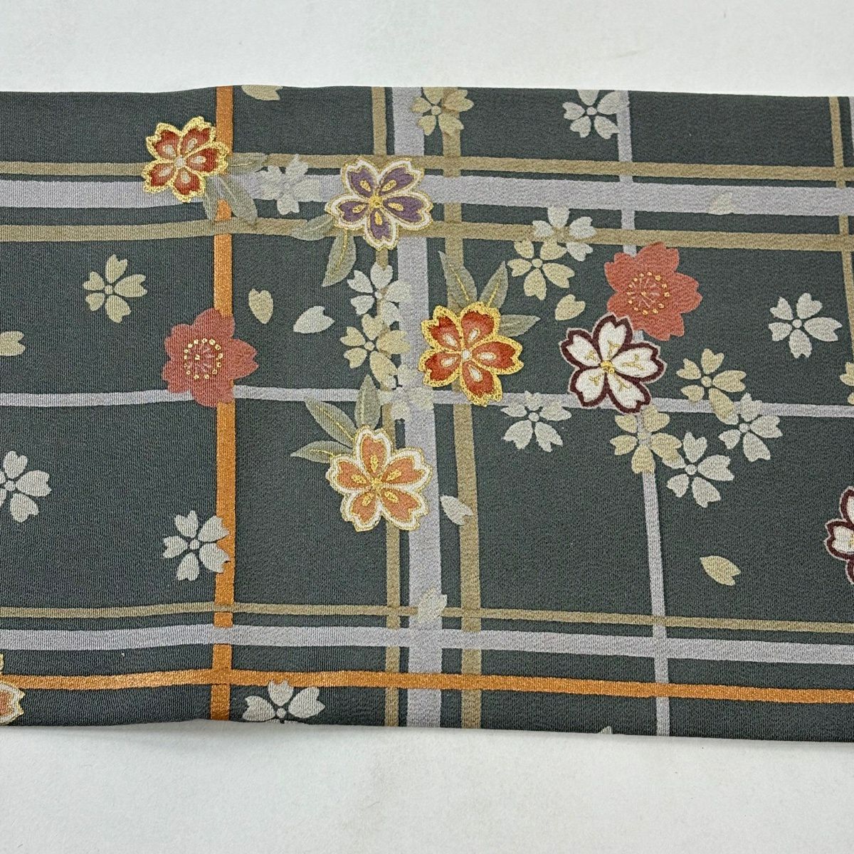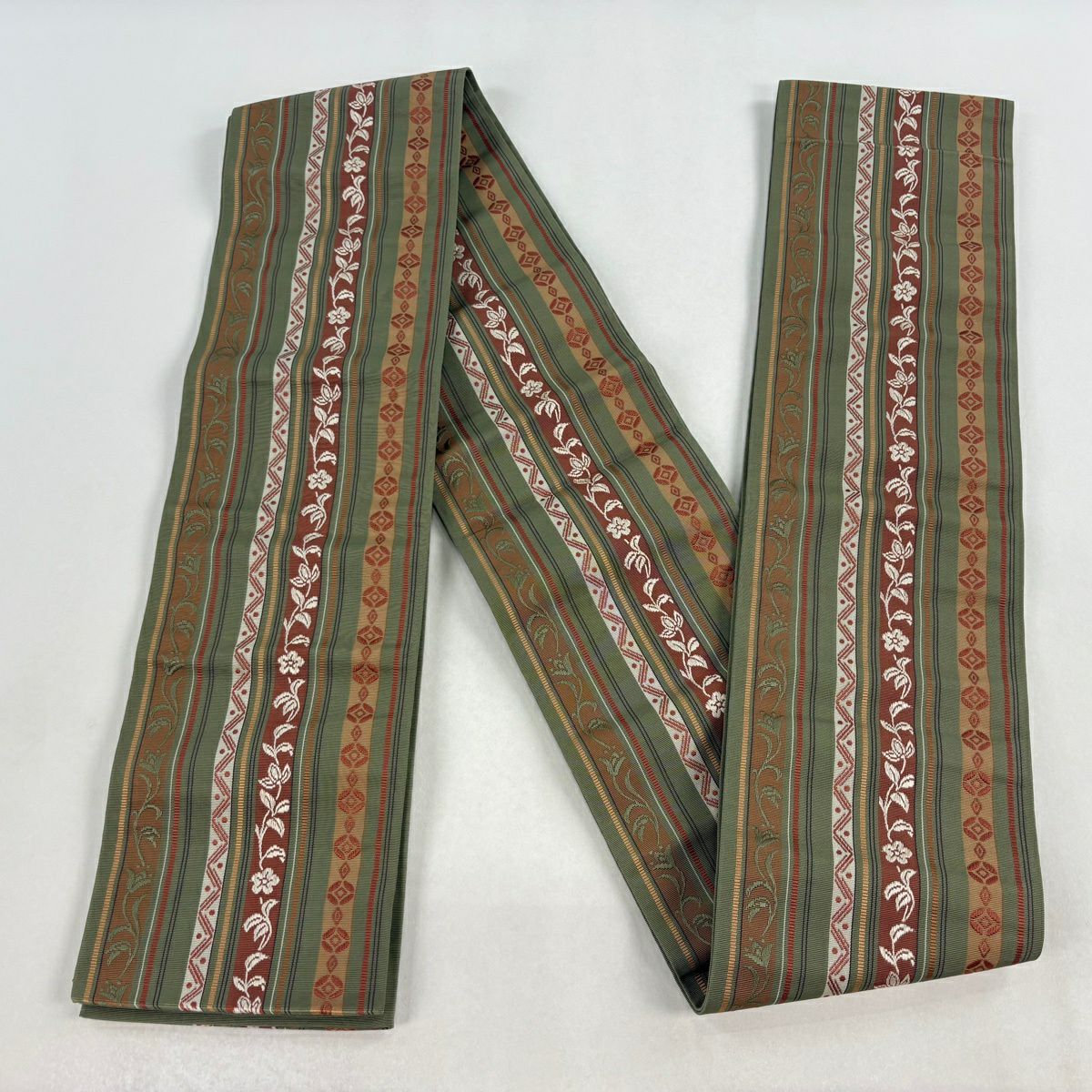 【美品】半幅帯 秀品 花柄 縞 灰緑 正絹