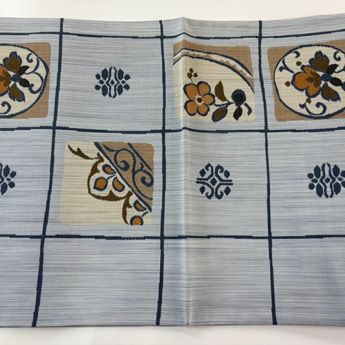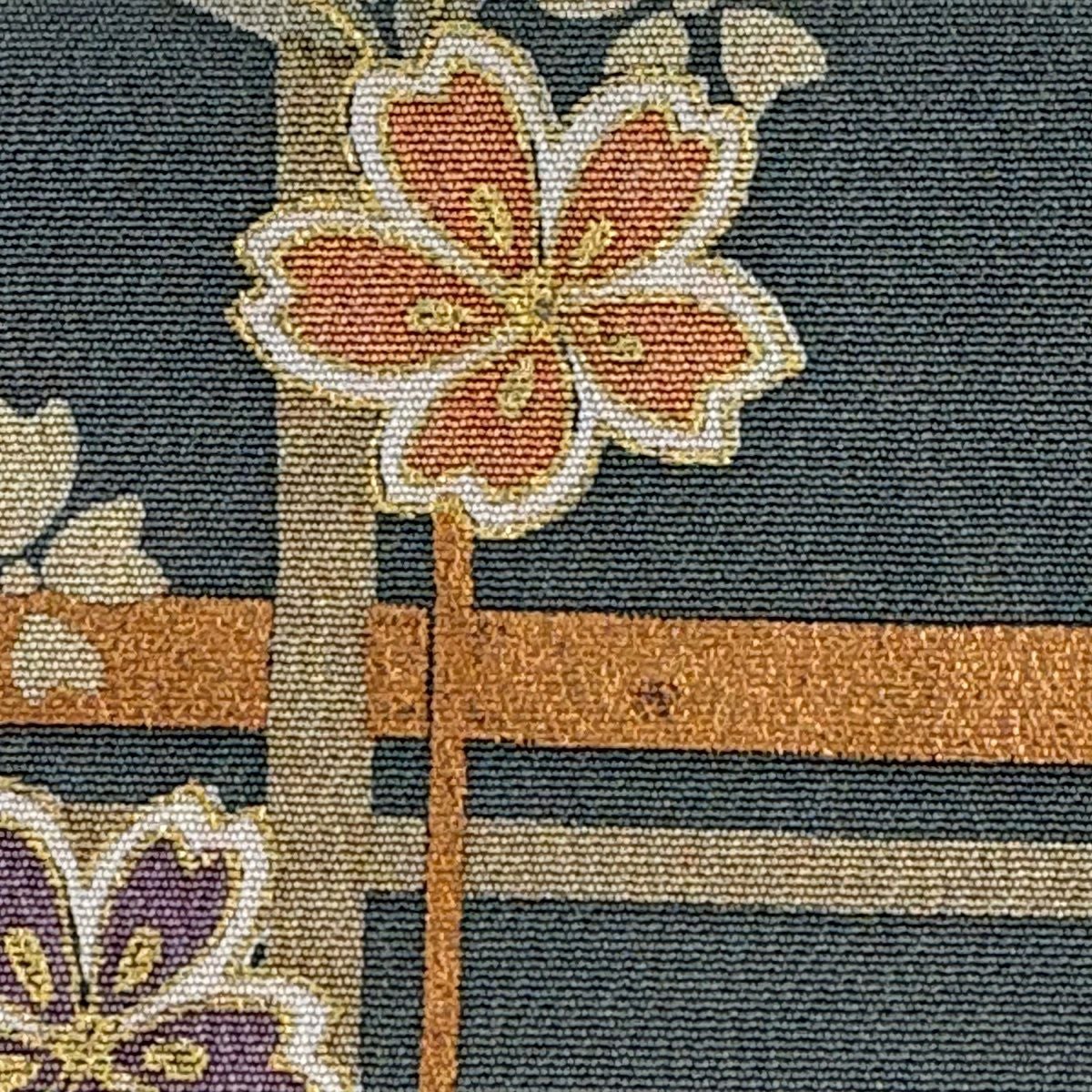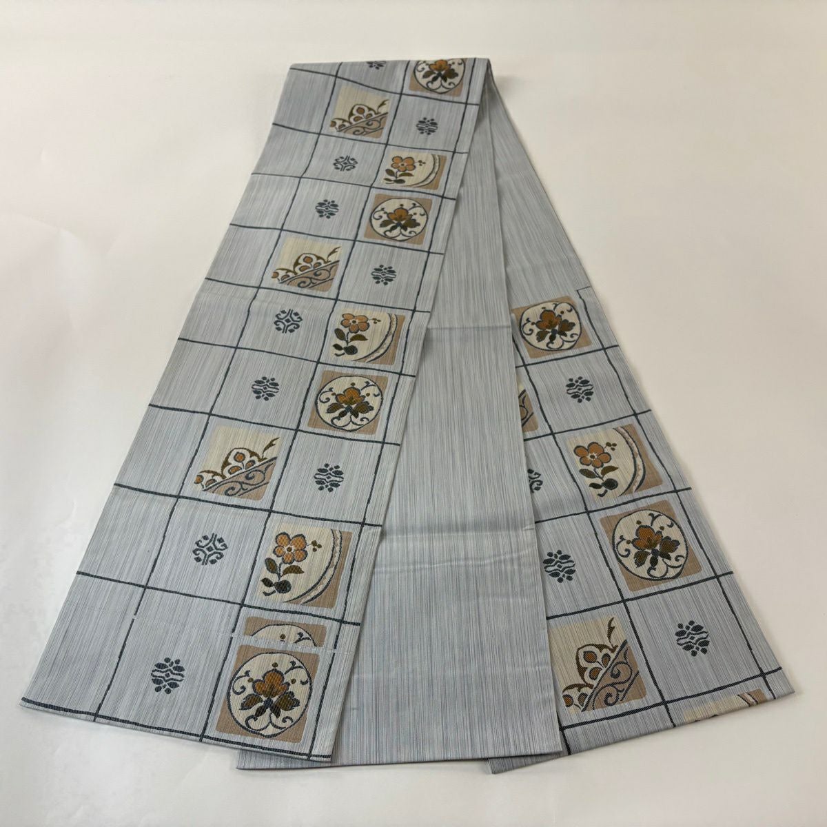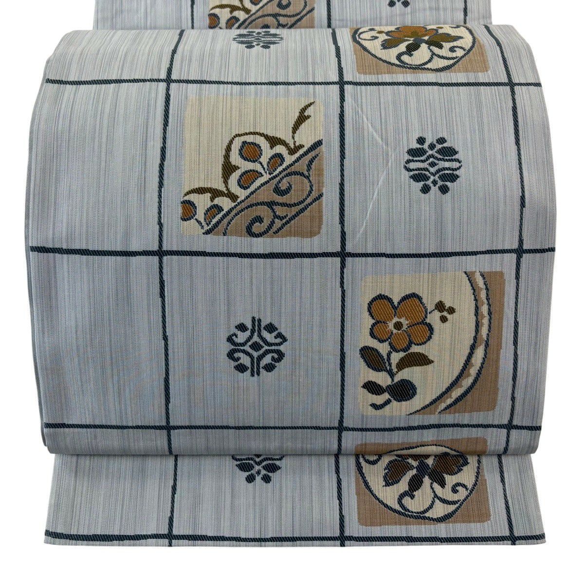 袋帯 秀品 格子 草花 青灰色 六通 正絹
