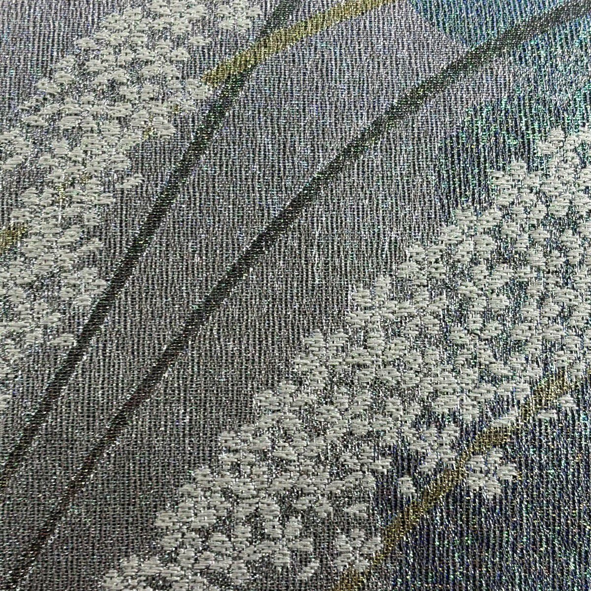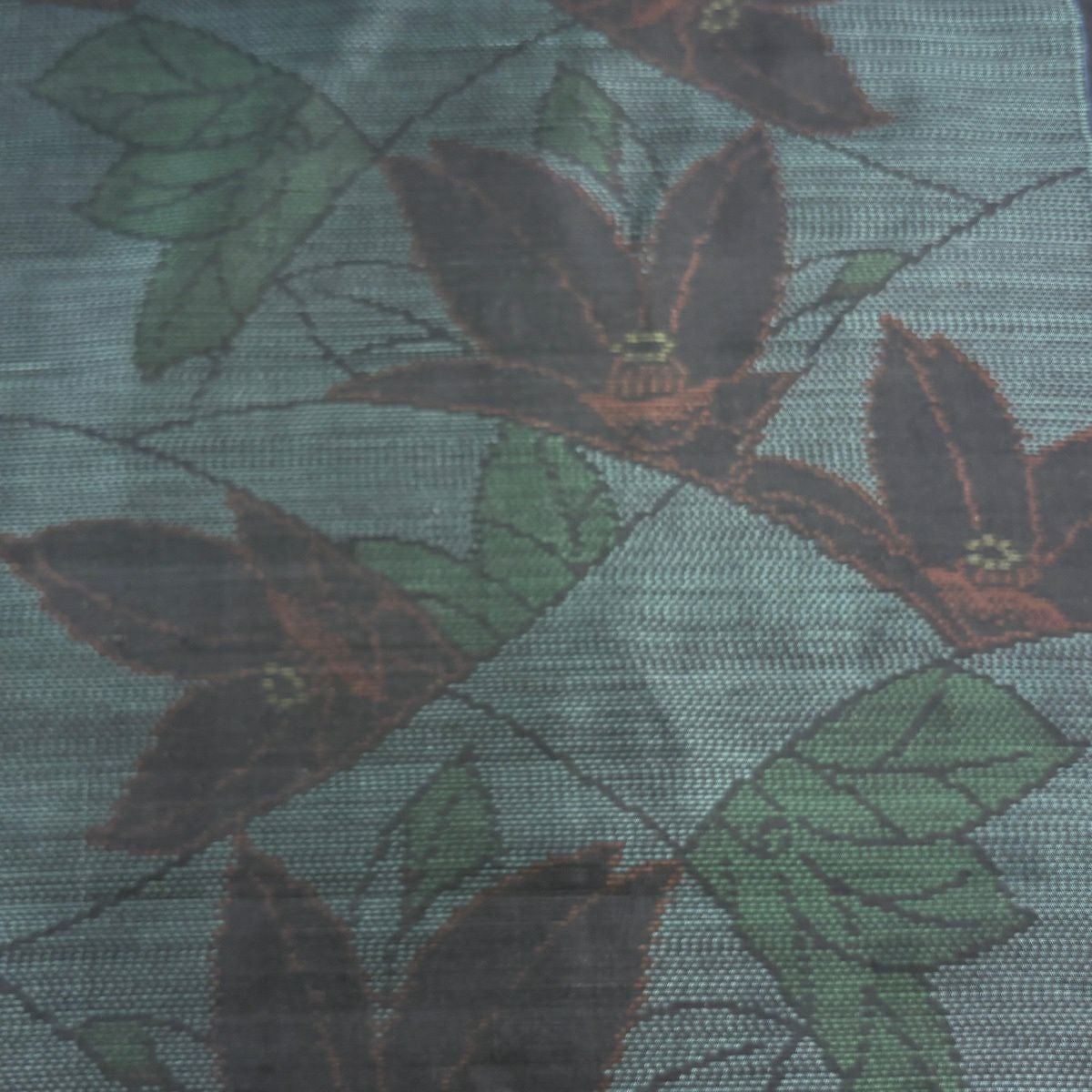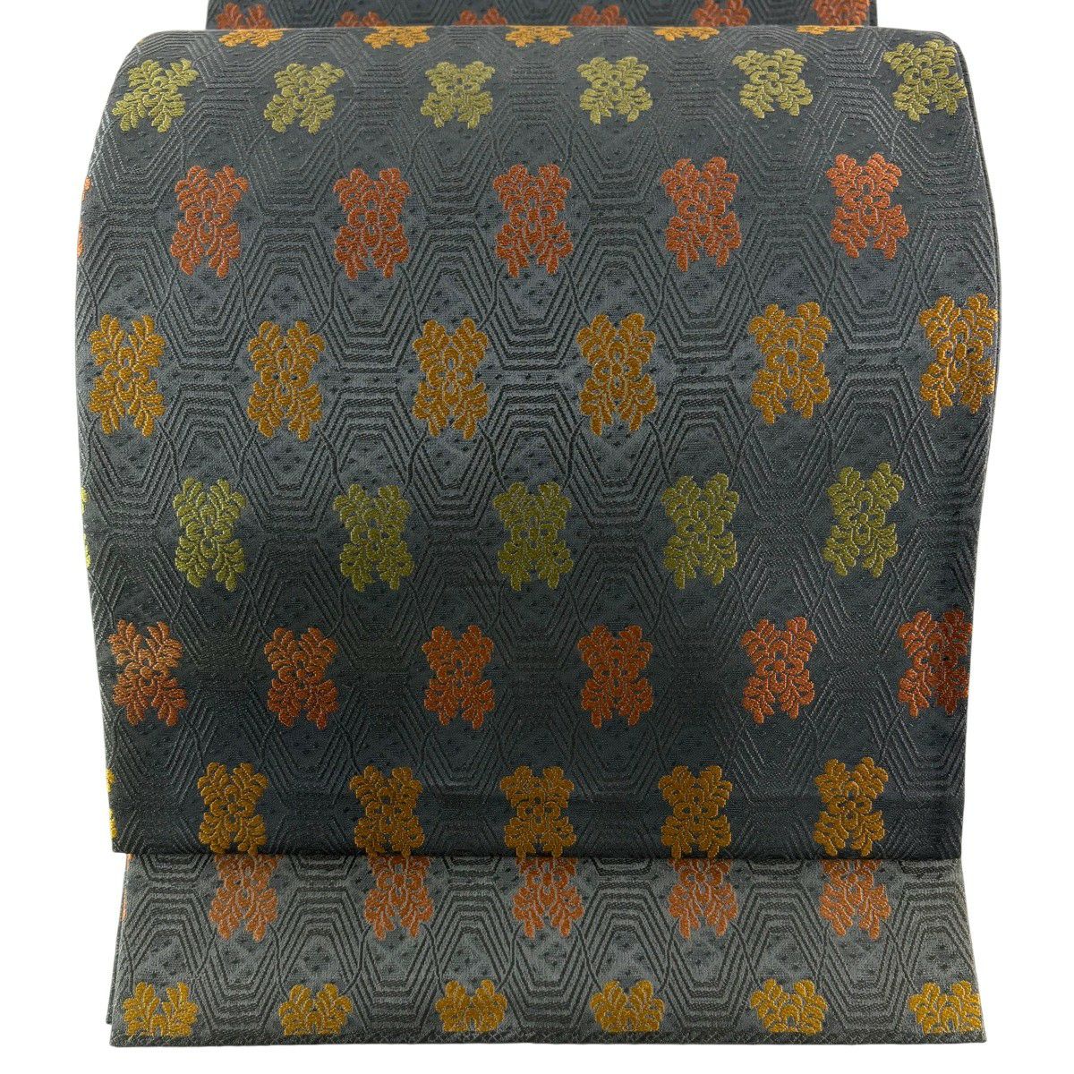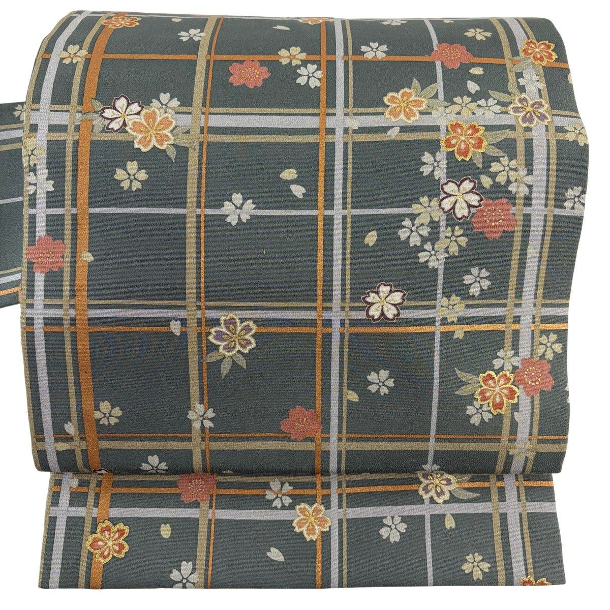 袋帯 秀品 格子 草花 青灰色 六通 正絹