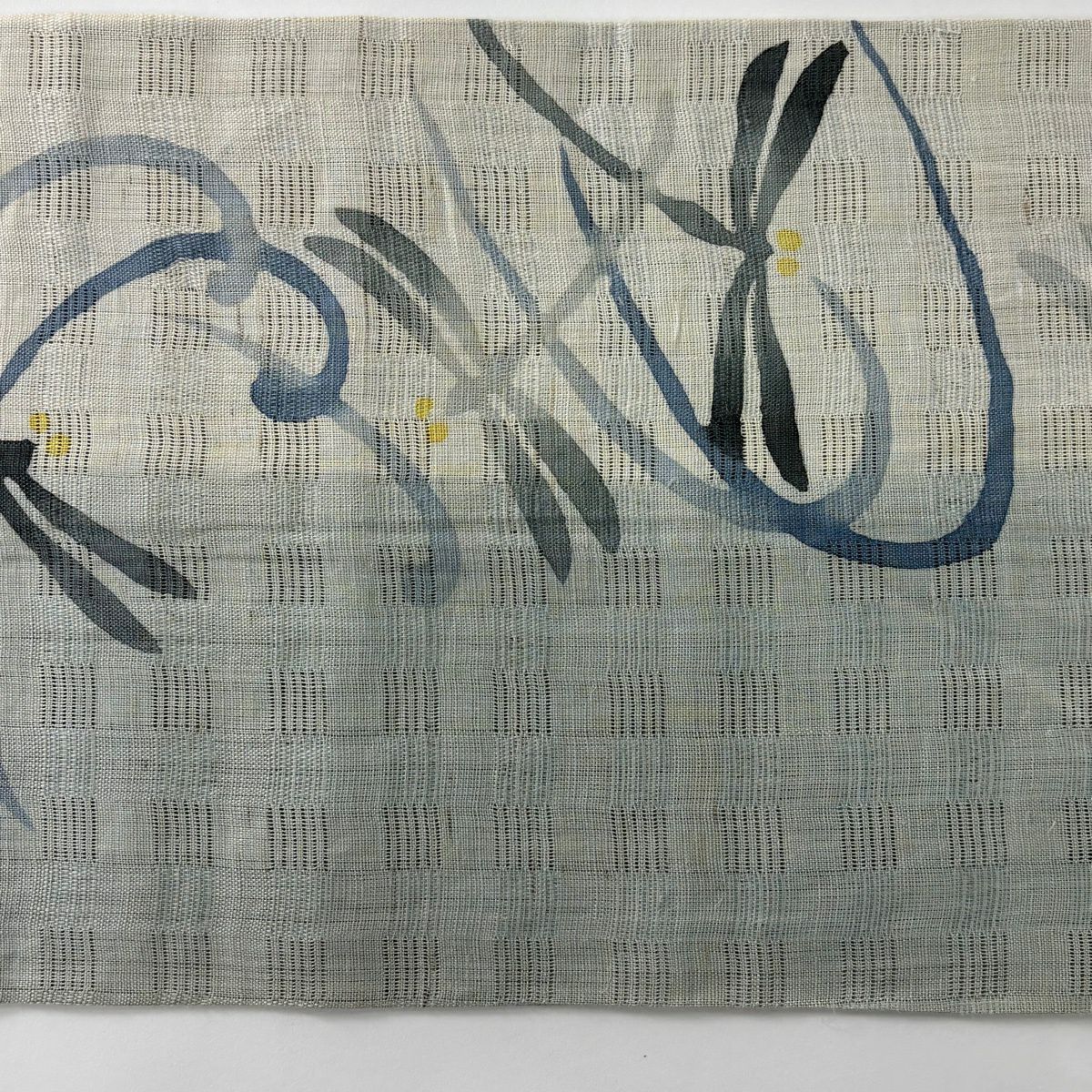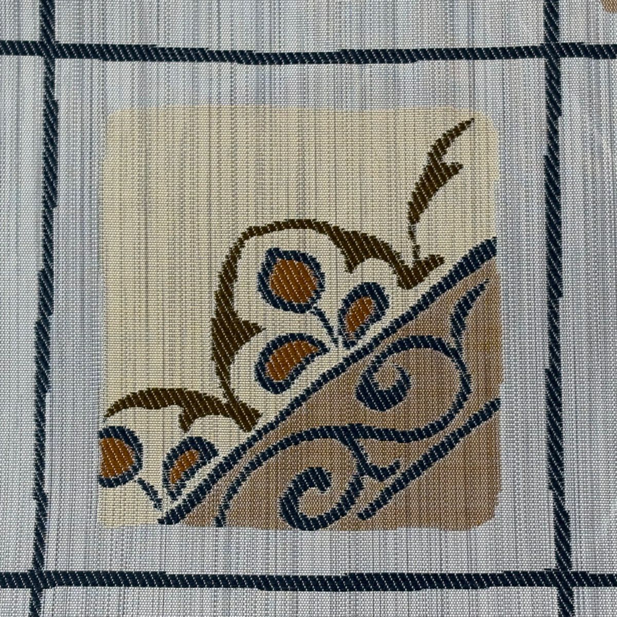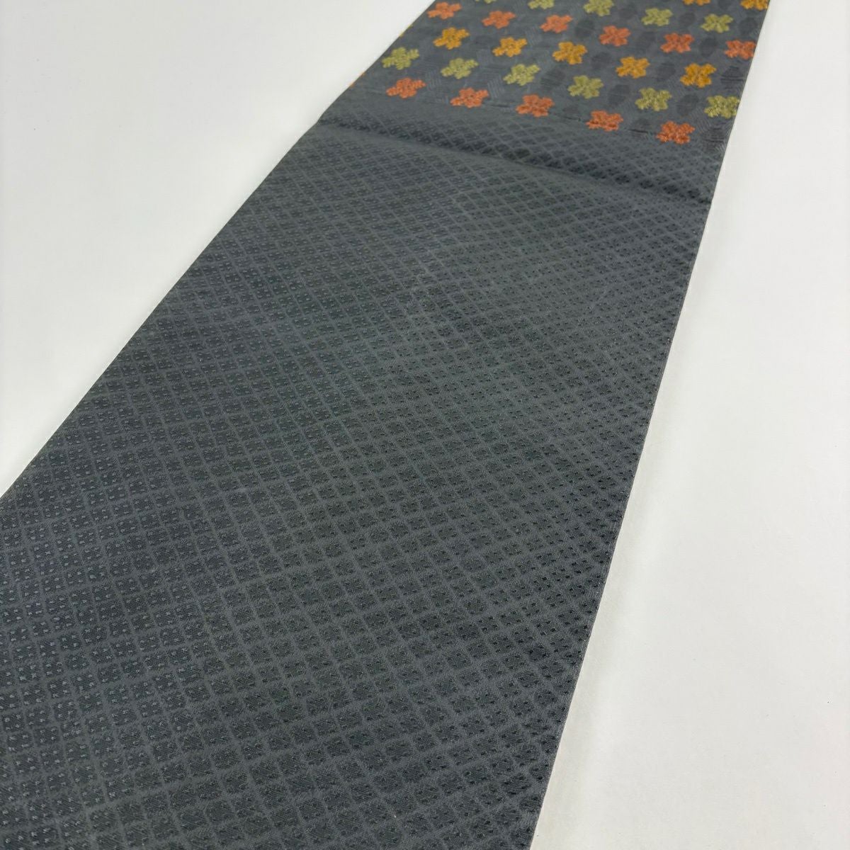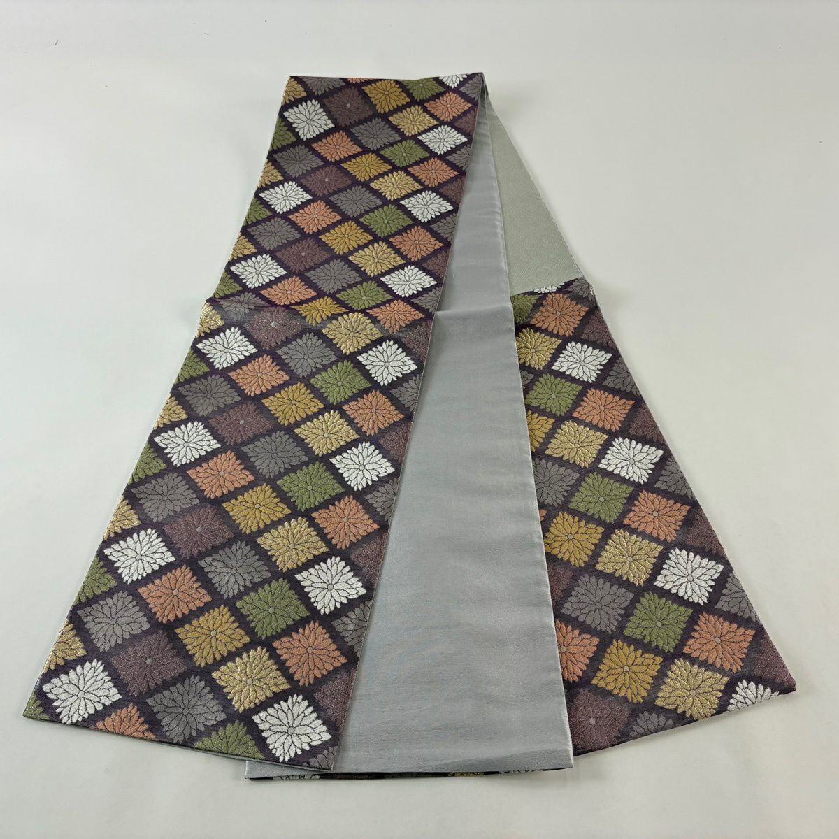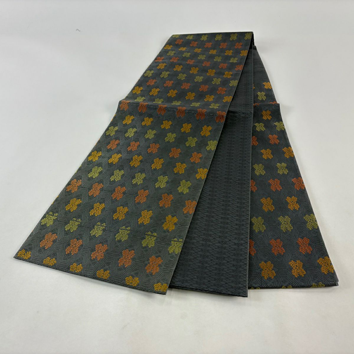 袋帯 秀品 格子 草花 青灰色 六通 正絹