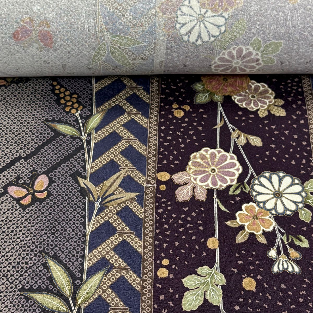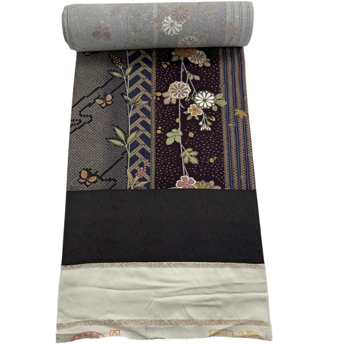 反物 秀品 小紋 菊 蝶 金彩 濃紫 正絹