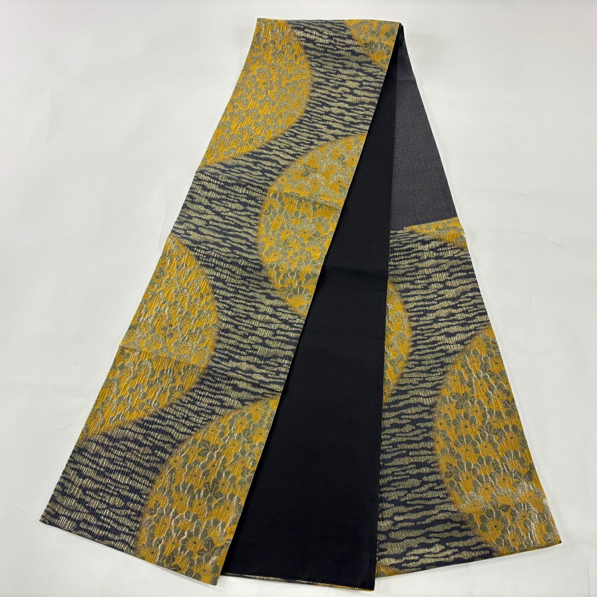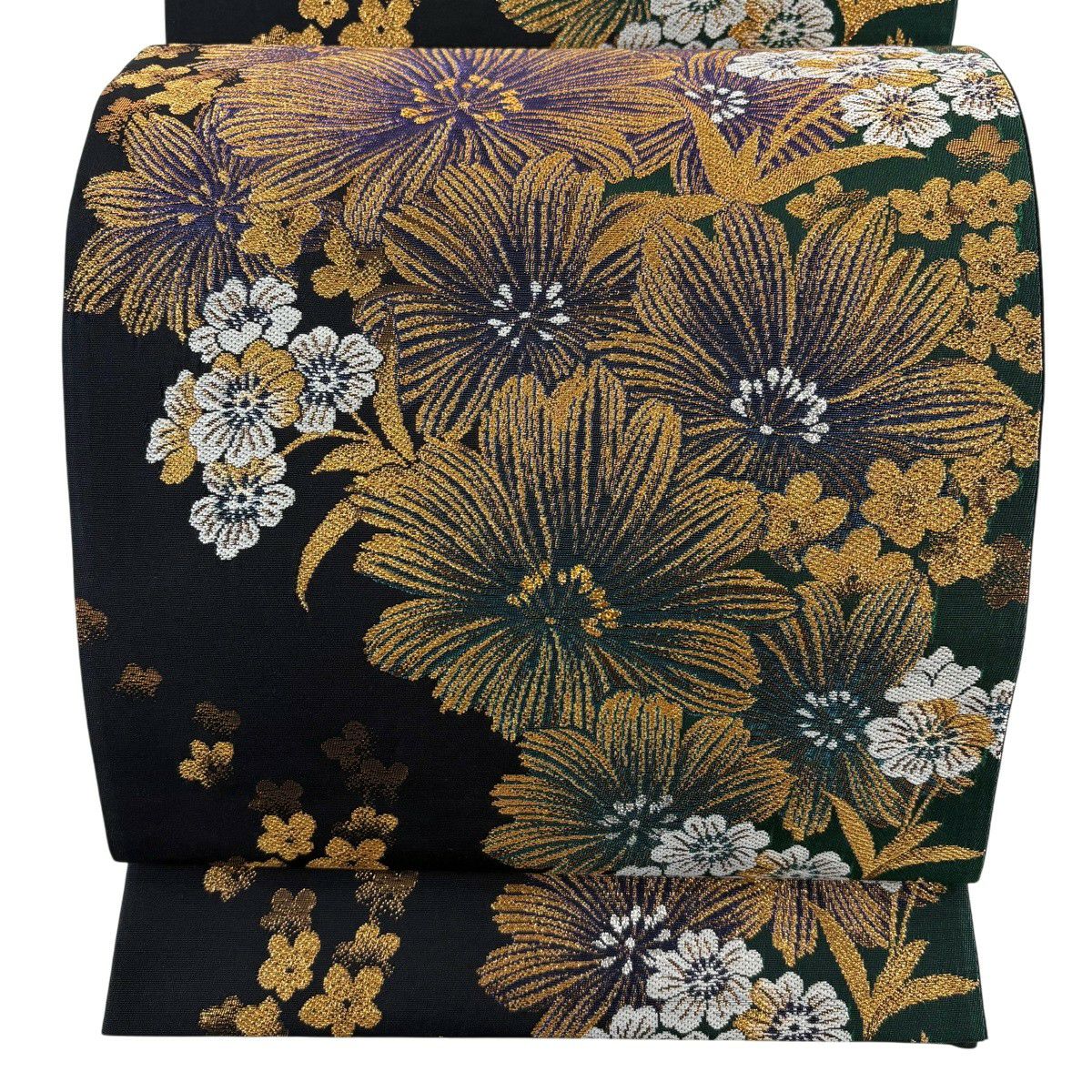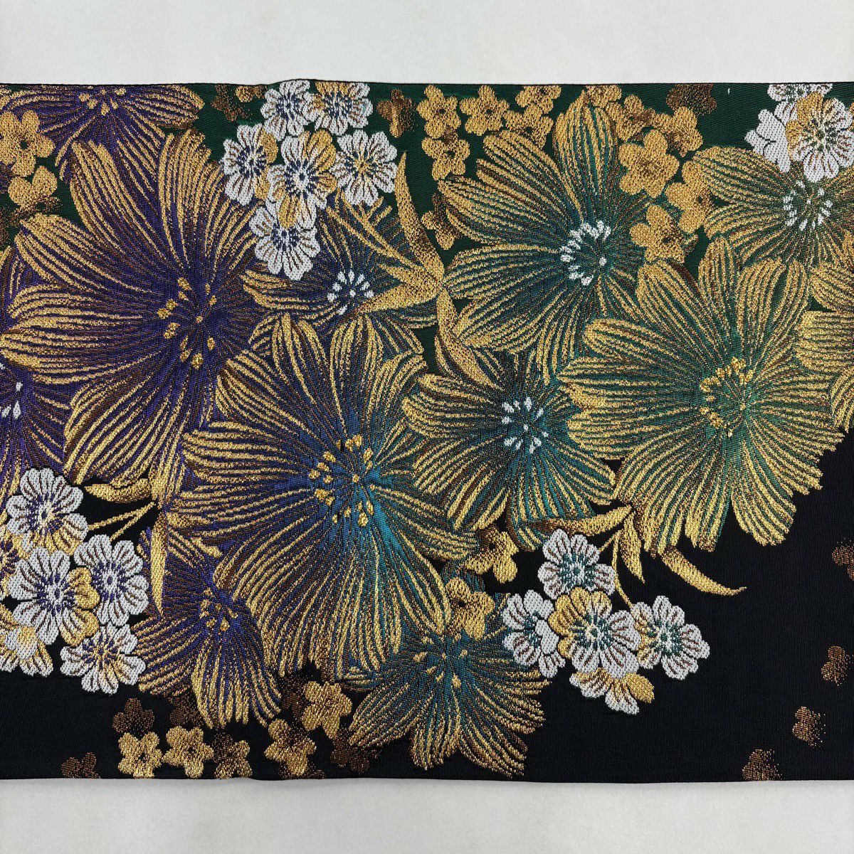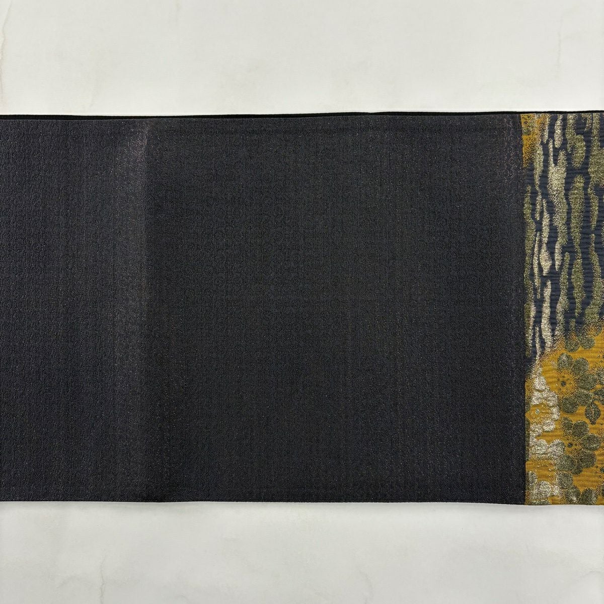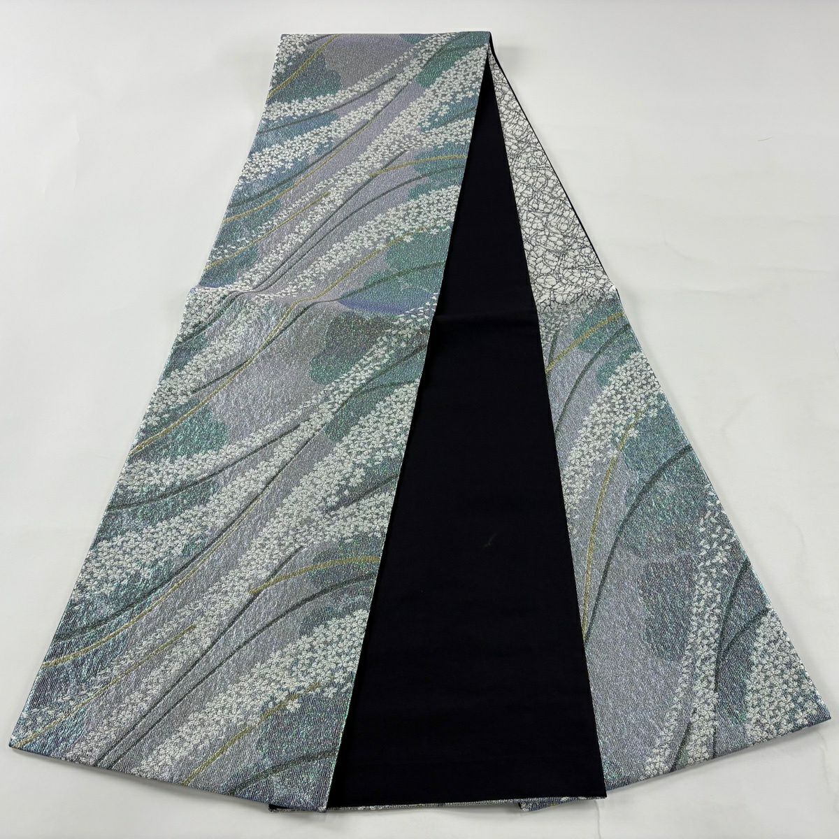 袋帯 秀品 枝花 波 箔 墨色 全通 正絹