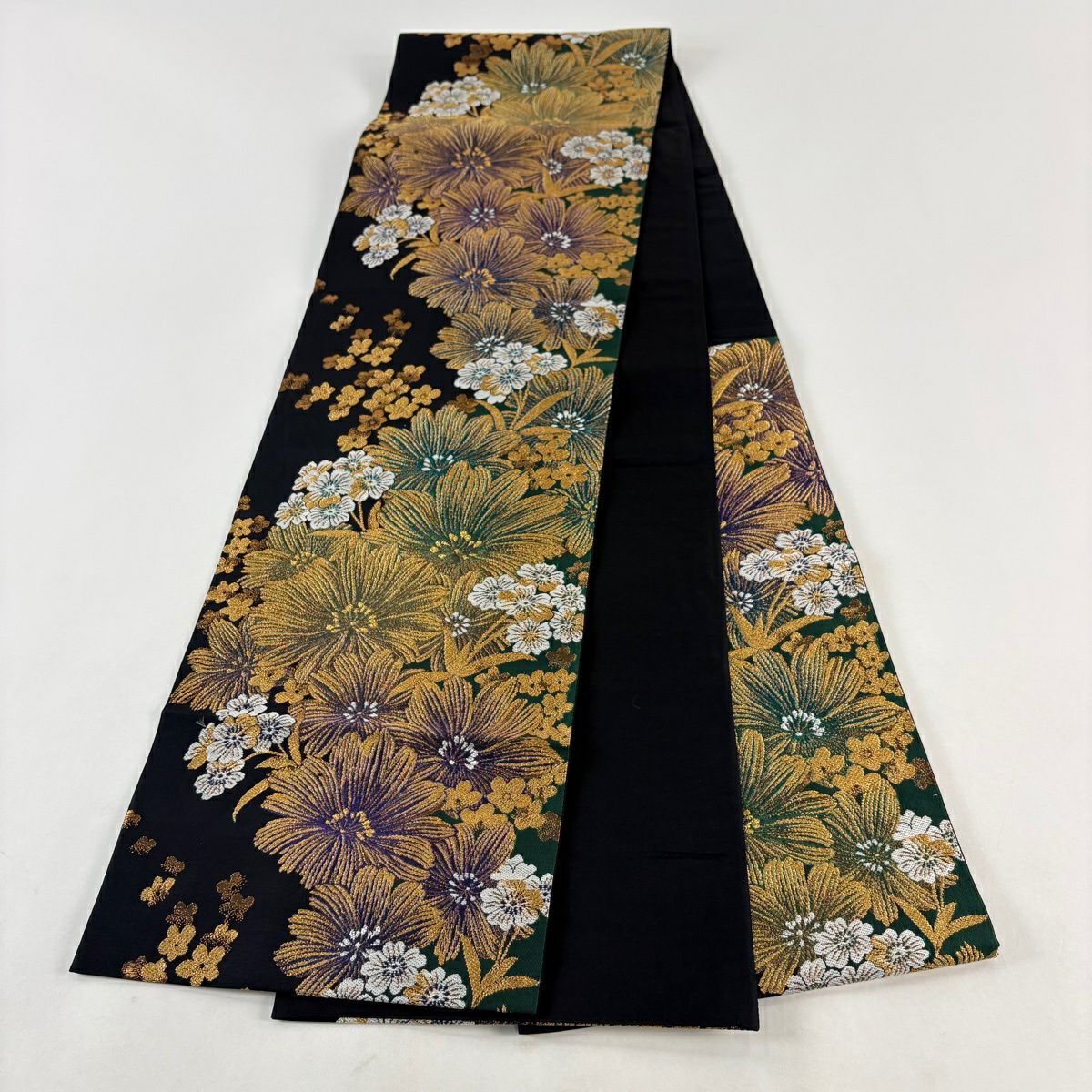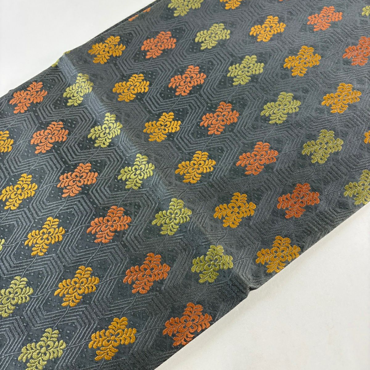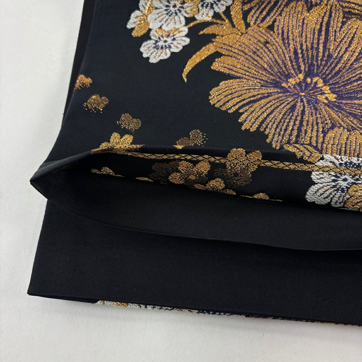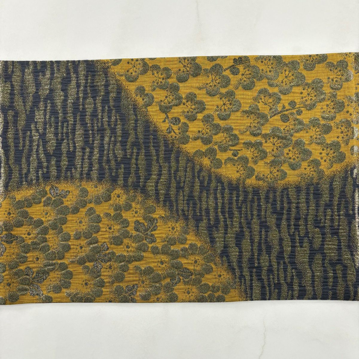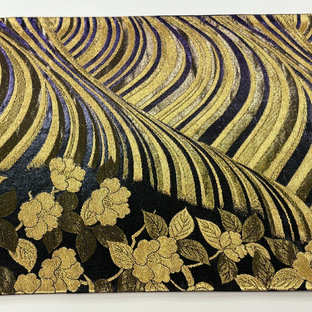 袋帯 秀品 枝花 波 箔 墨色 全通 正絹