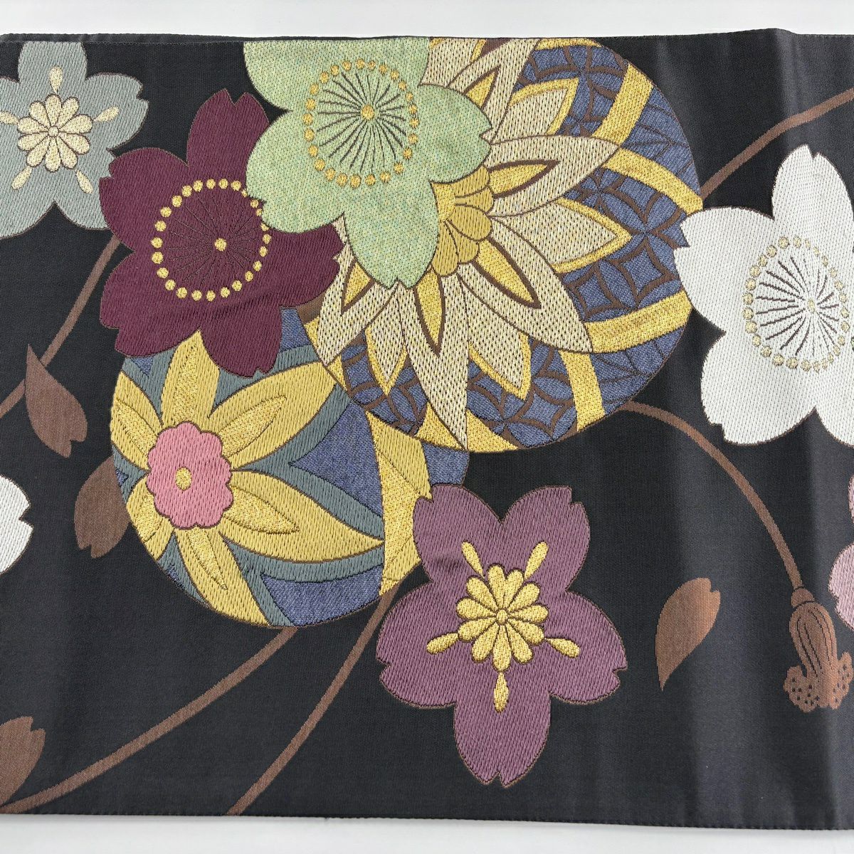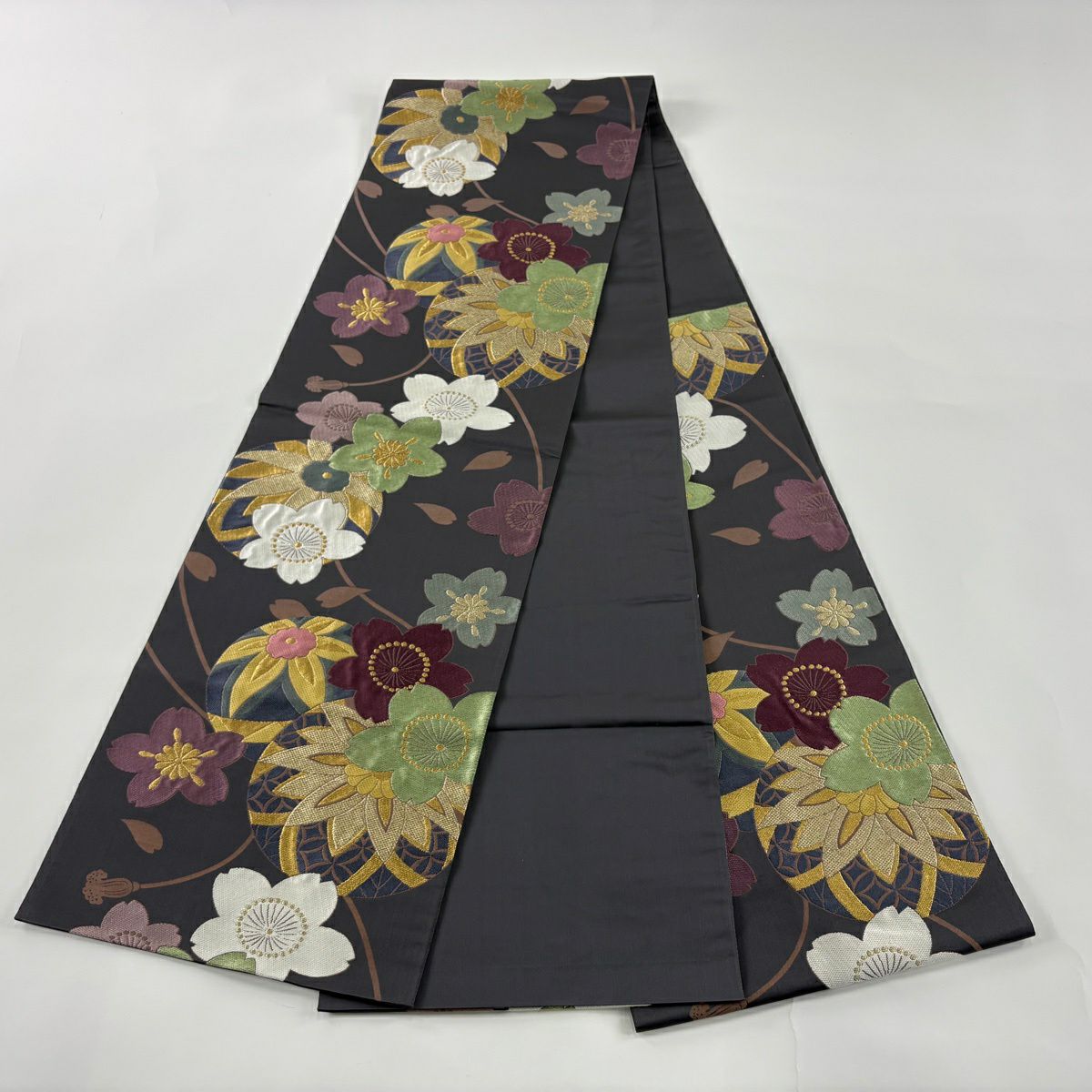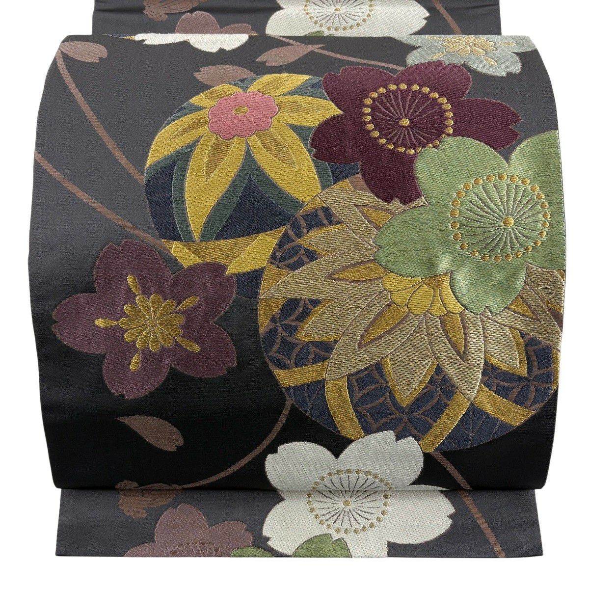 袋帯 秀品 桜 鞠 金糸 黒灰 六通 正絹