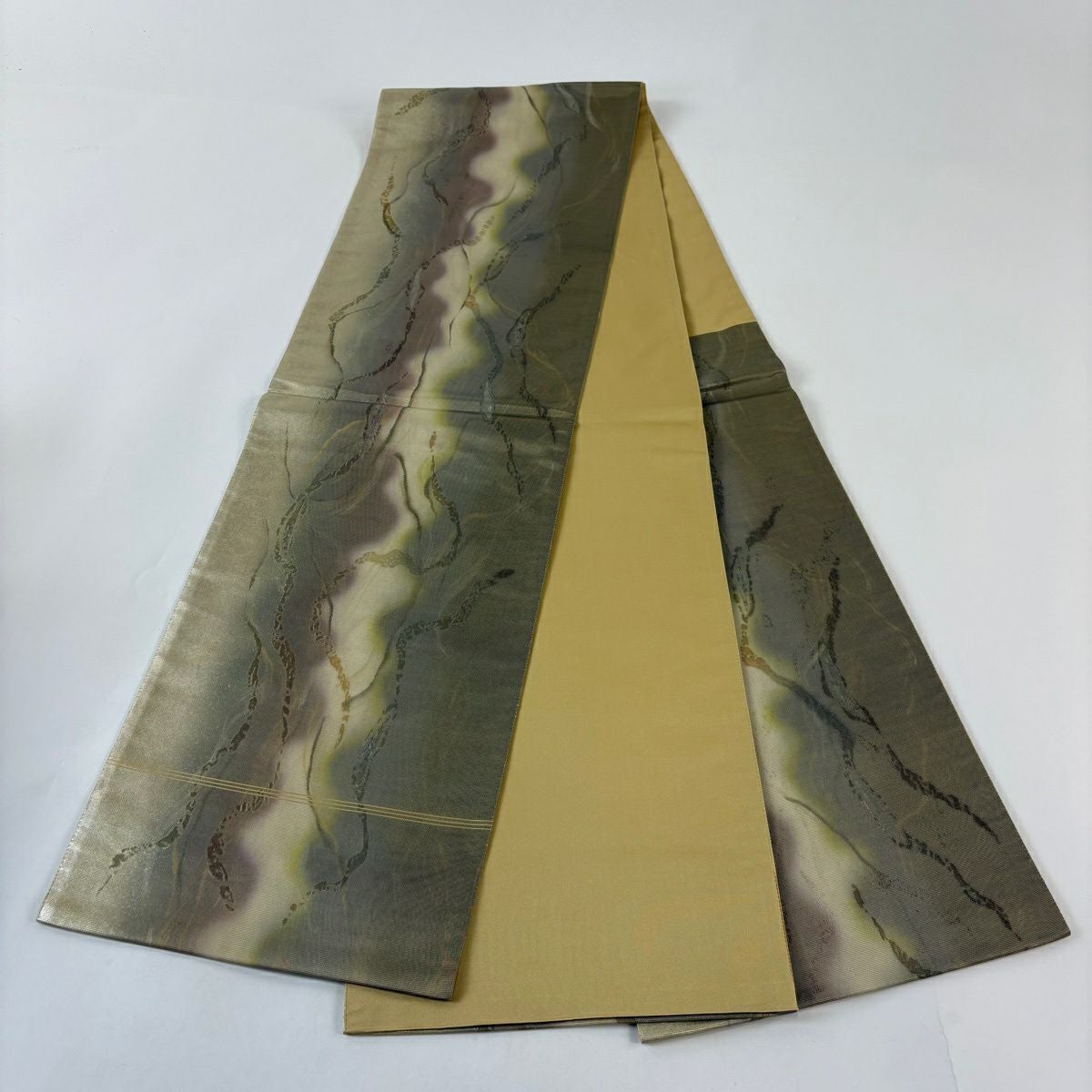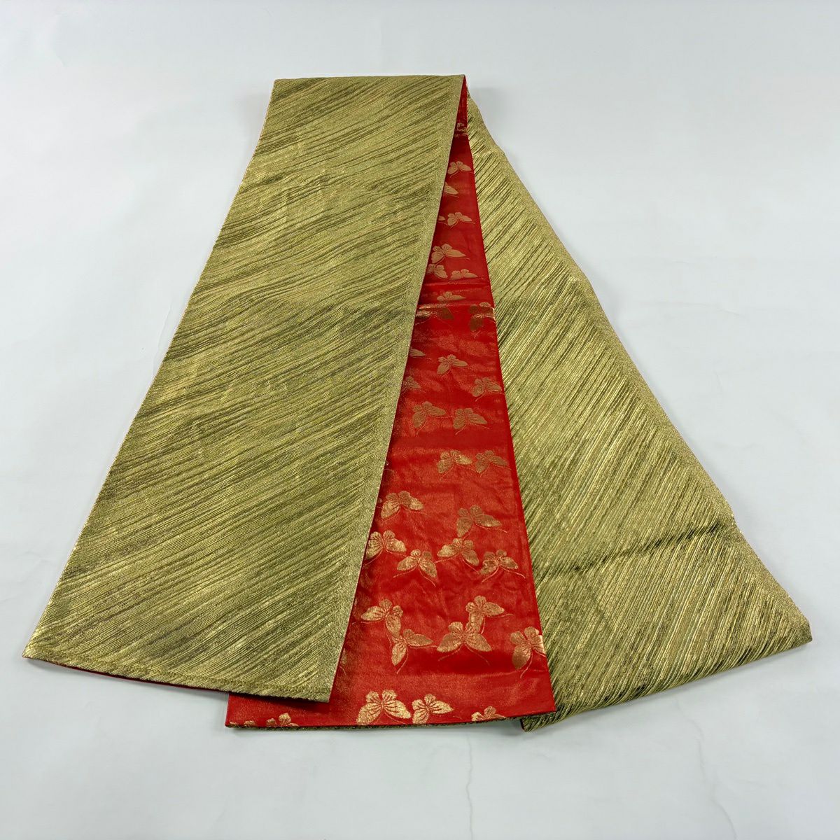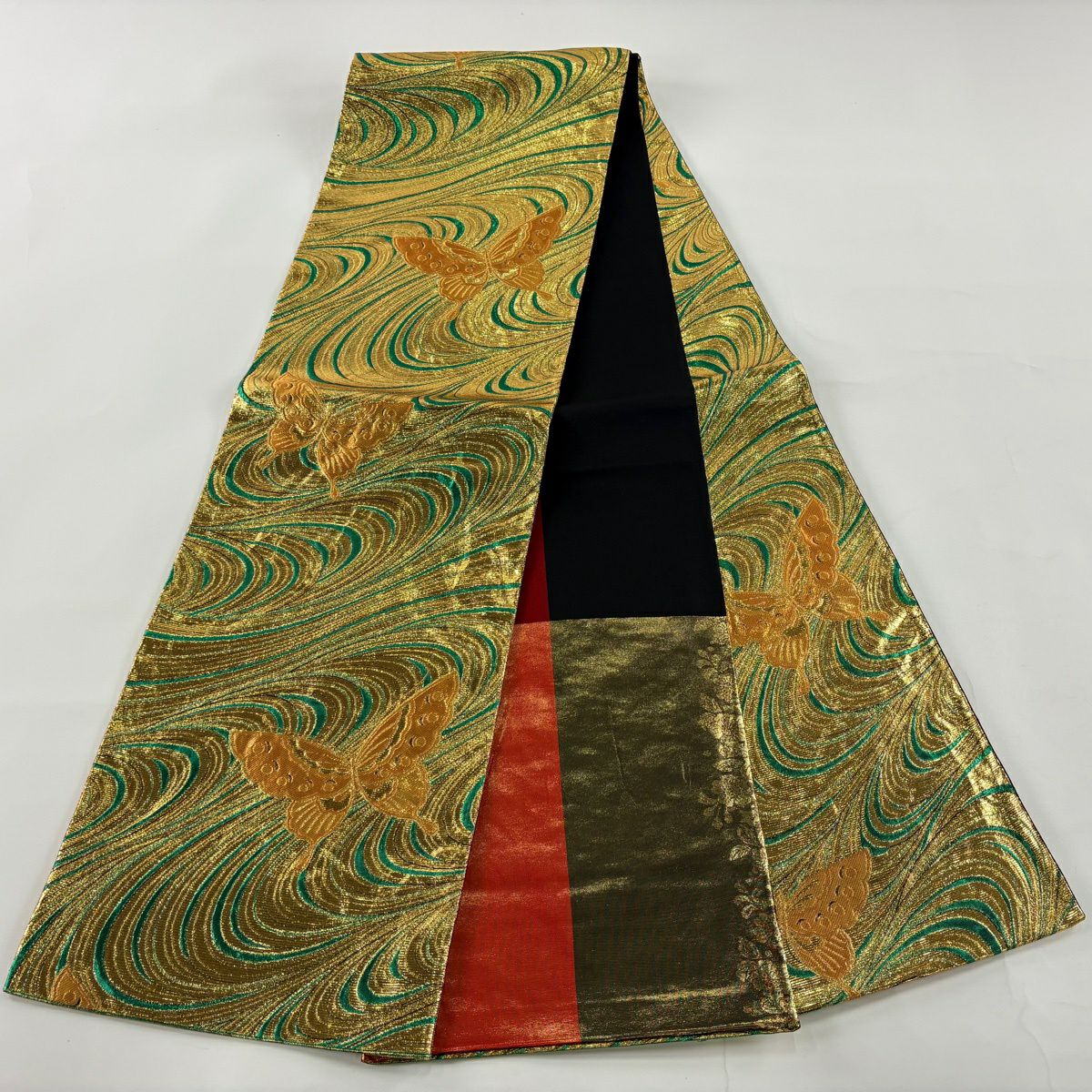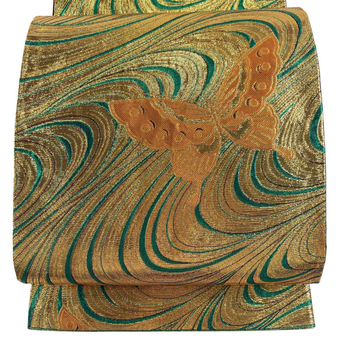 袋帯 秀品 蝶 流水 箔 金色 全通 正絹