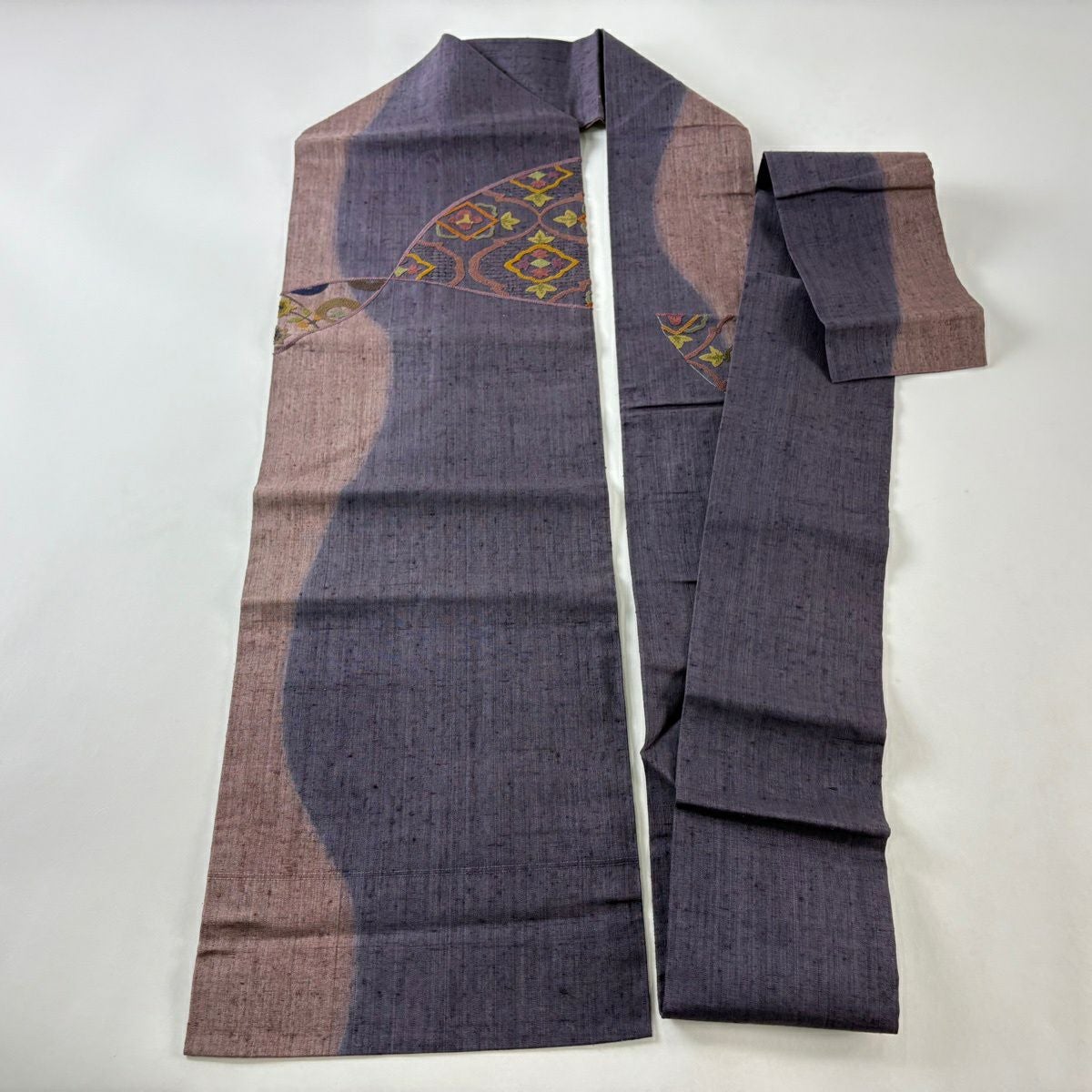 名古屋帯 秀品 紬地 草花 刺繍 紫 正絹
