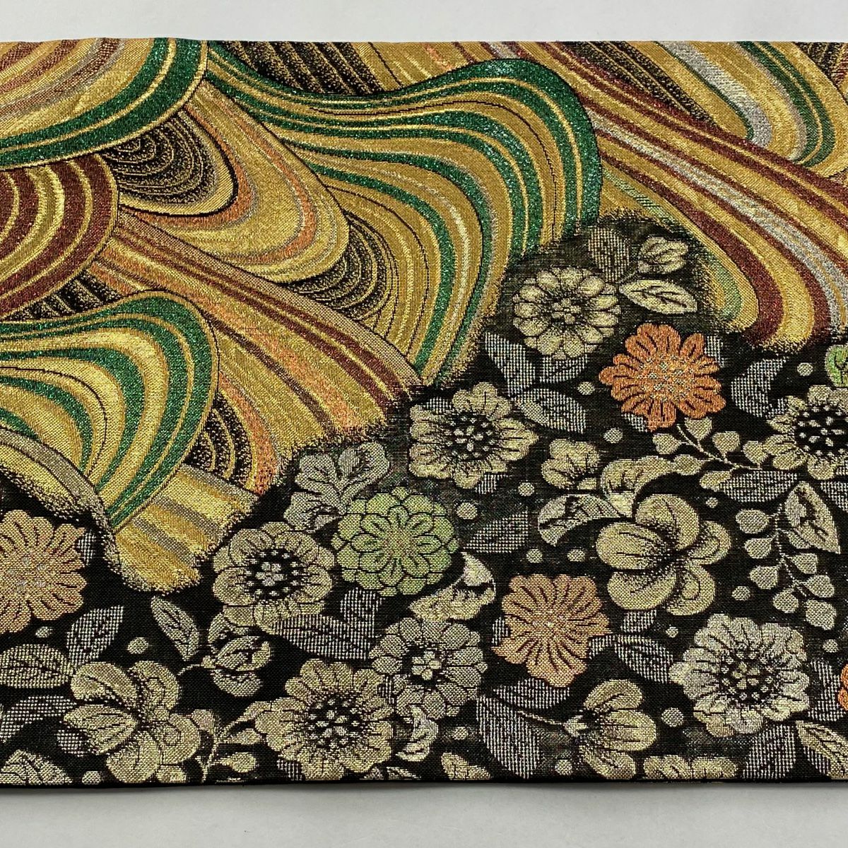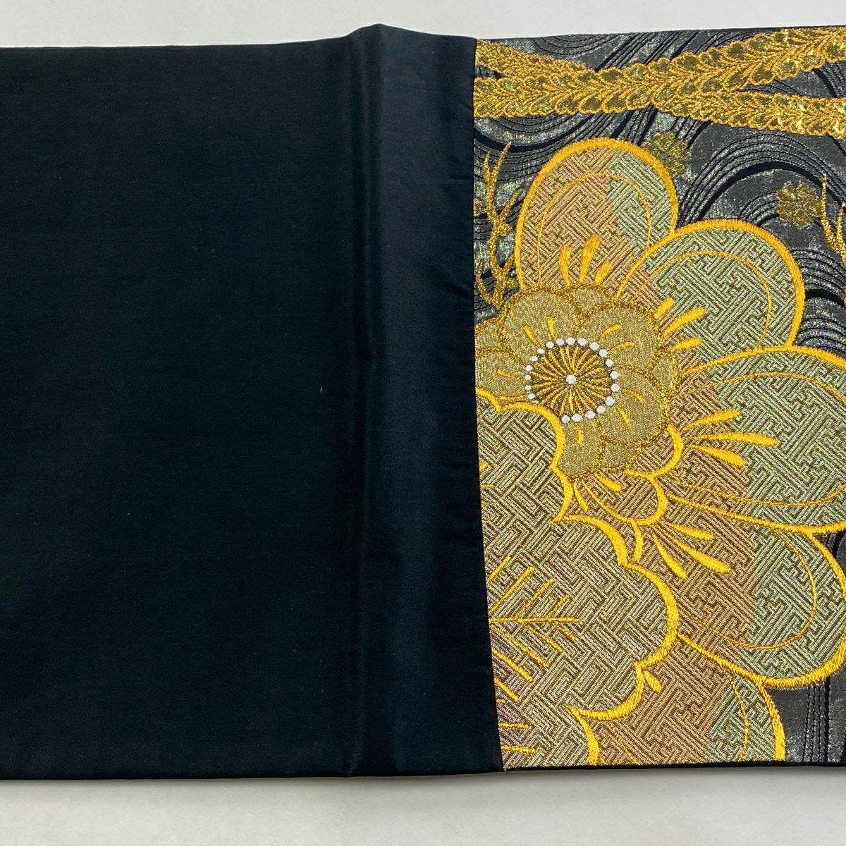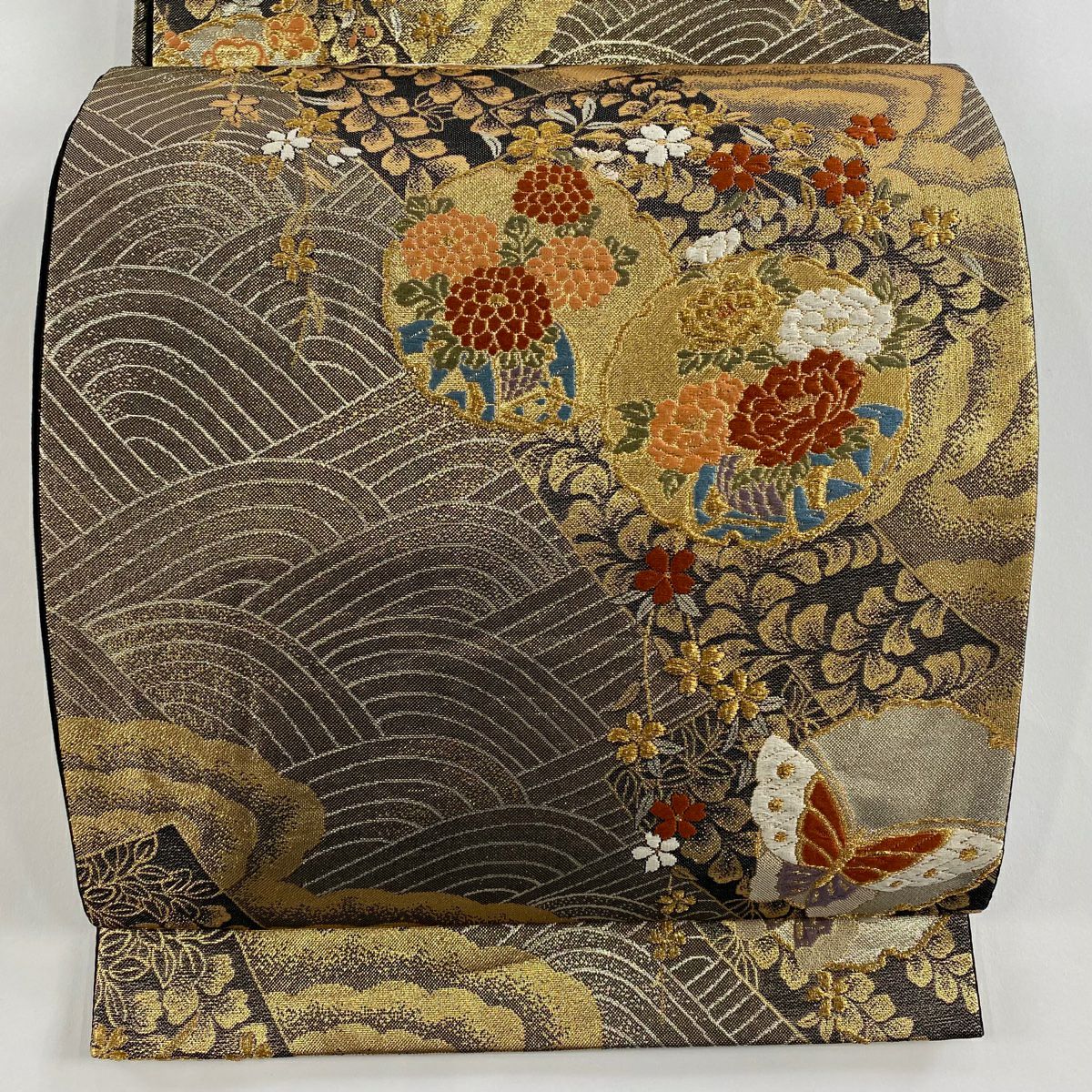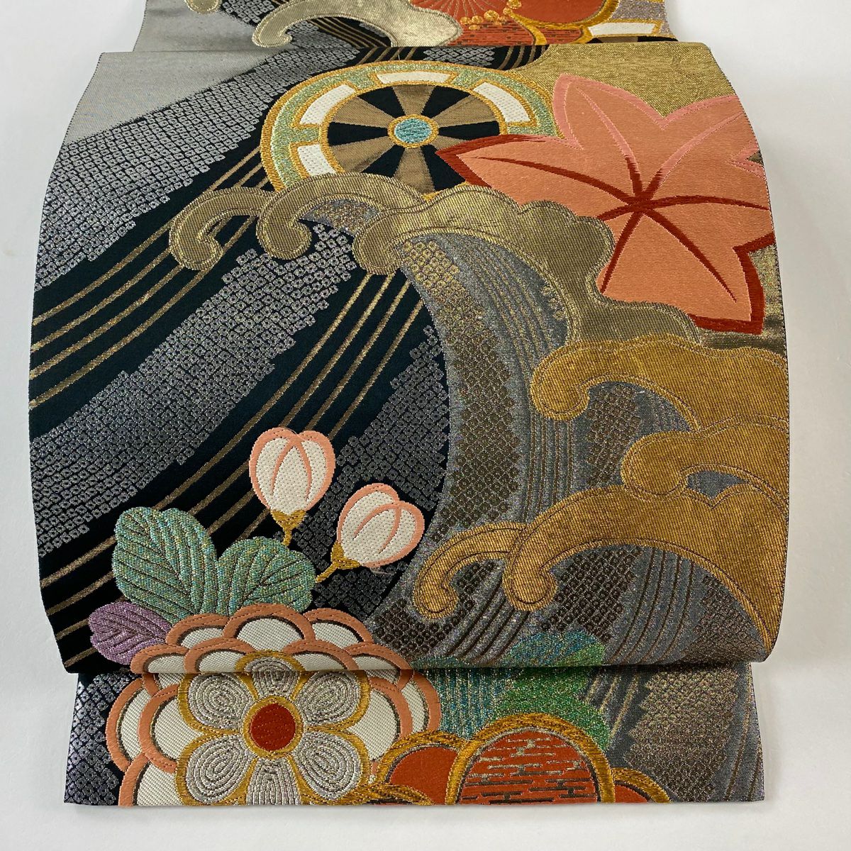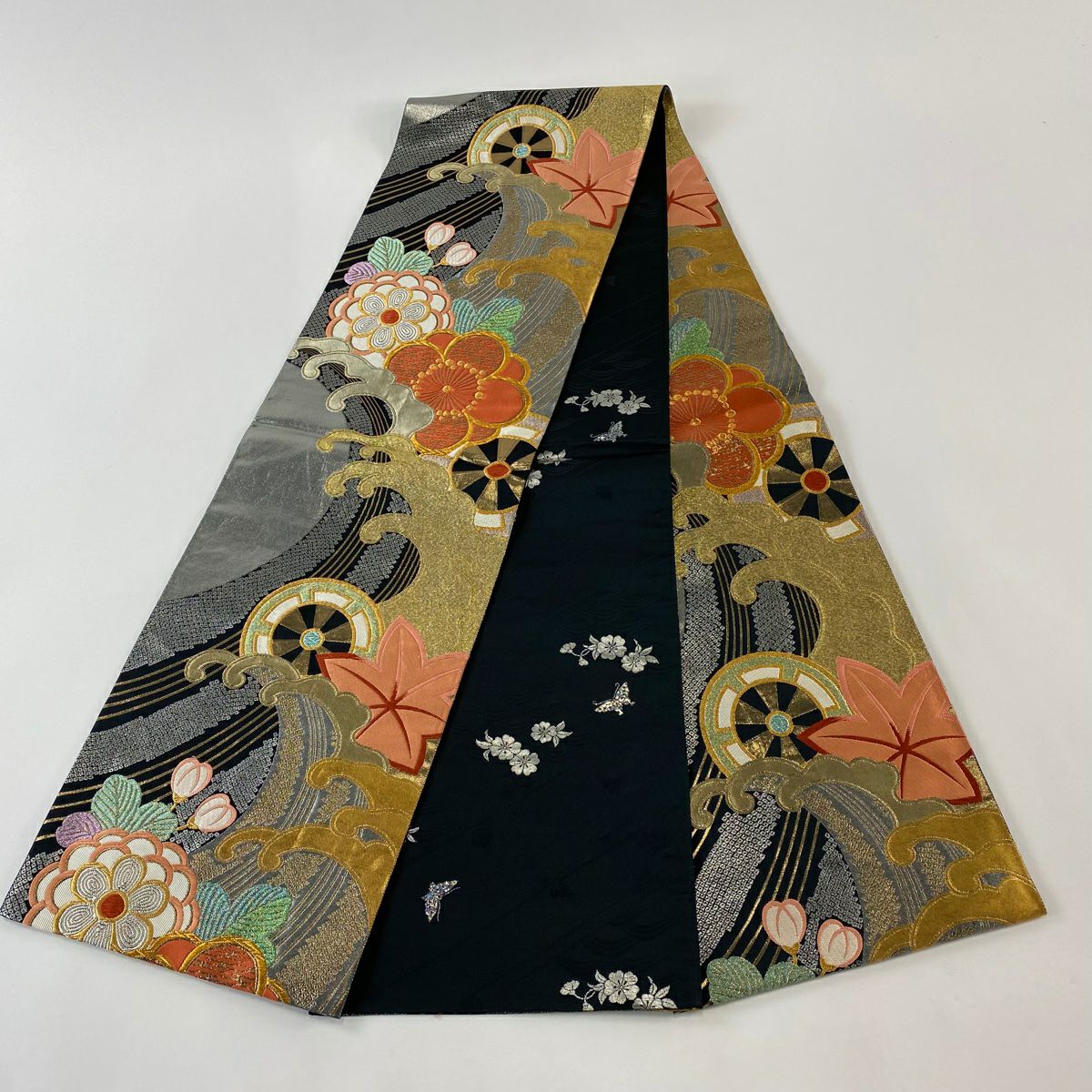 【在庫一掃】 【美品】 袋帯 秀品 草花 波 箔 金糸 墨色 六通 正絹