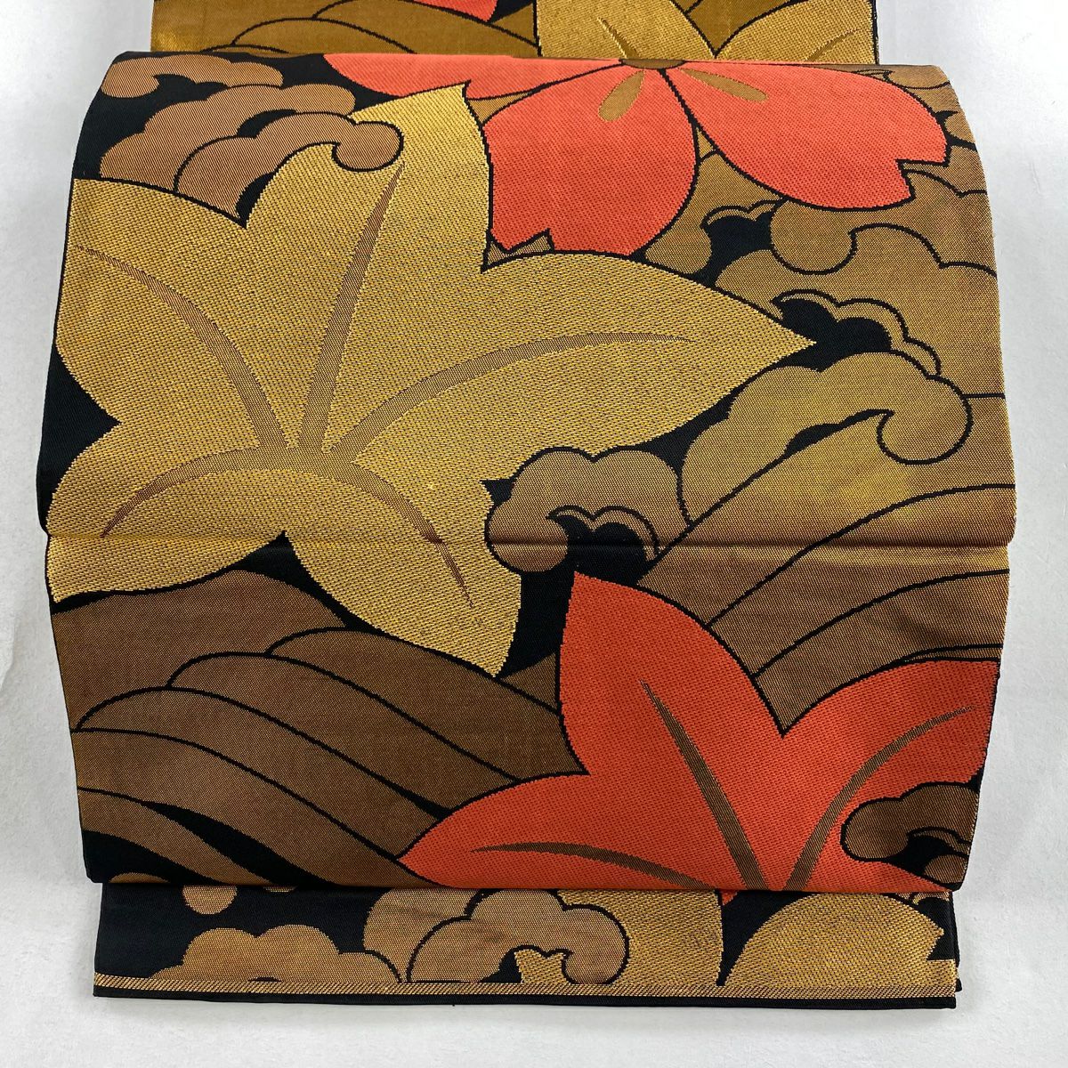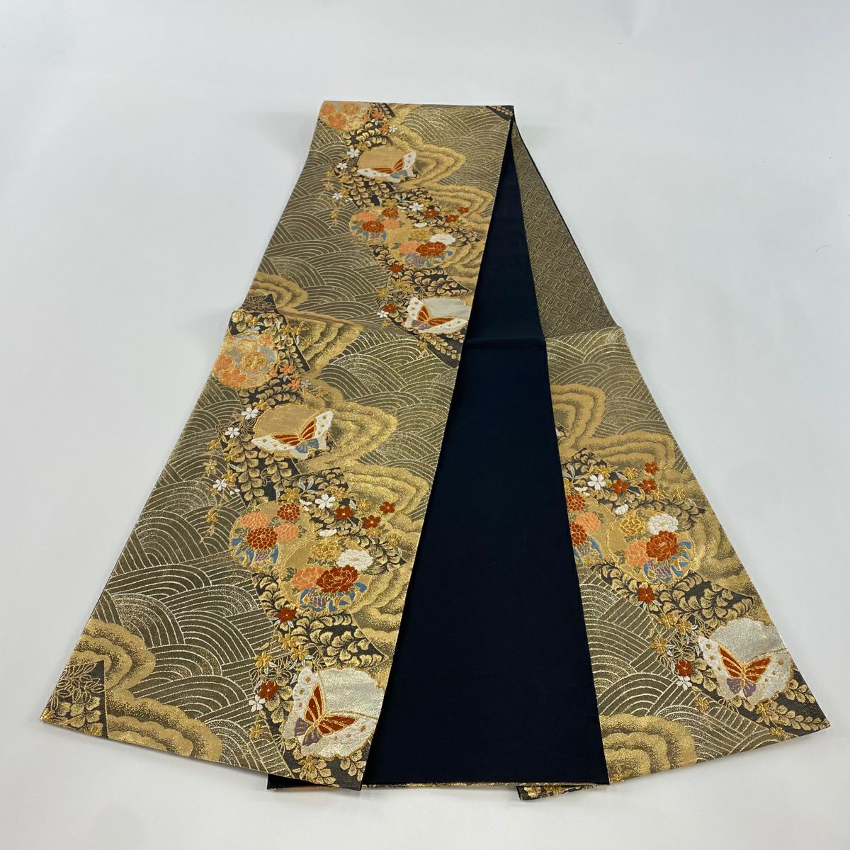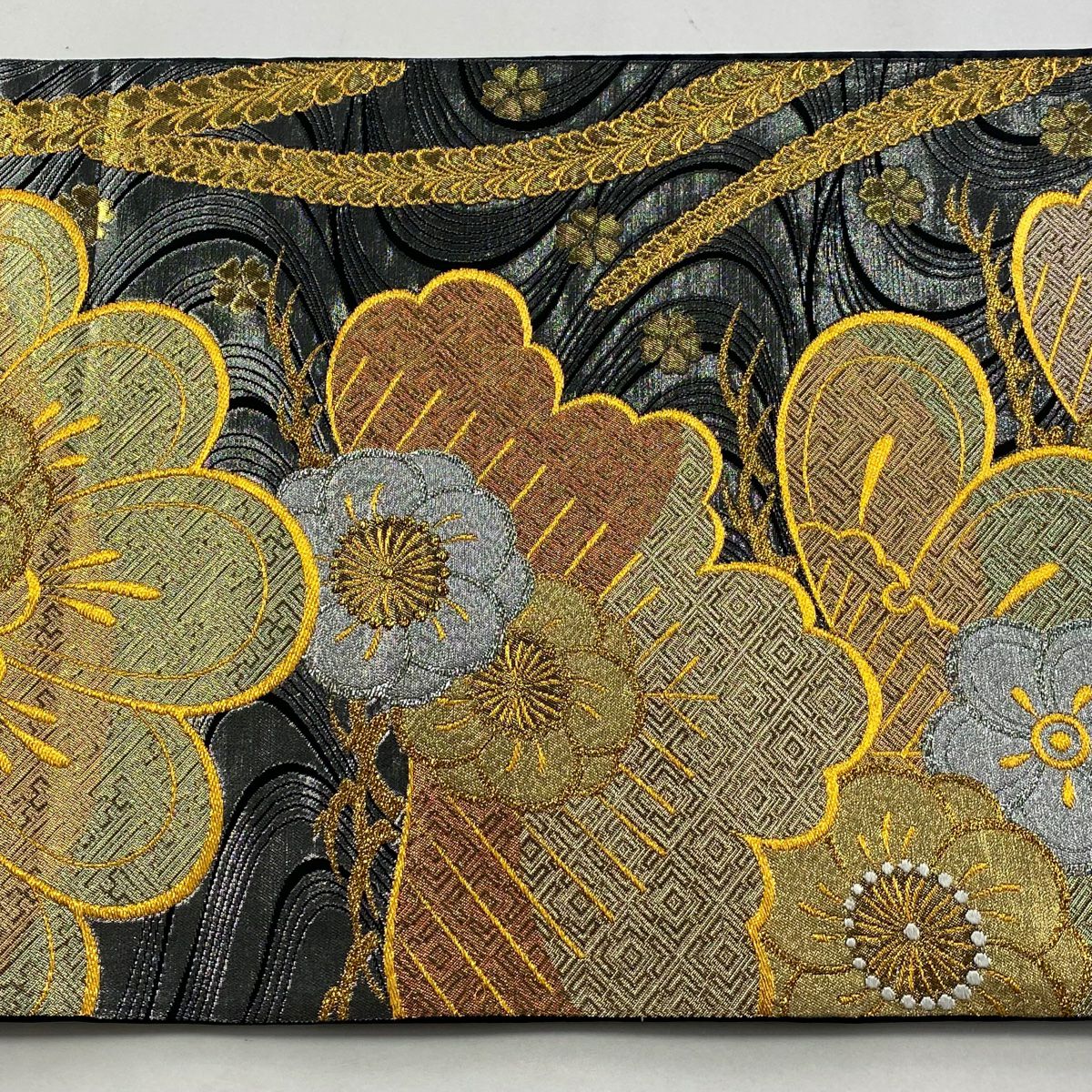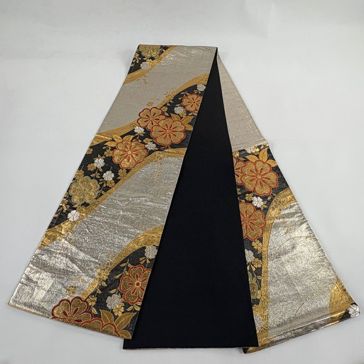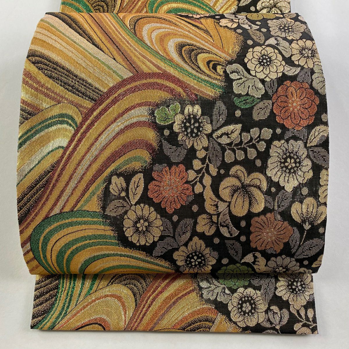 【在庫一掃】 【美品】 袋帯 秀品 草花 波 箔 金糸 墨色 六通 正絹