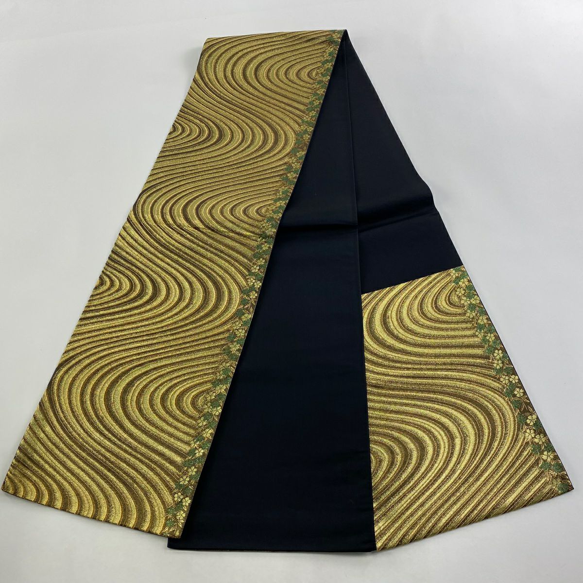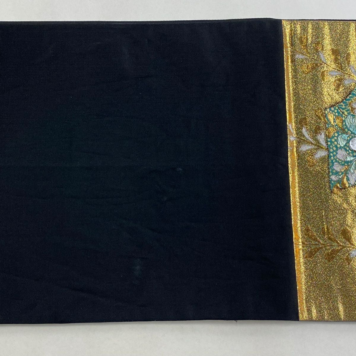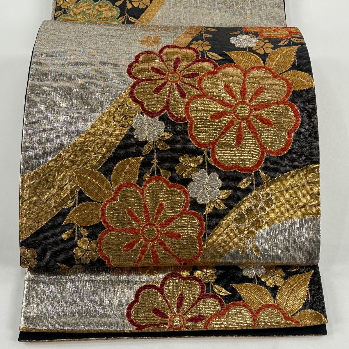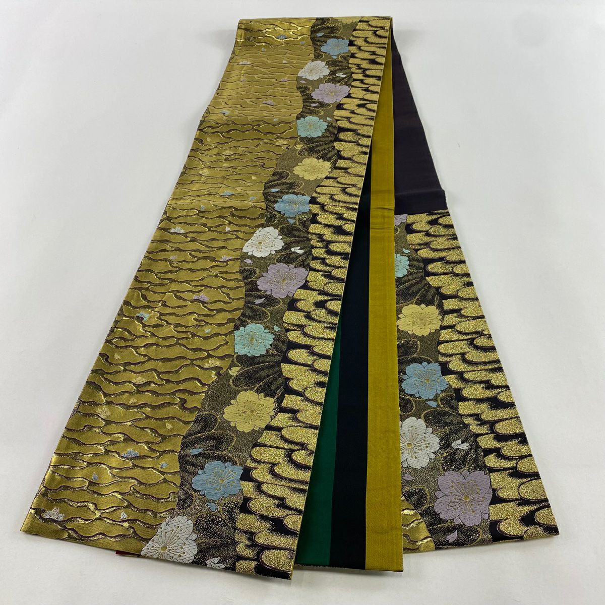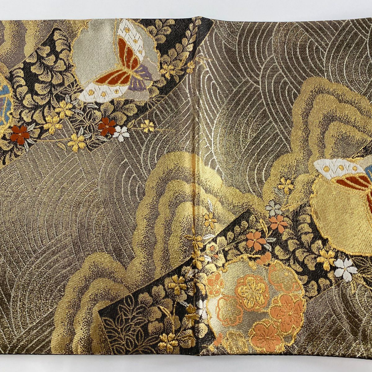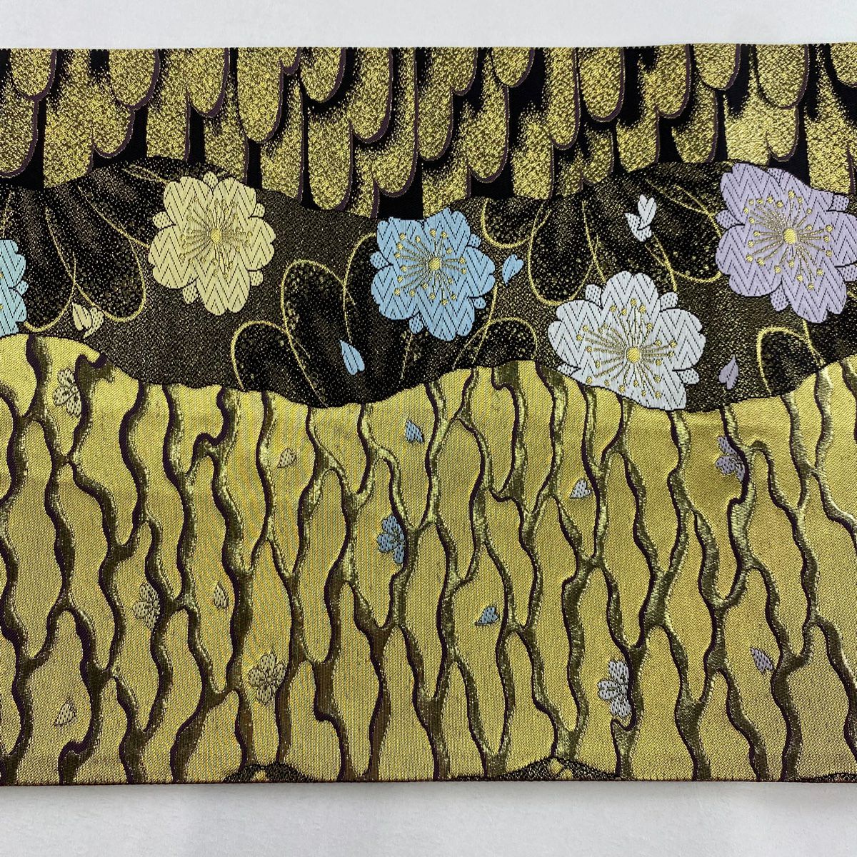 【在庫一掃】 【美品】 袋帯 秀品 草花 波 箔 金糸 墨色 六通 正絹