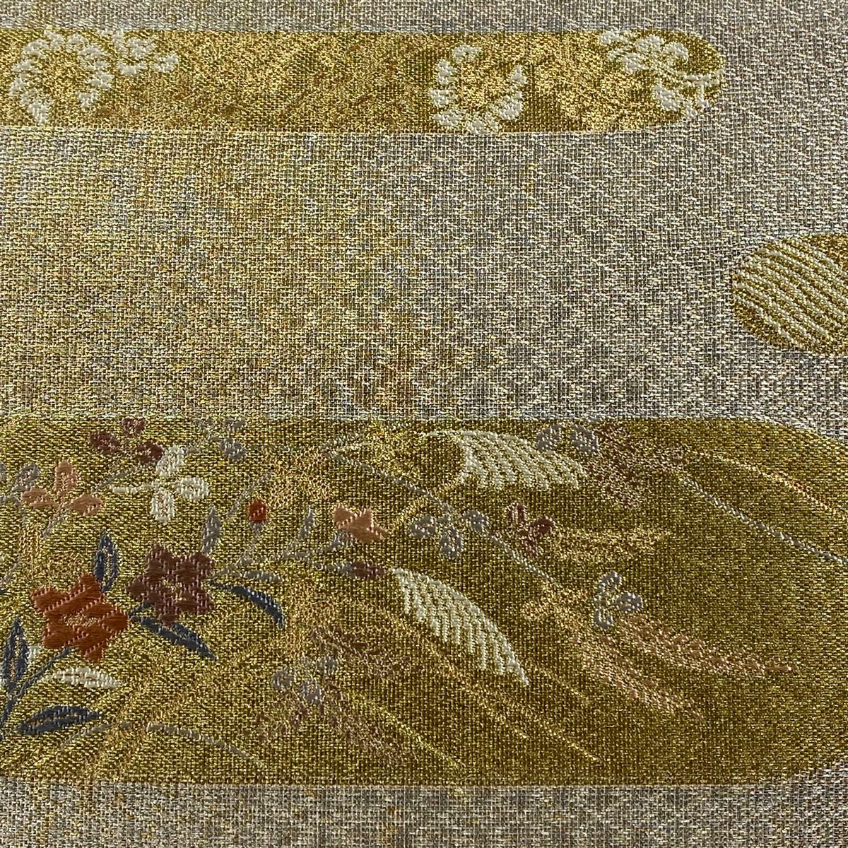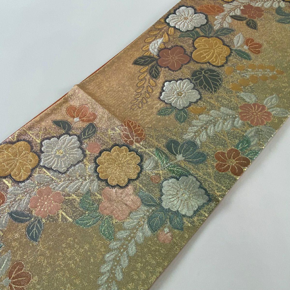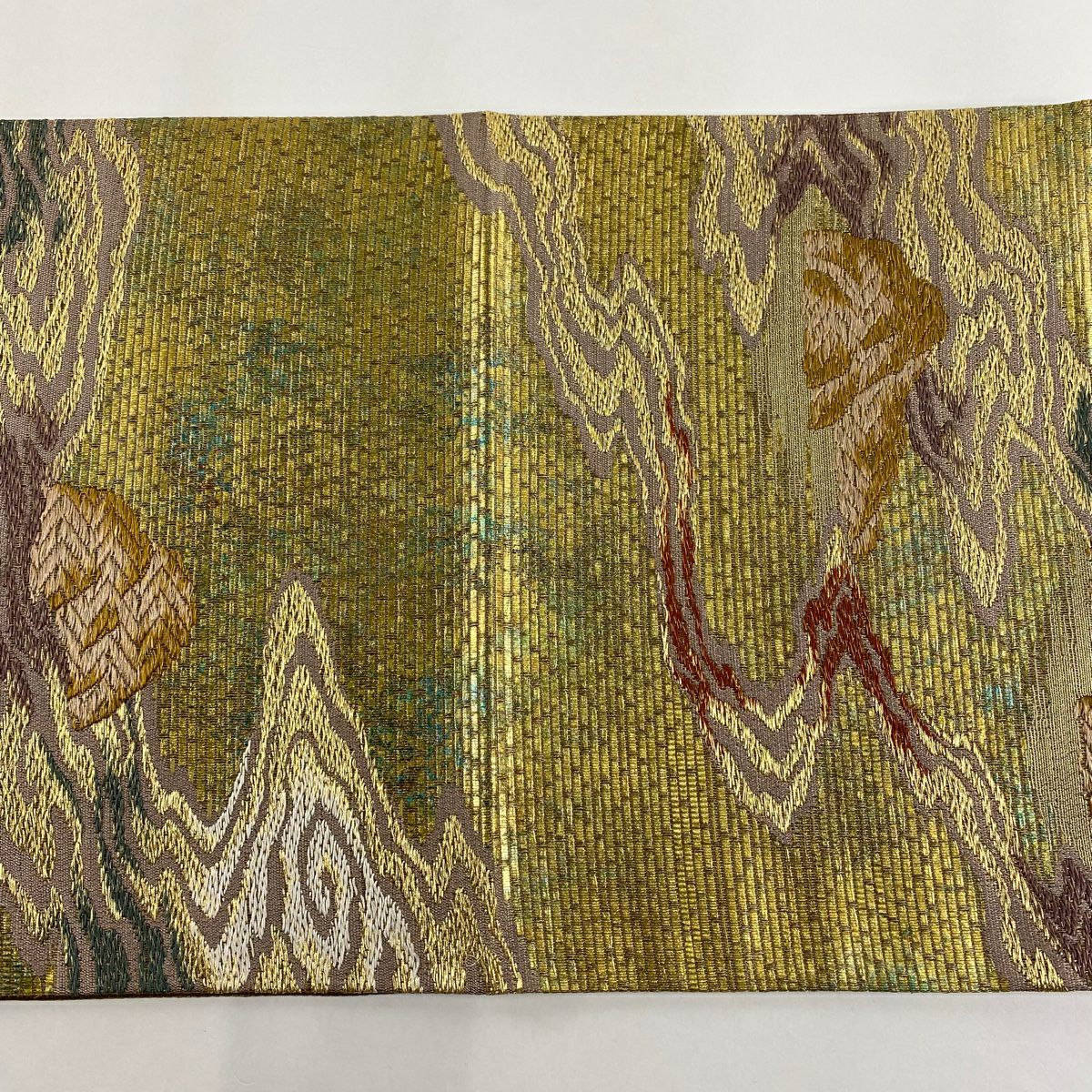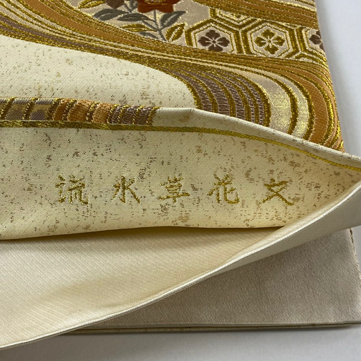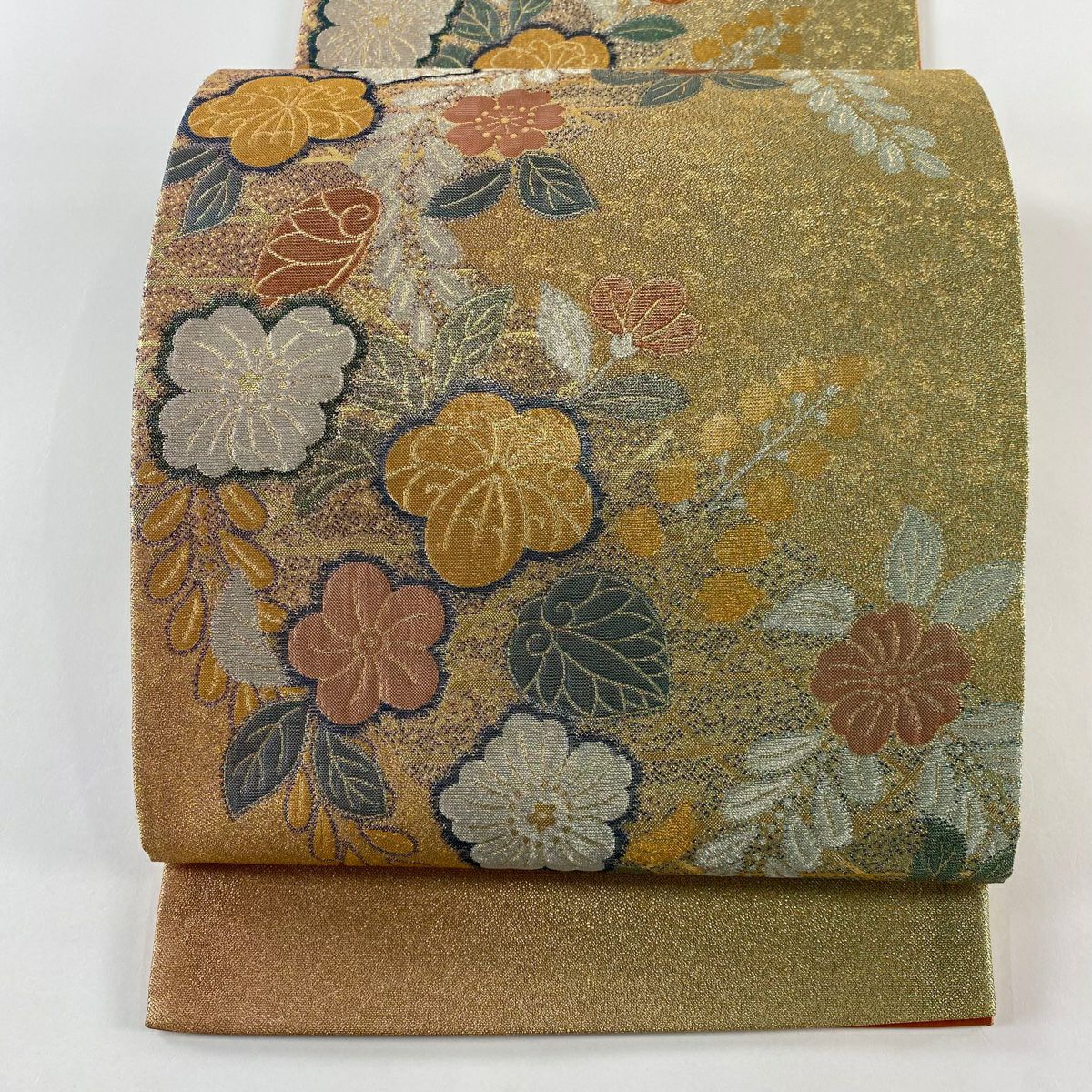 【在庫一掃】 【美品】 袋帯 秀品 草花 流水 金糸 箔 金茶 六通 正絹