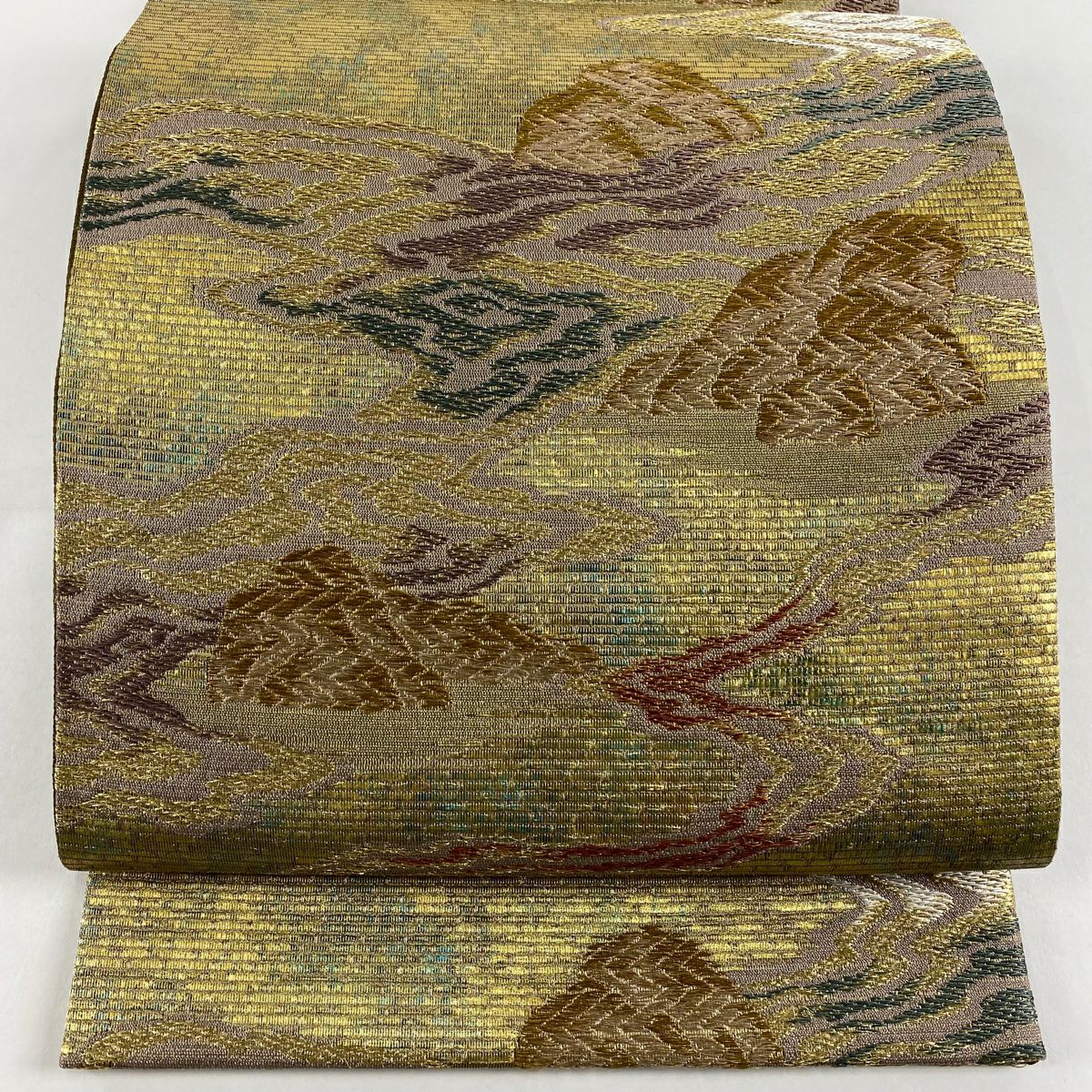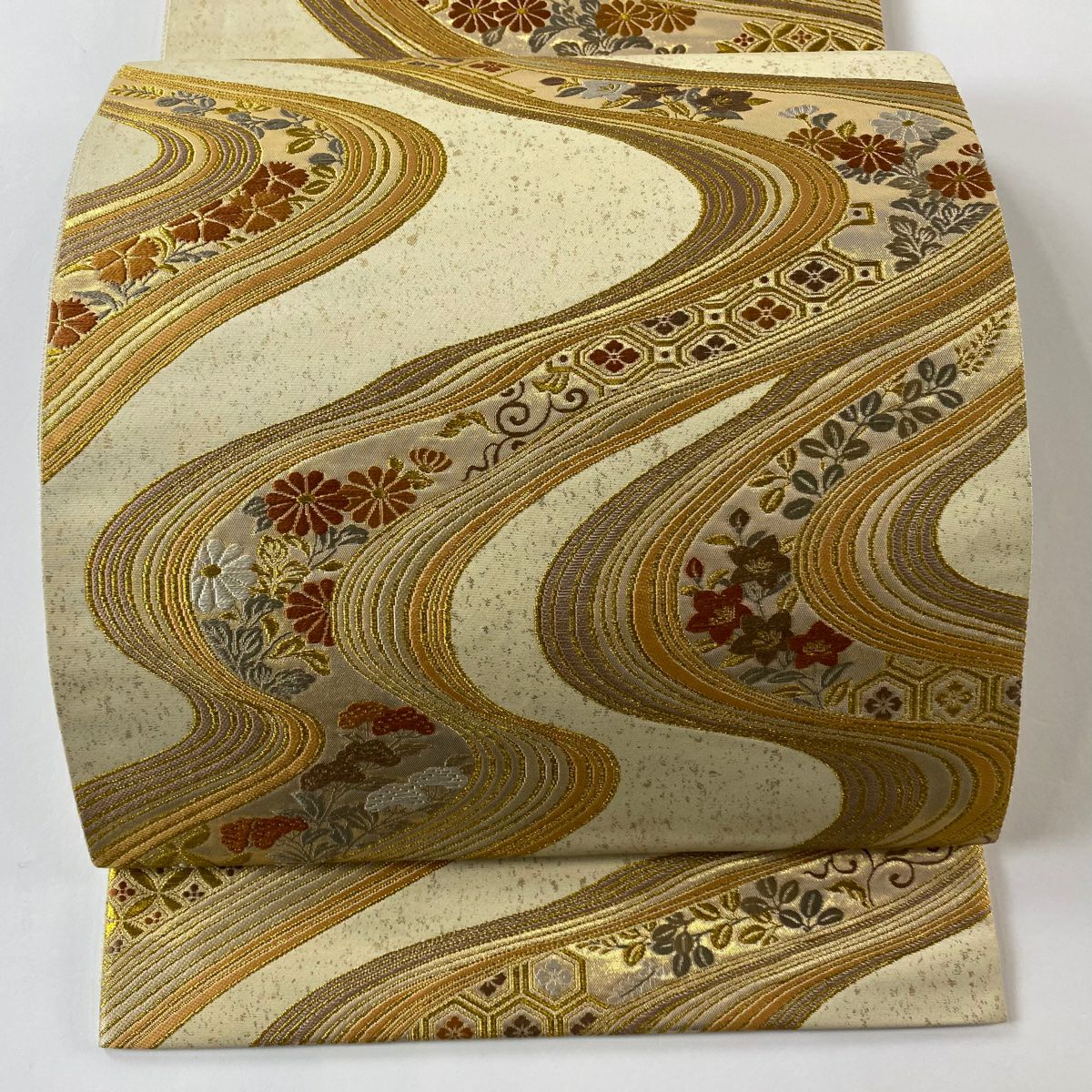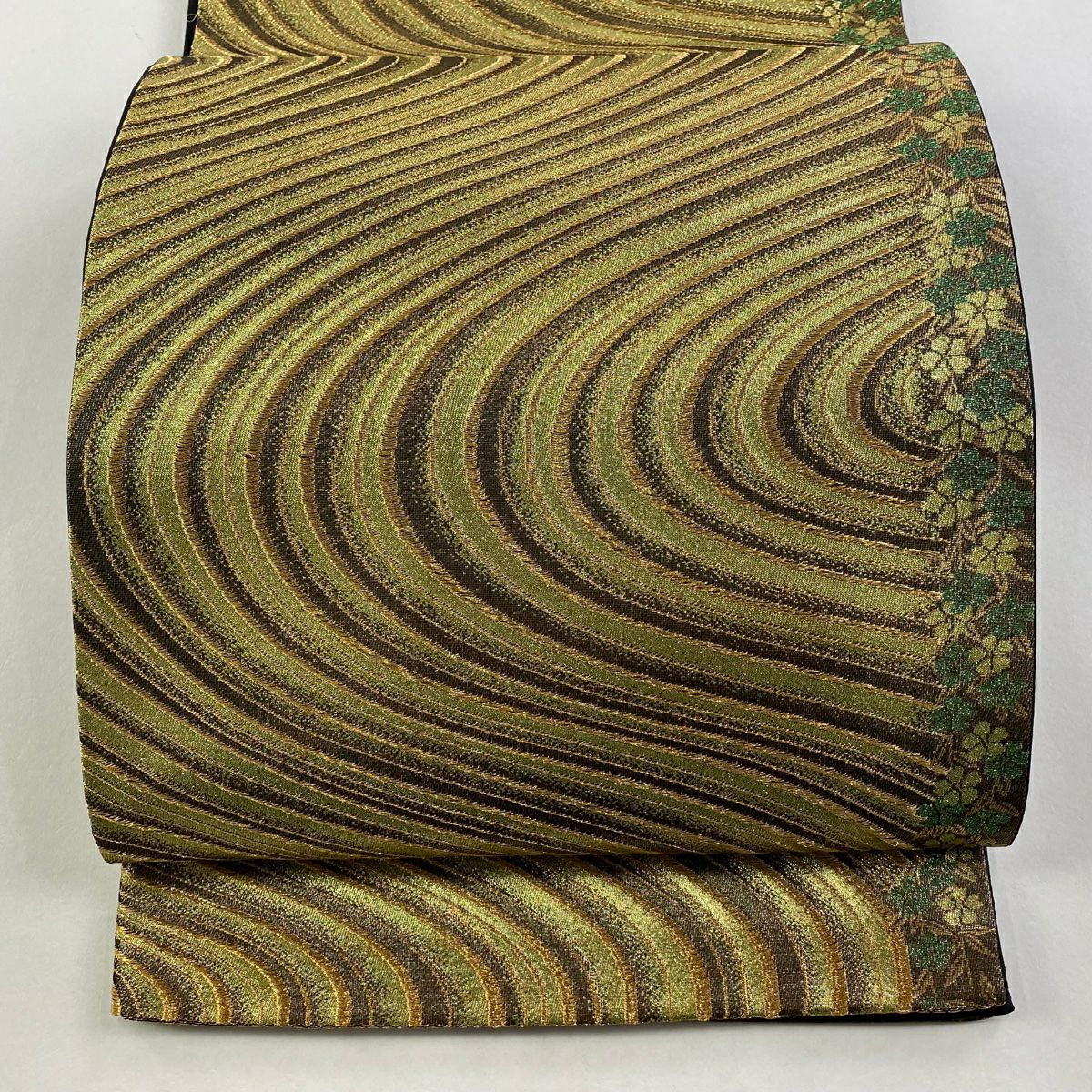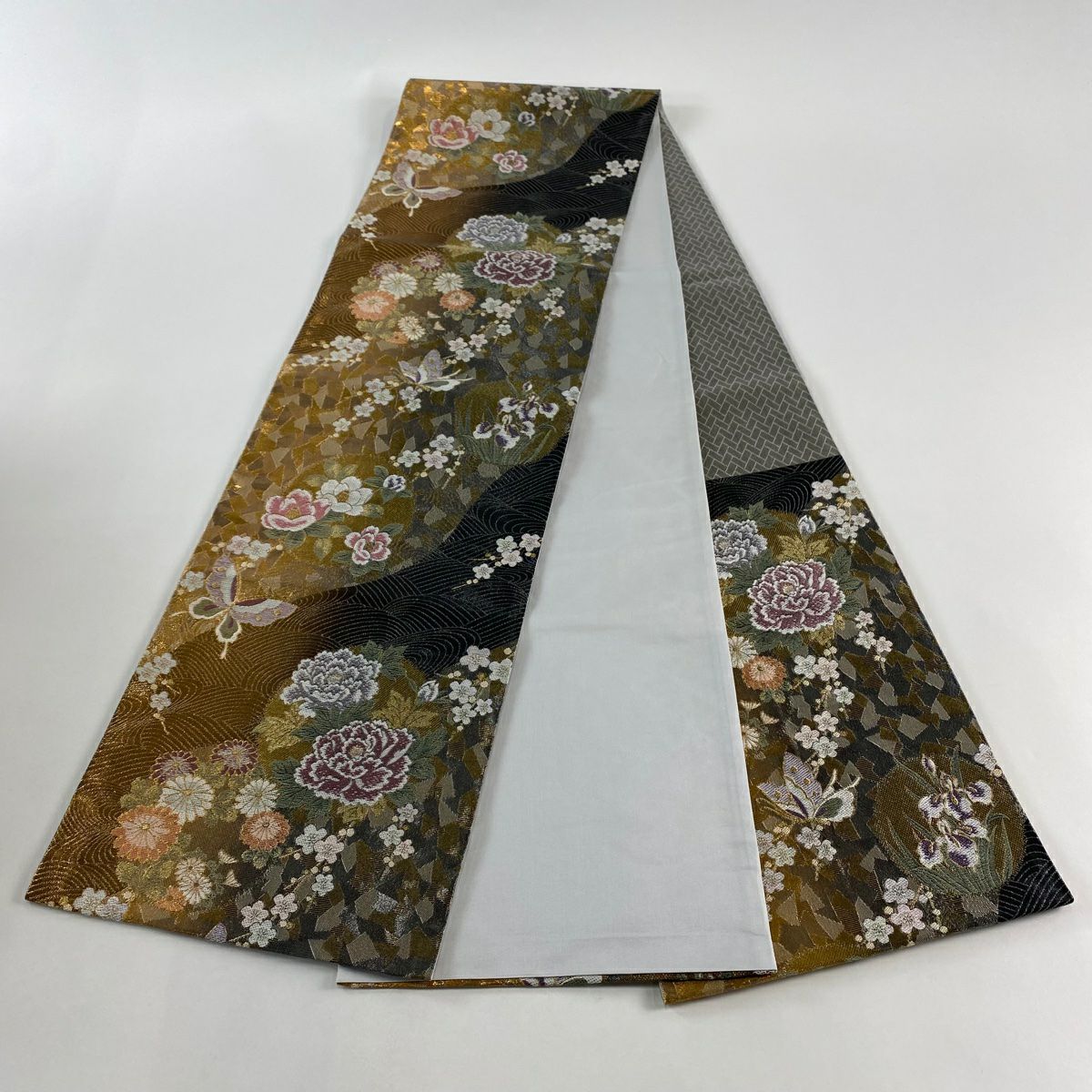 【在庫一掃】 【美品】 袋帯 秀品 草花 流水 金糸 箔 金茶 六通 正絹