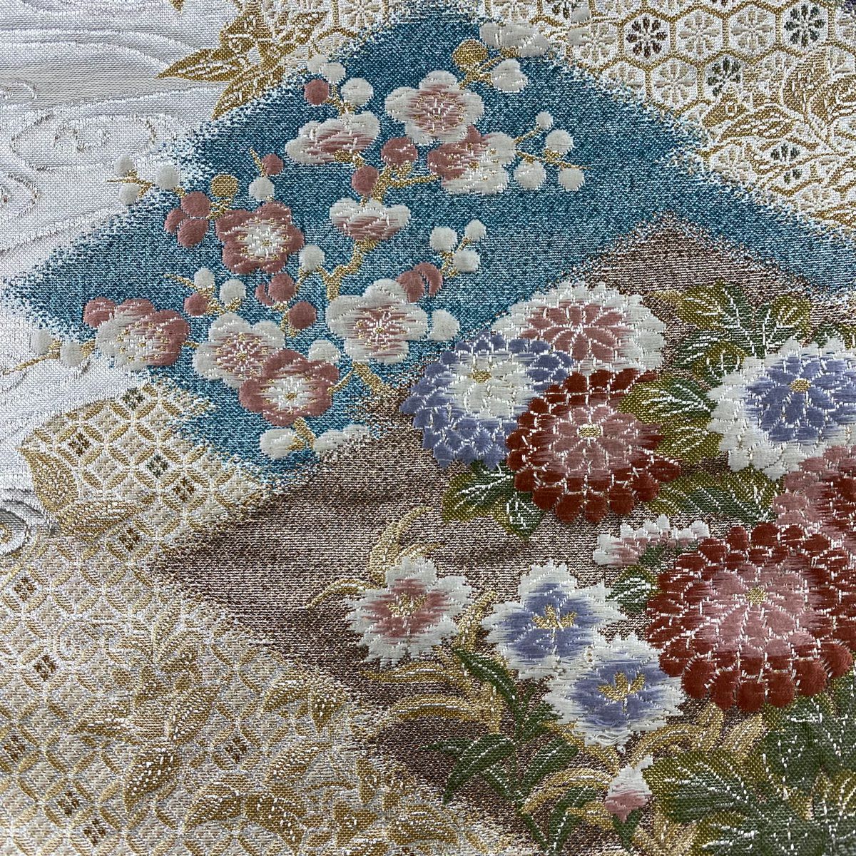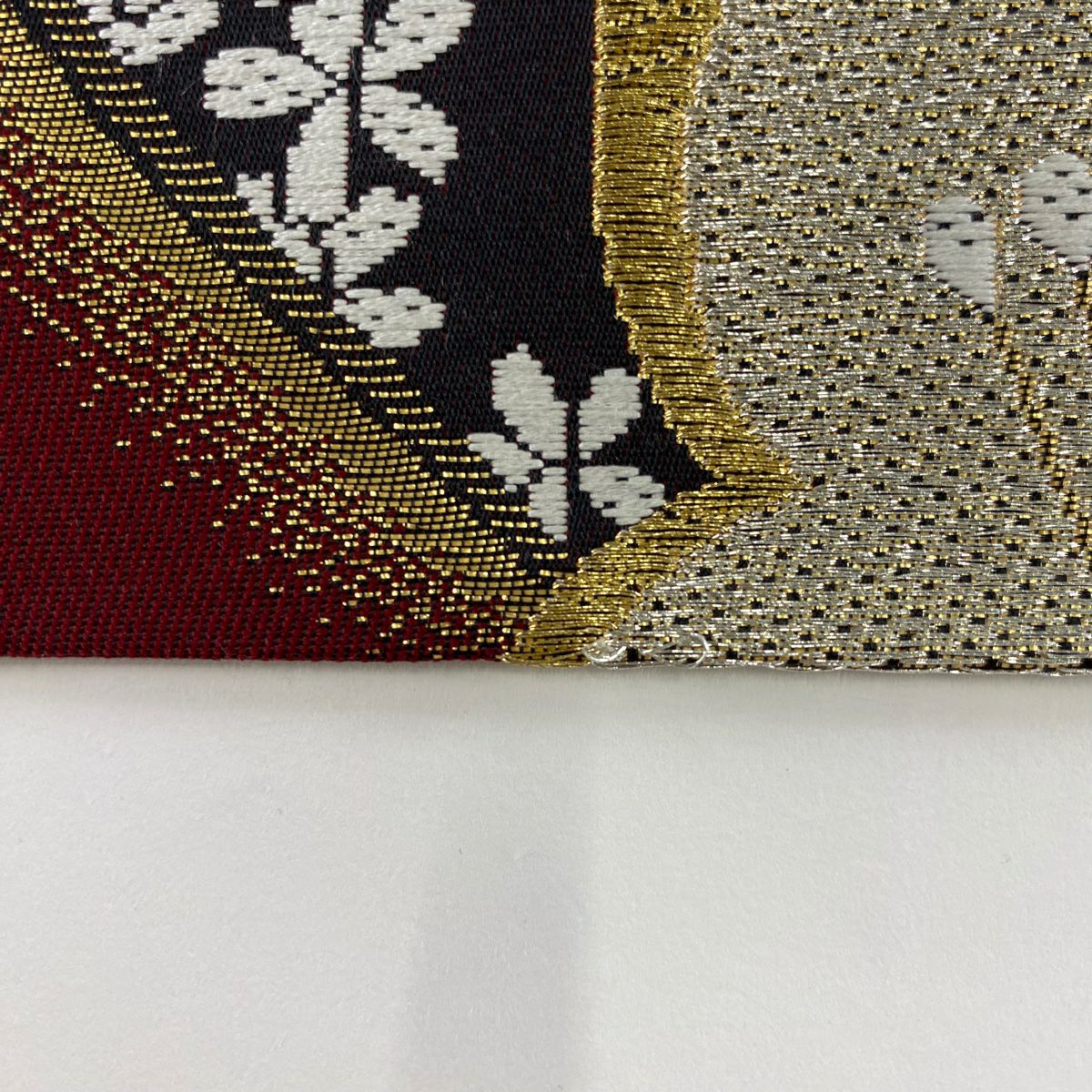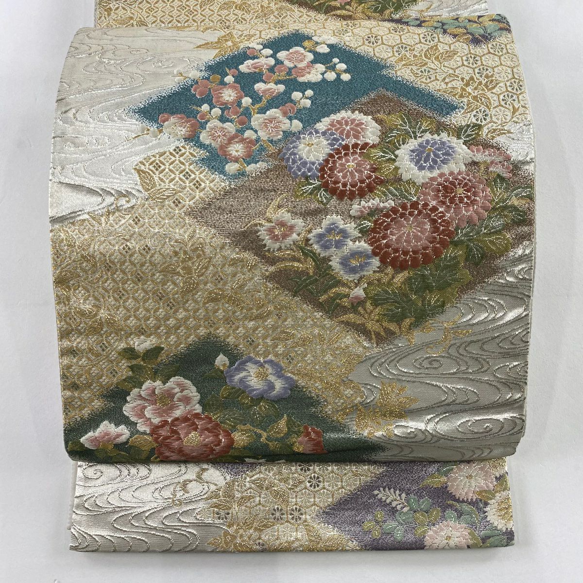 【在庫一掃】 【美品】 袋帯 秀品 梅 波頭 唐織 箔 銀色 全通 正絹