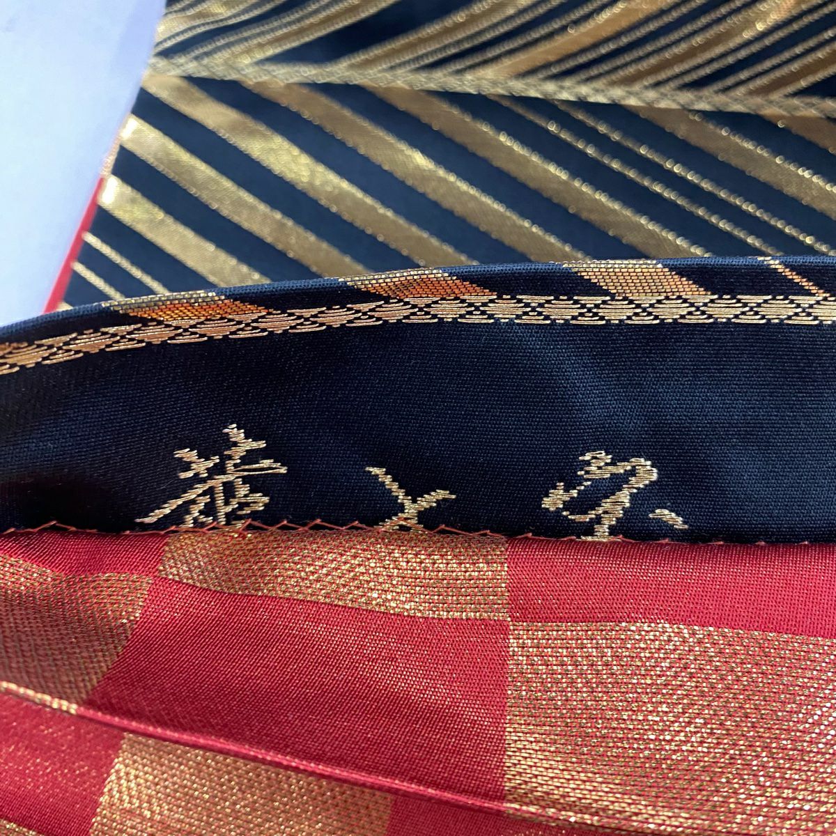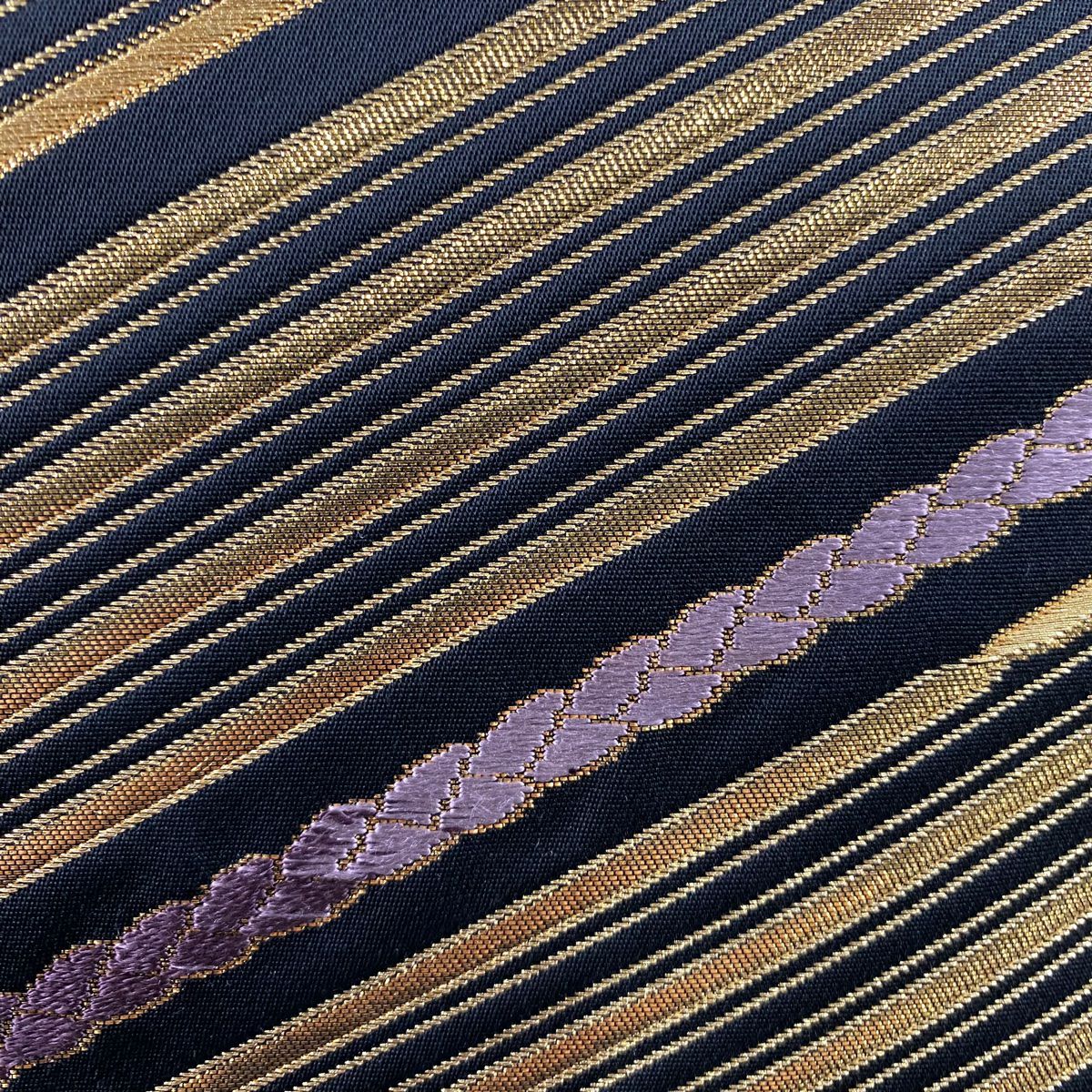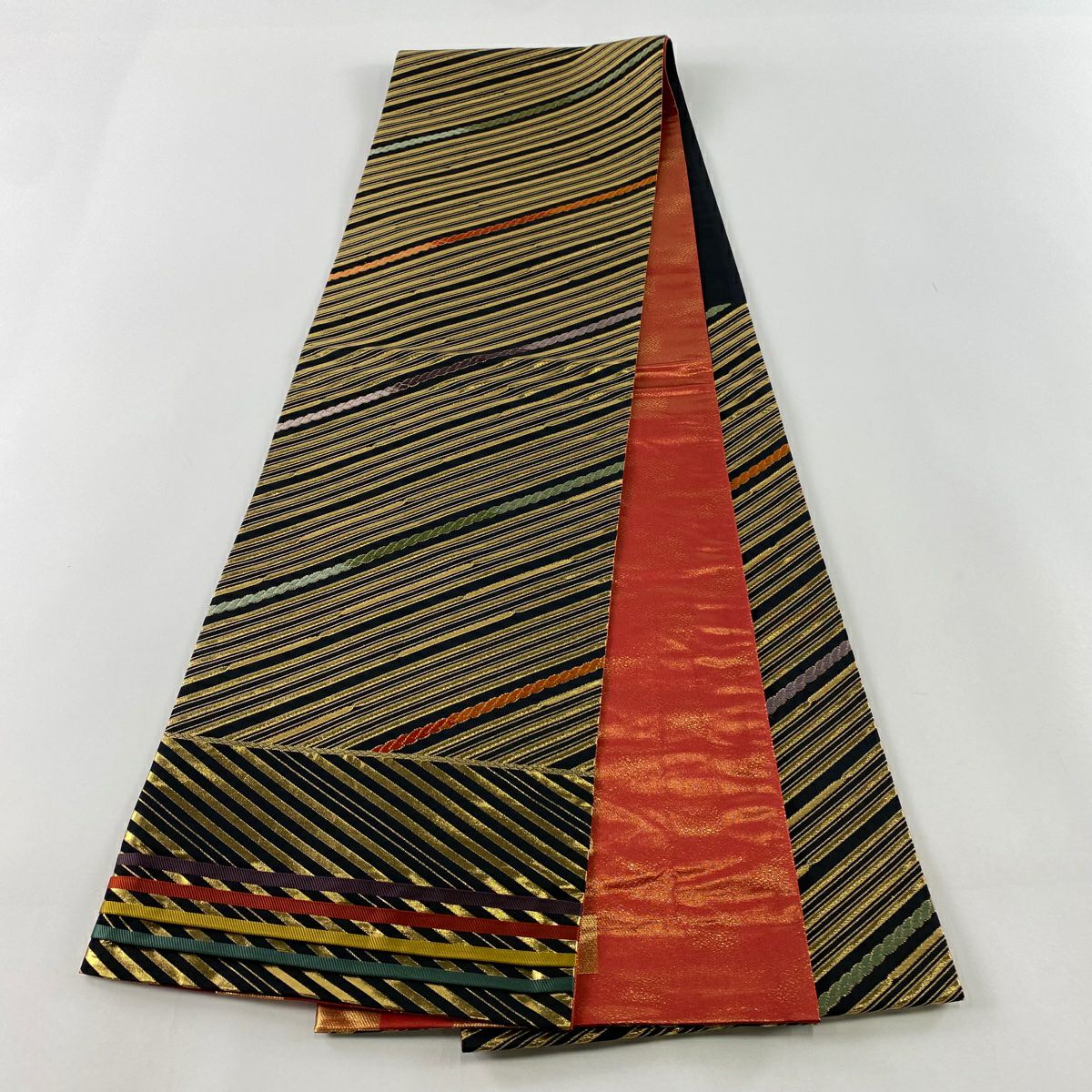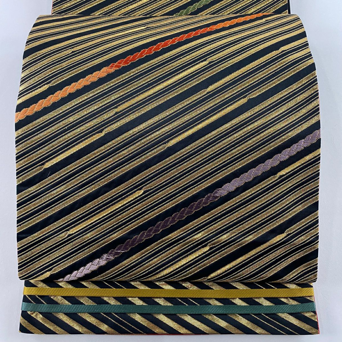 【在庫一掃】 【美品】 袋帯 秀品 斜縞 紐 刺繍 金糸 黒 六通 正絹