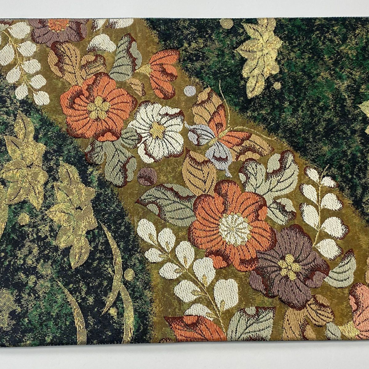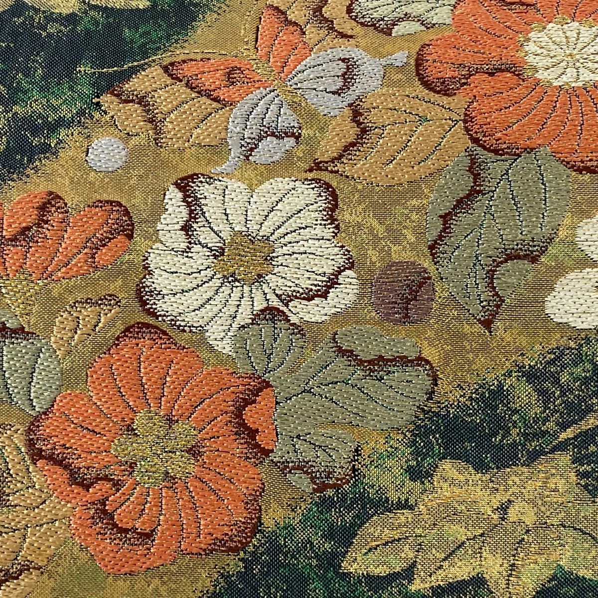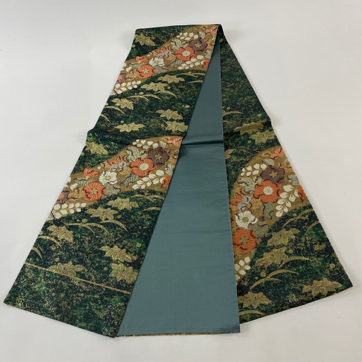 【在庫一掃】 【美品】 袋帯 秀品 草花 蝶 金糸 箔 深緑 六通 正絹