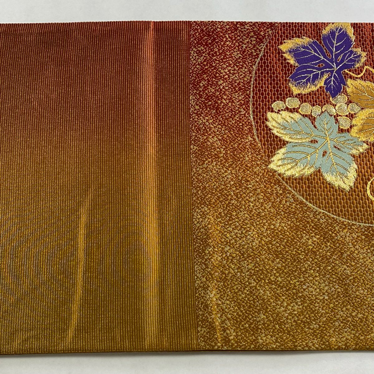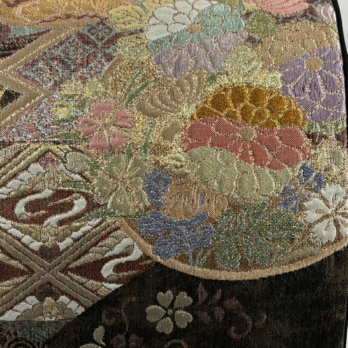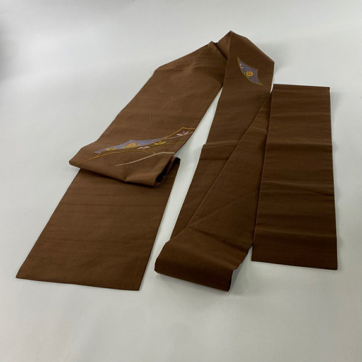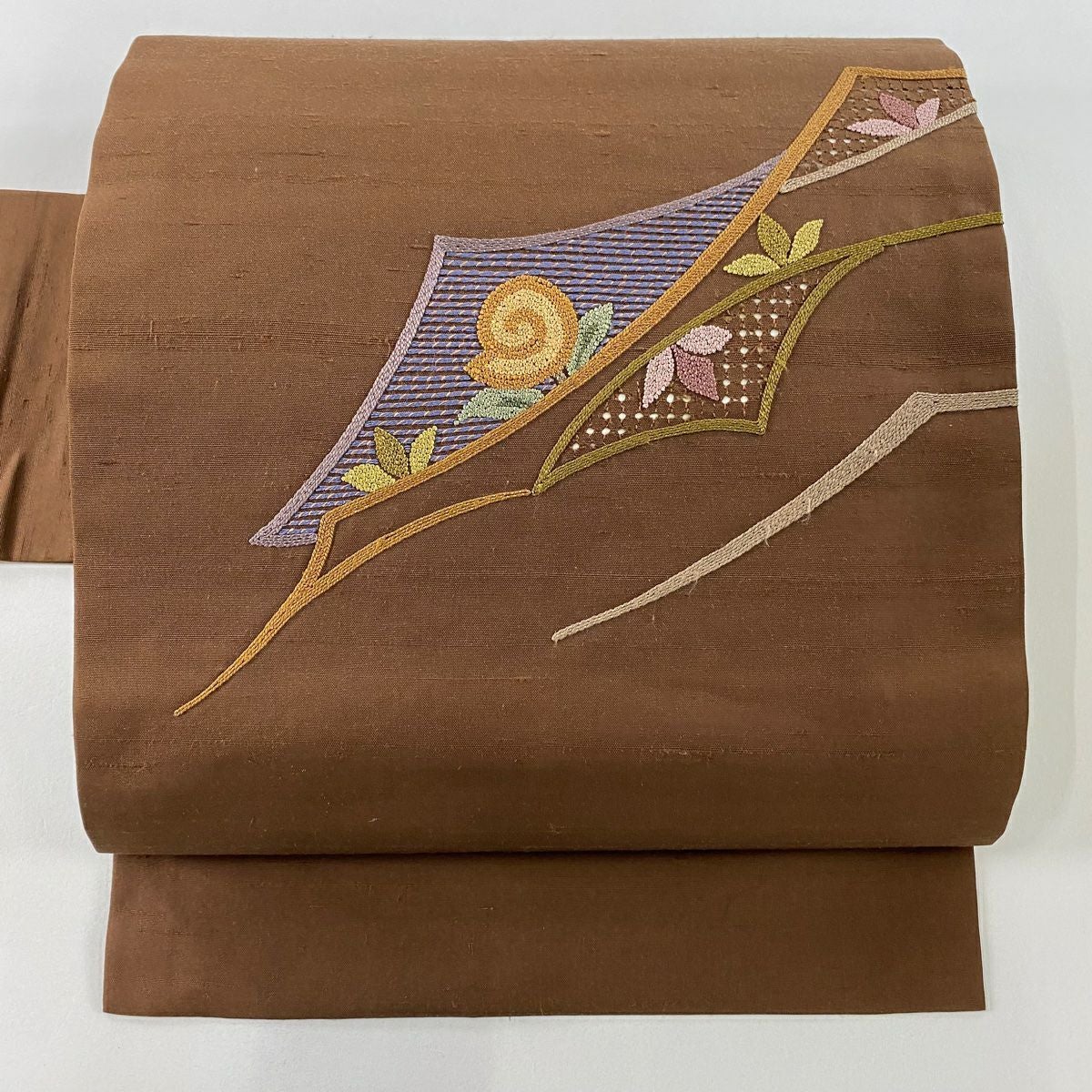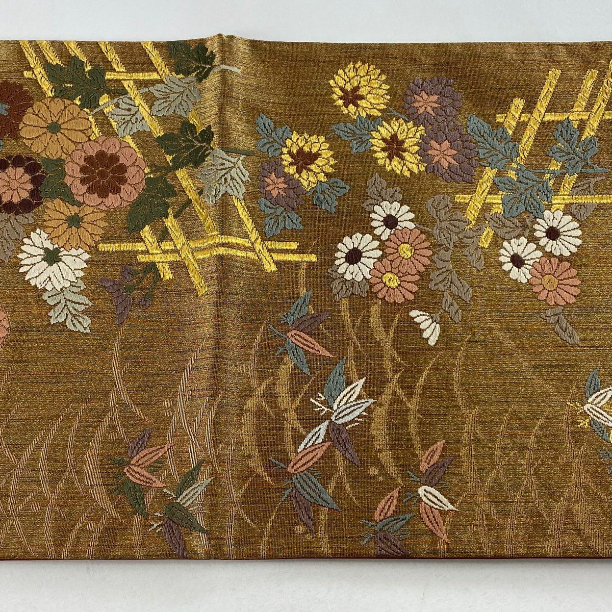 【在庫一掃】 袋帯 秀品 貝桶 草花 刺繍 金彩 茶色 お太鼓柄 正絹