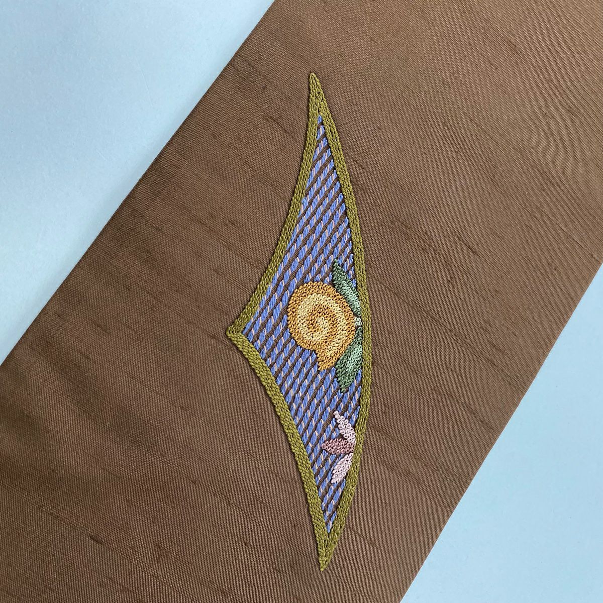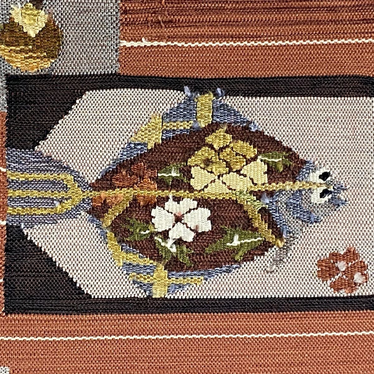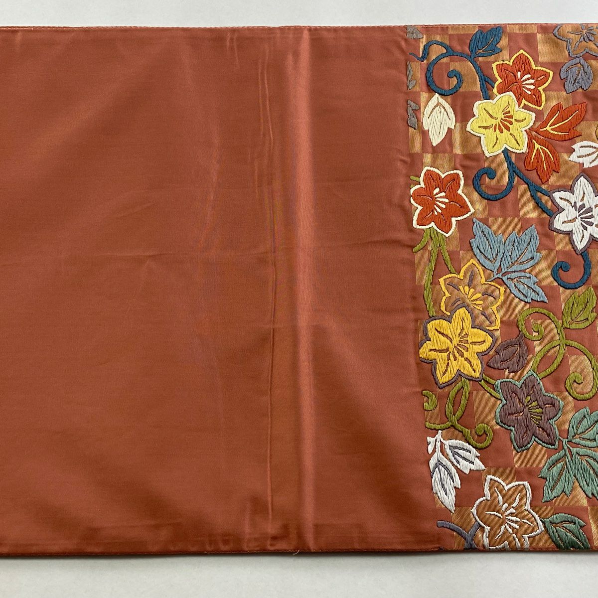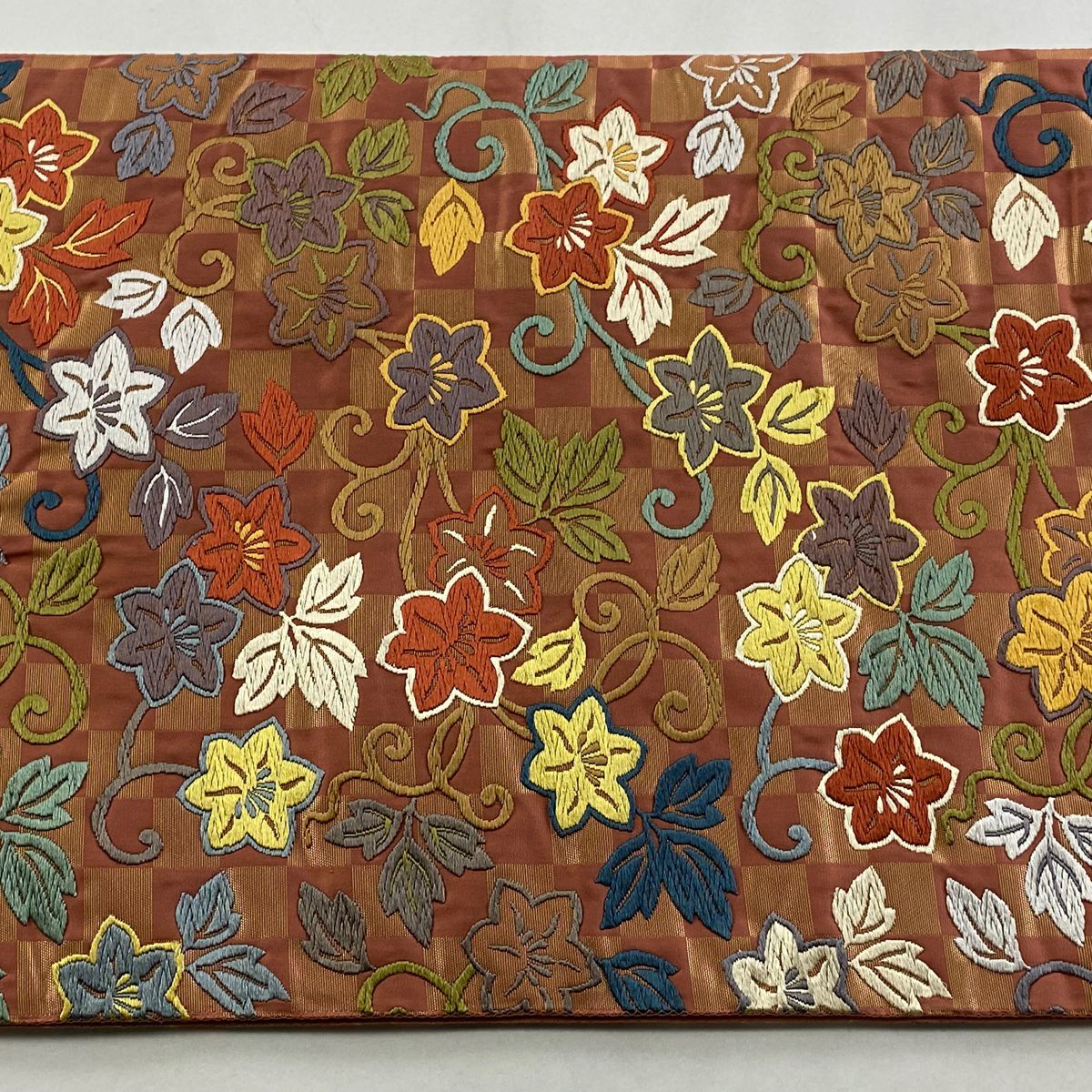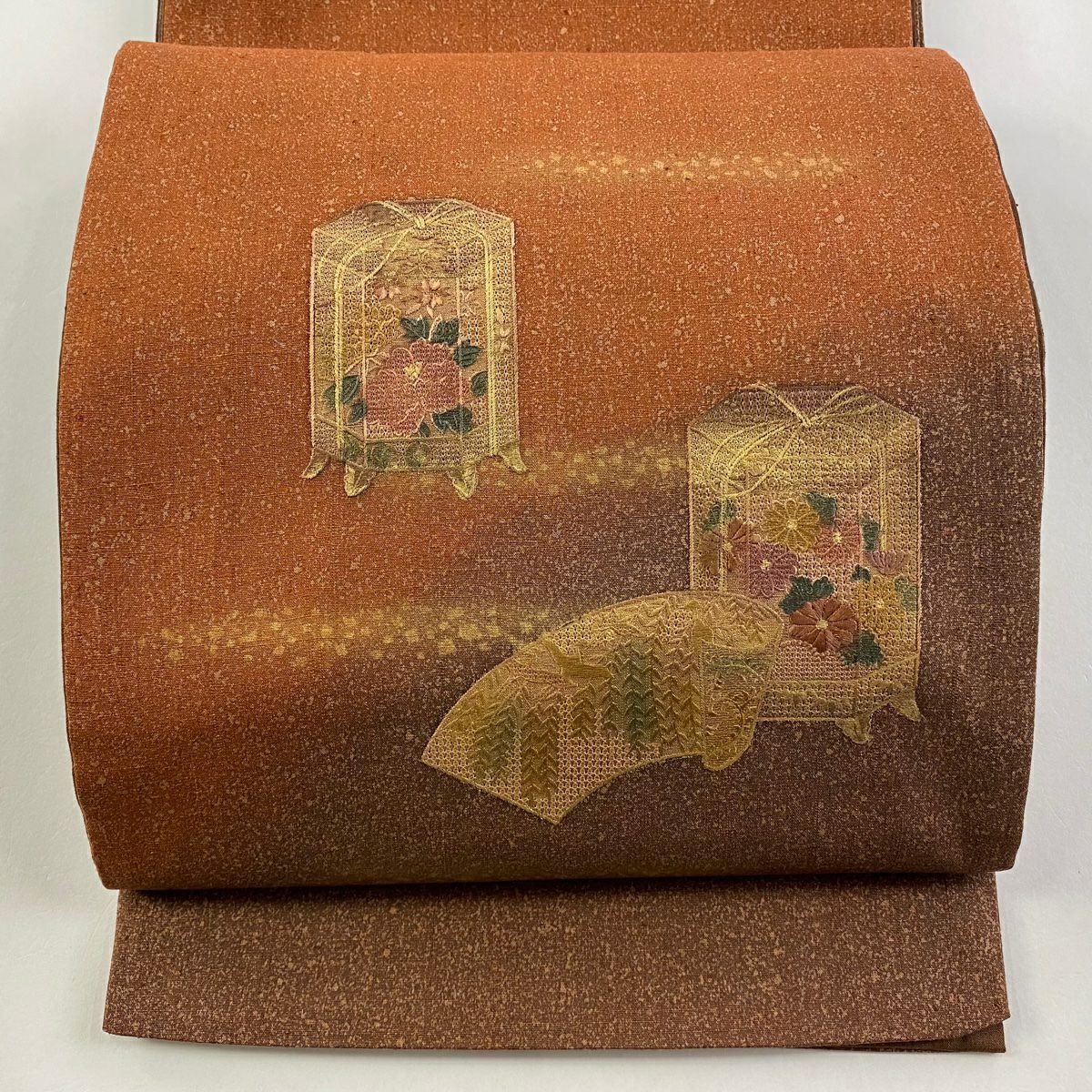 【在庫一掃】 袋帯 秀品 貝桶 草花 刺繍 金彩 茶色 お太鼓柄 正絹