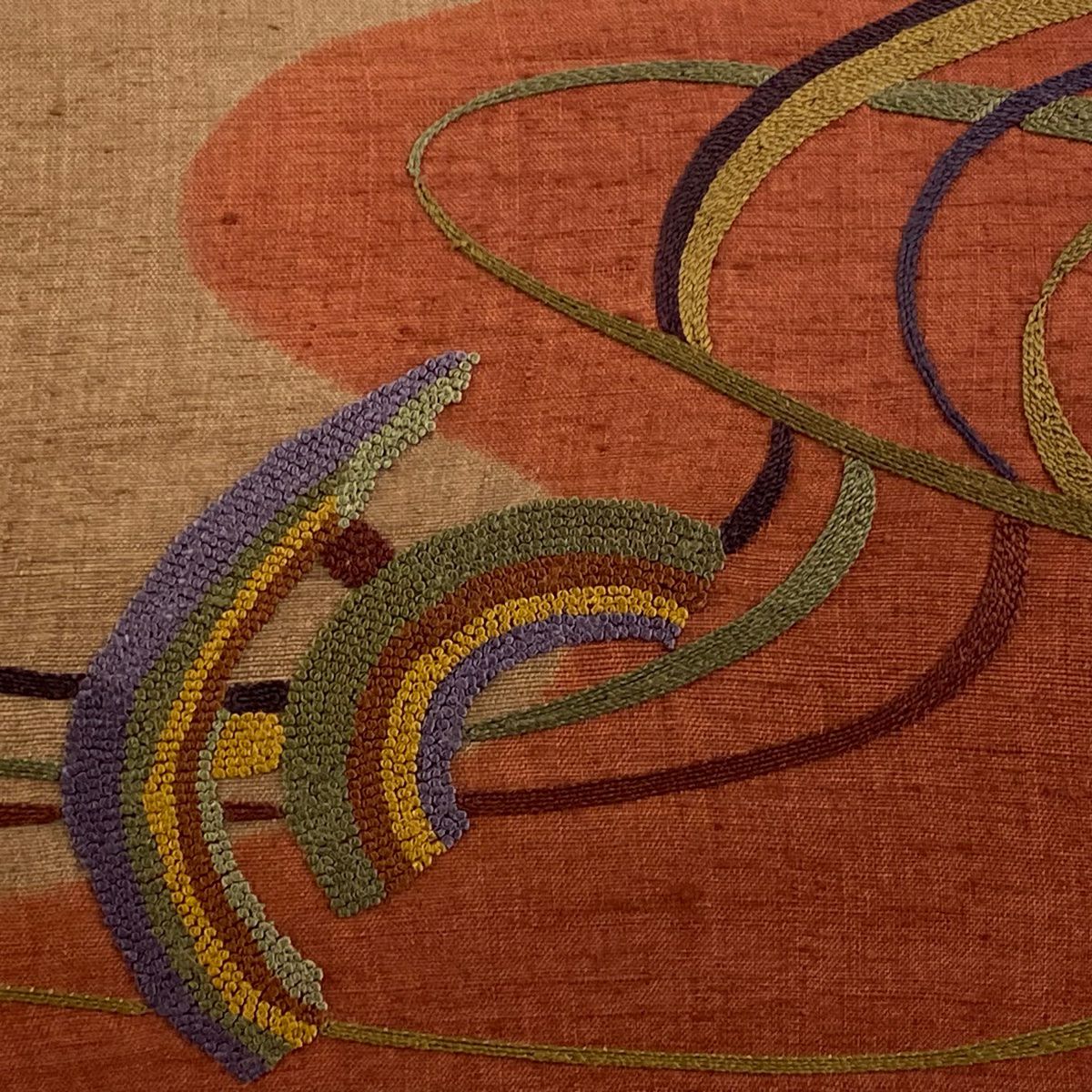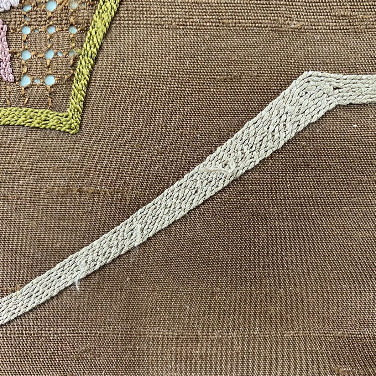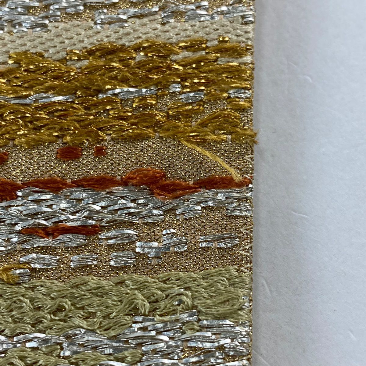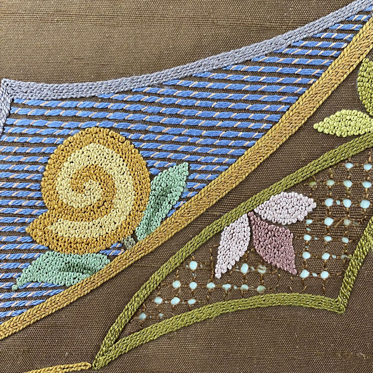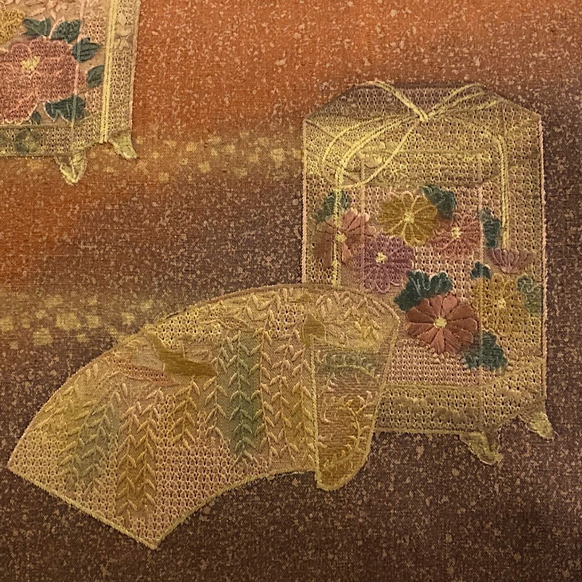 【在庫一掃】 袋帯 秀品 貝桶 草花 刺繍 金彩 茶色 お太鼓柄 正絹