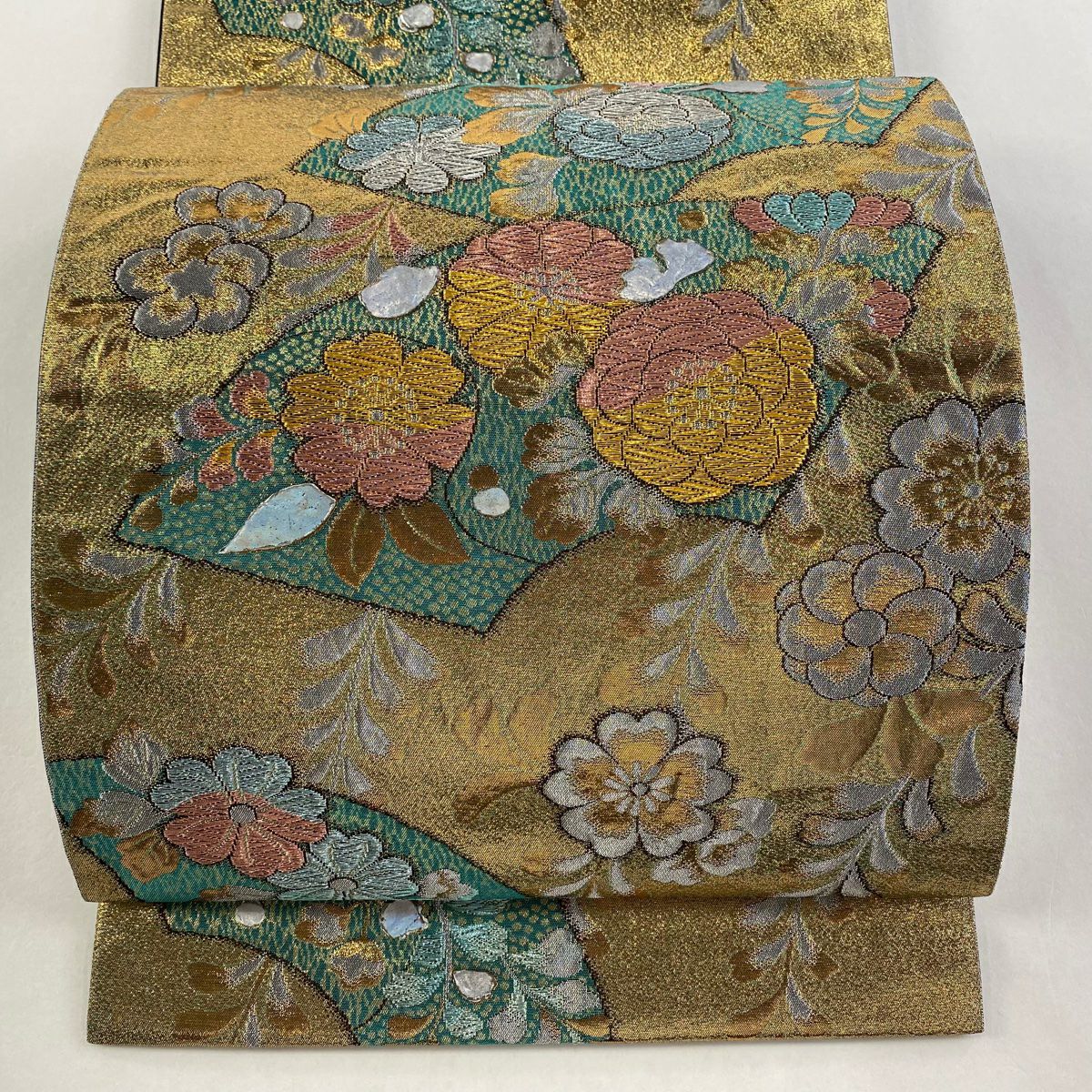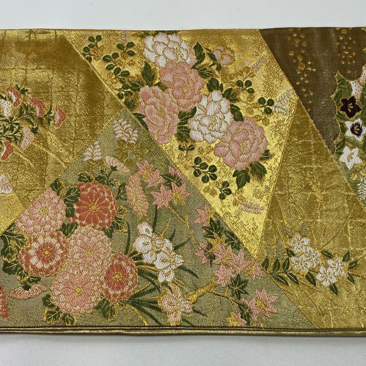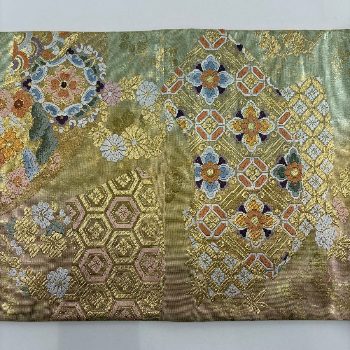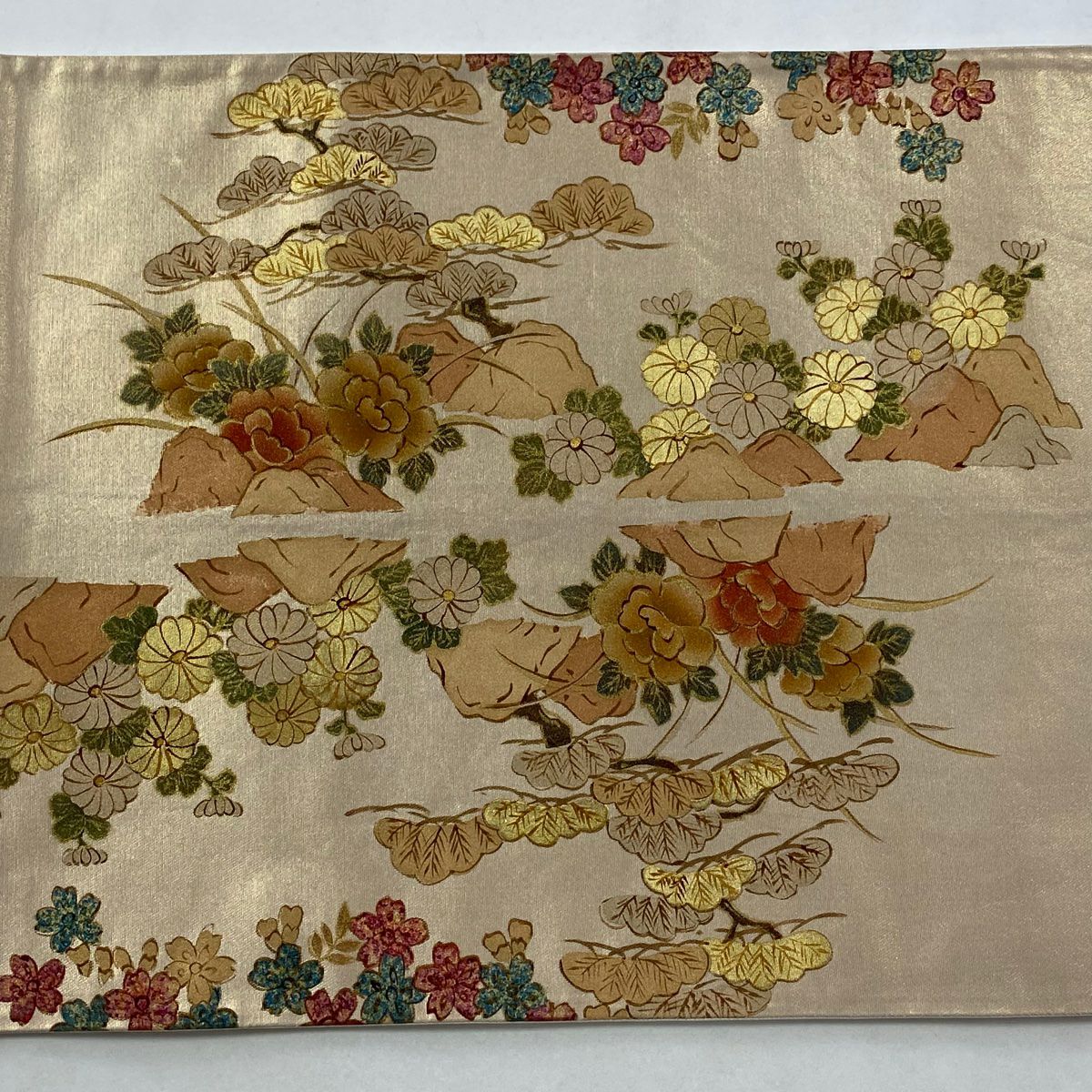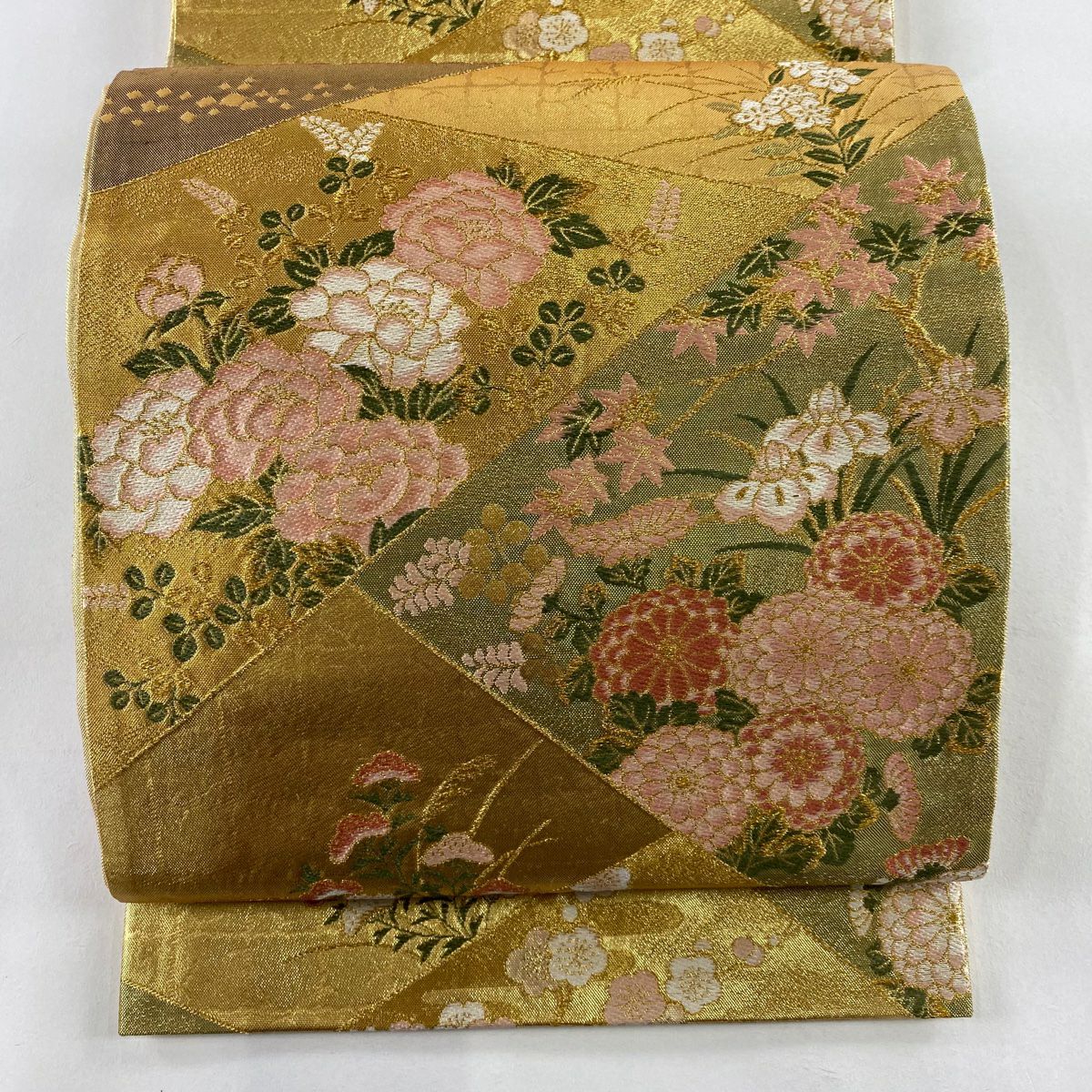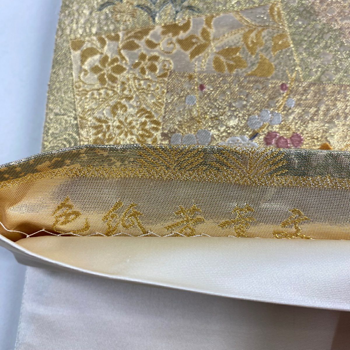 【在庫一掃】 袋帯 秀品 菊 枝梅 箔 唐織 ベージュ 六通 正絹