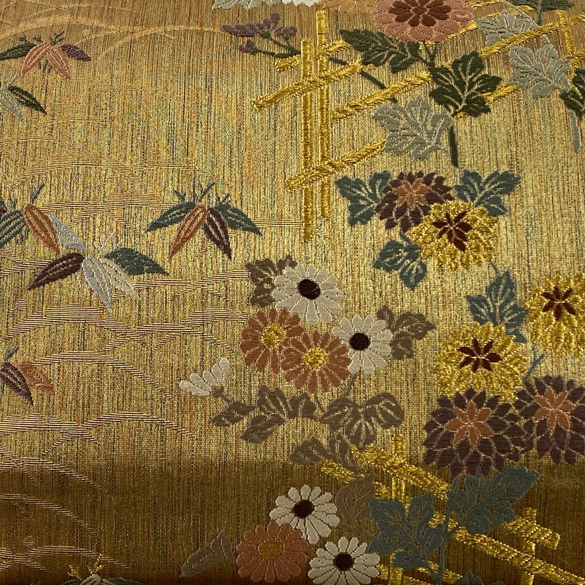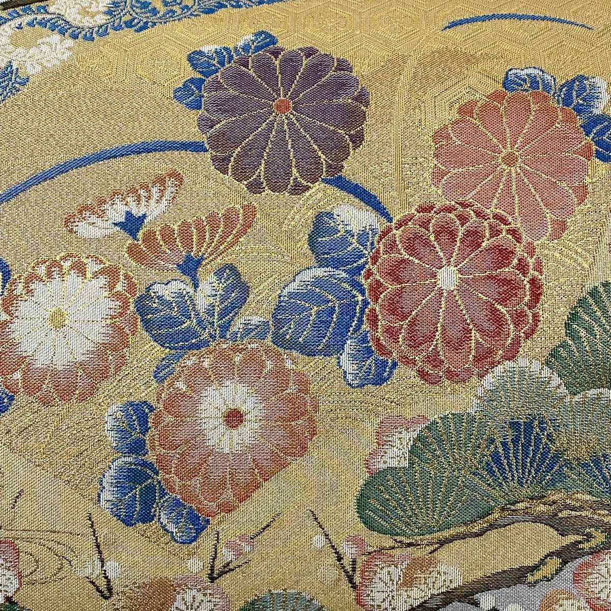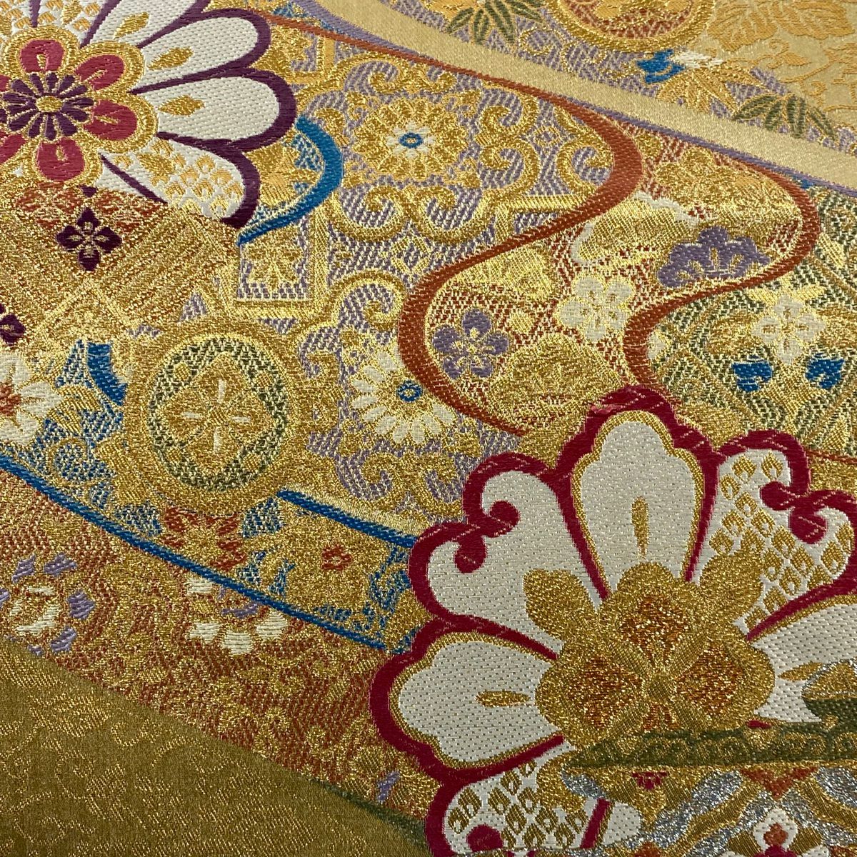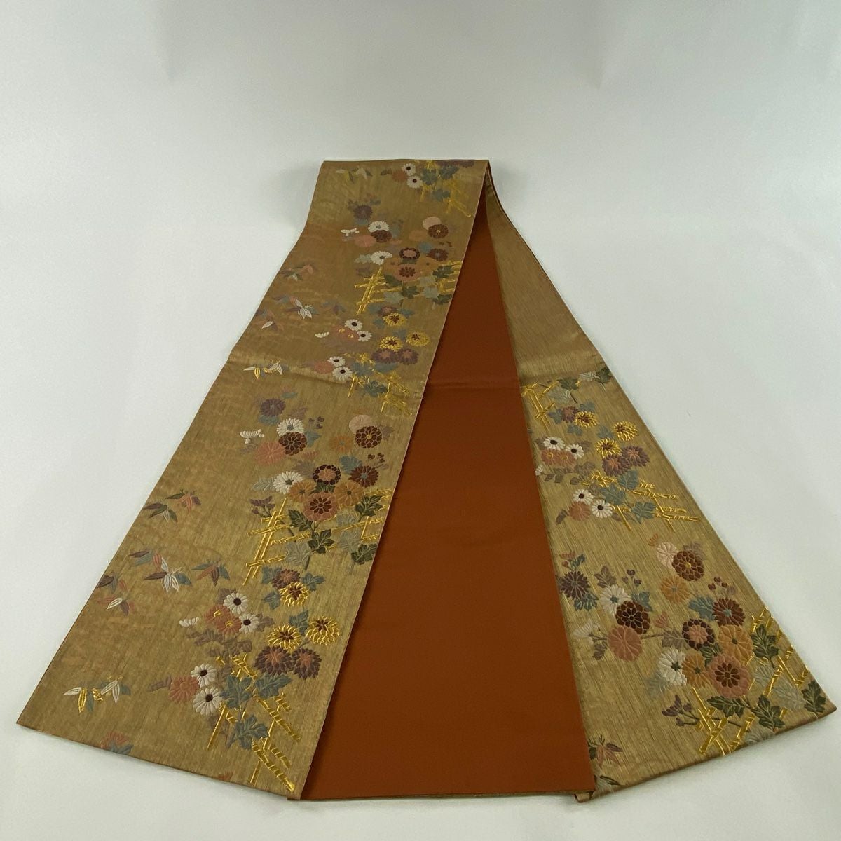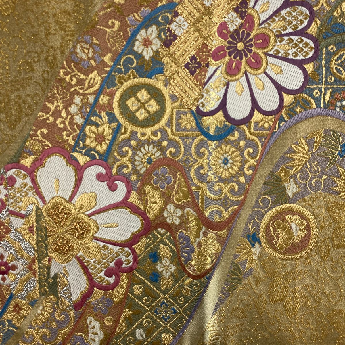 【在庫一掃】 袋帯 秀品 菊 枝梅 箔 唐織 ベージュ 六通 正絹