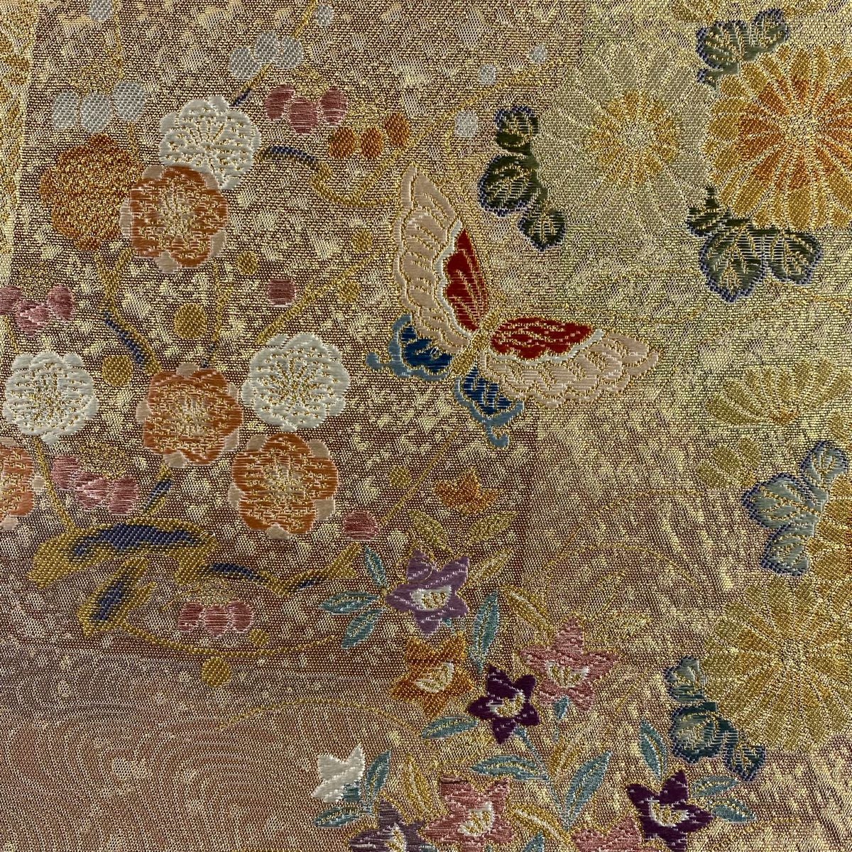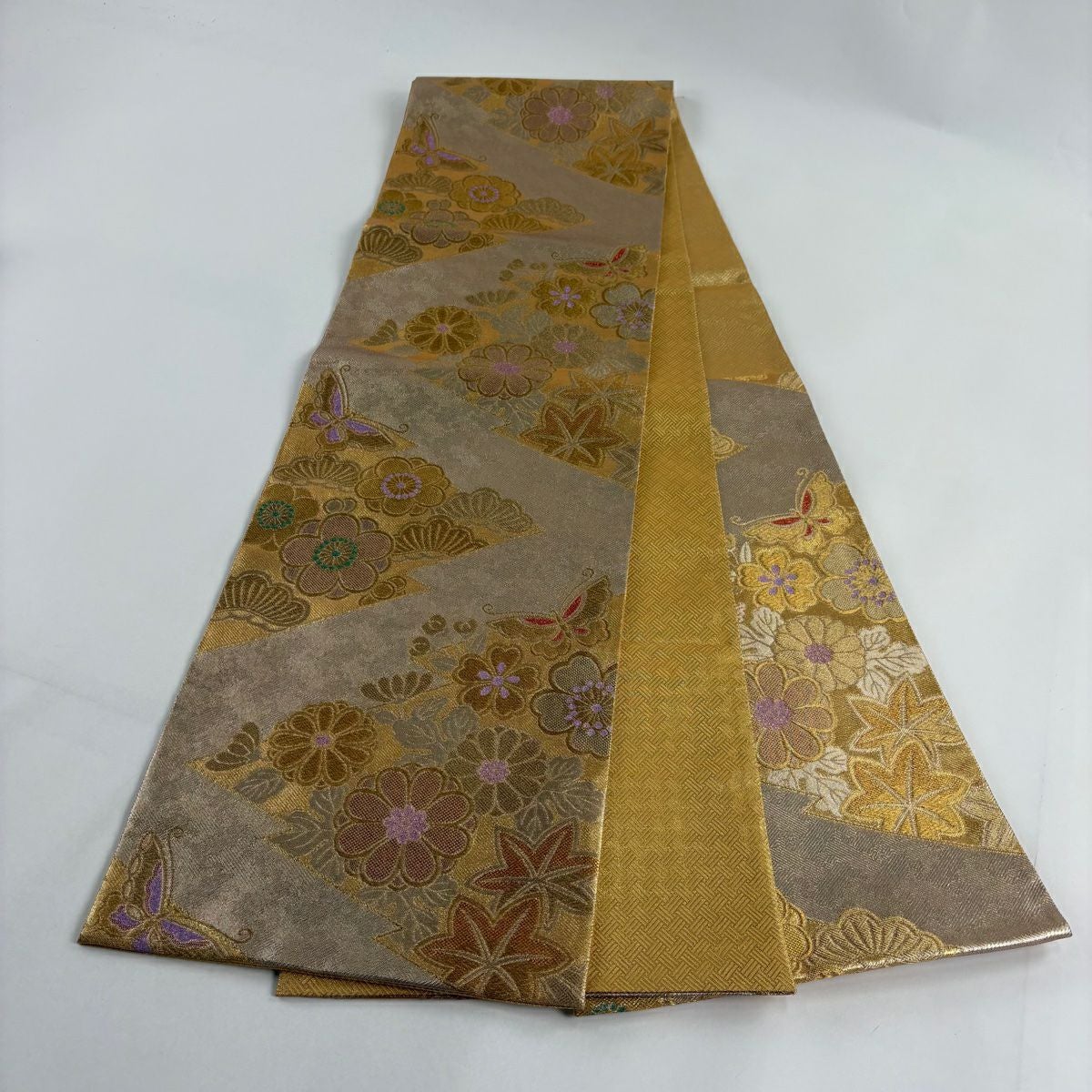 【在庫一掃】 袋帯 秀品 振袖向き 桜楓 蝶 金糸 箔 金色 六通 正絹