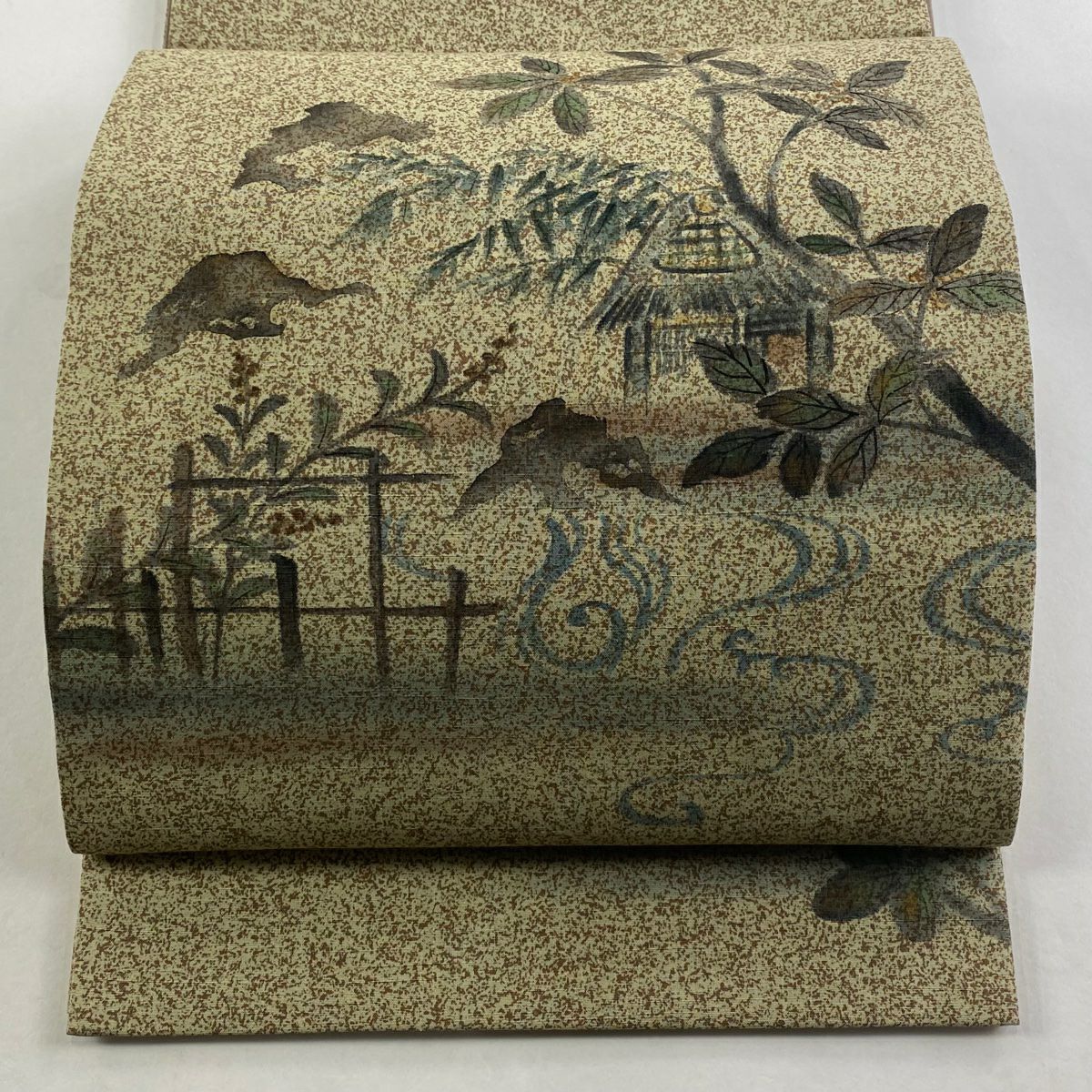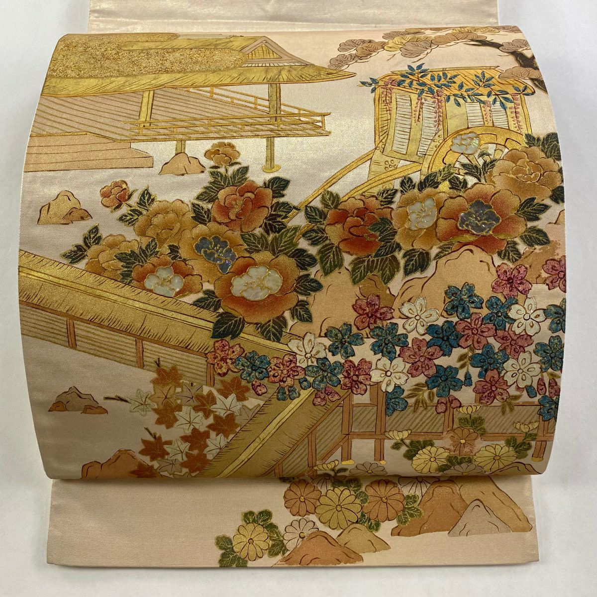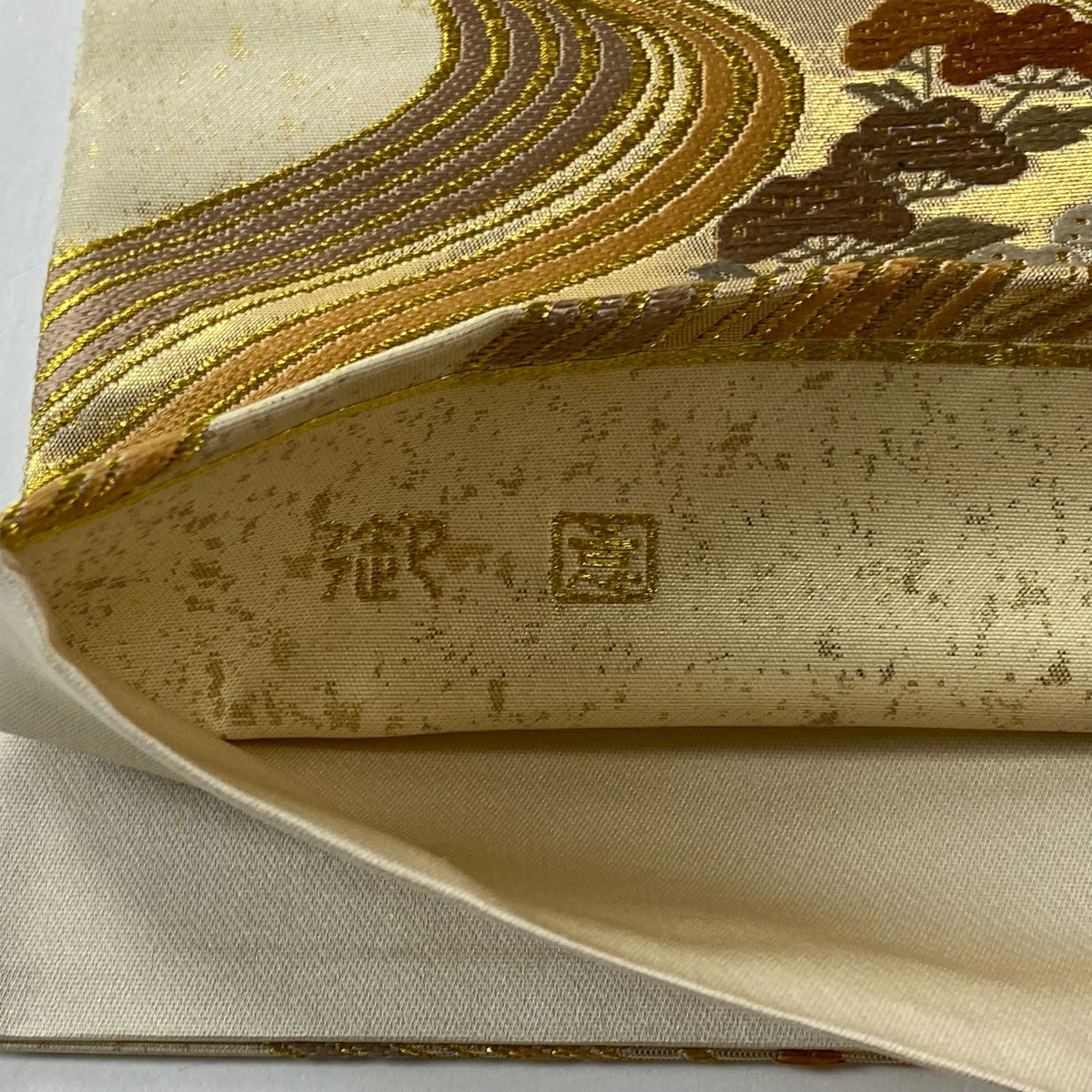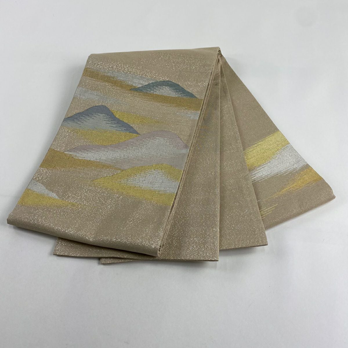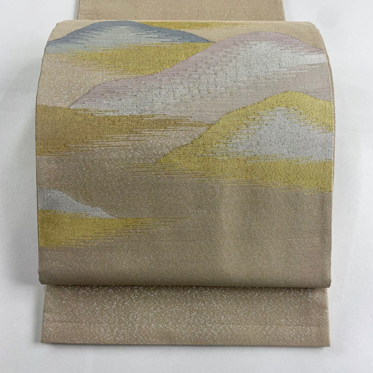 【在庫一掃】 【美品】 袋帯 秀品 霞 山 ベージュ お太鼓柄 正絹