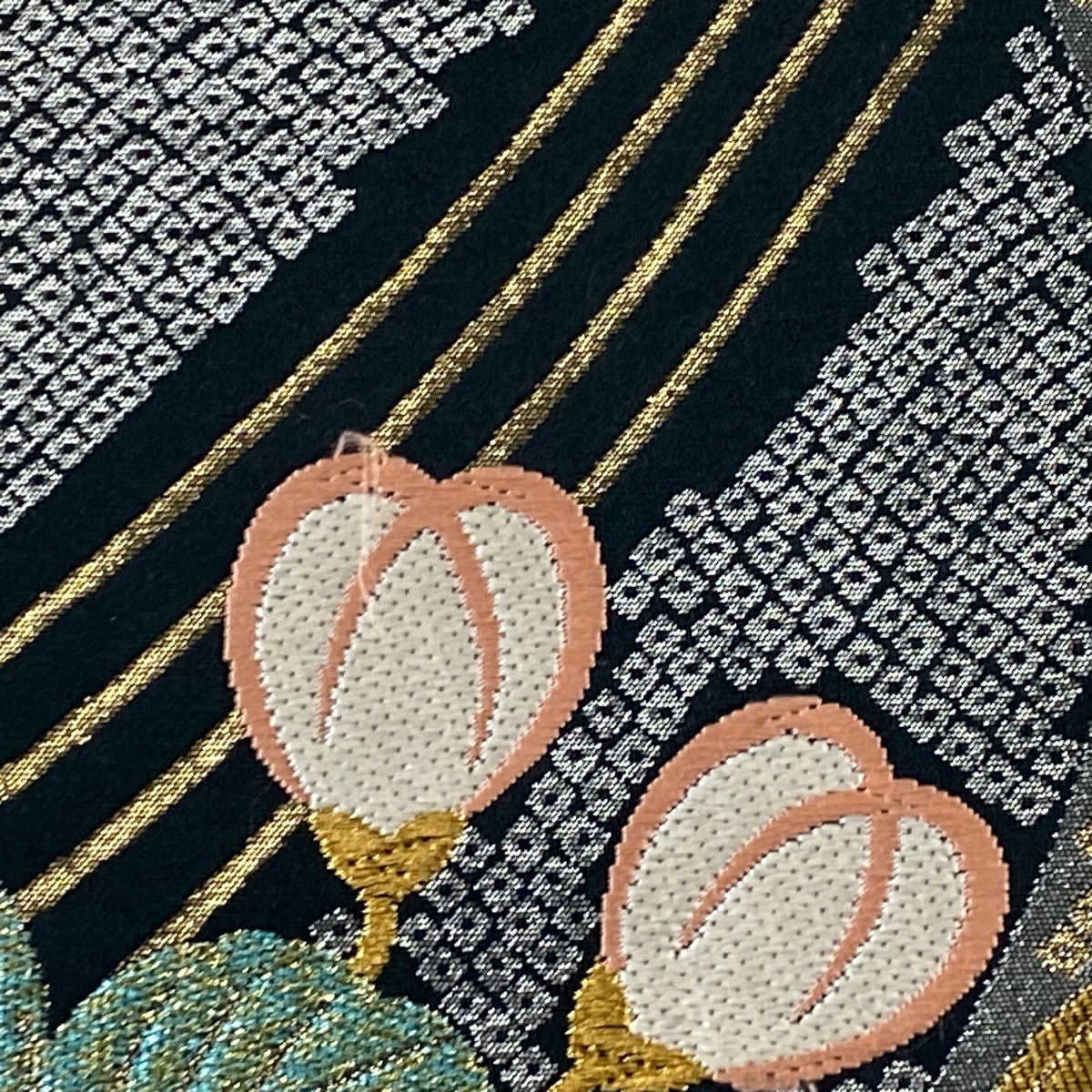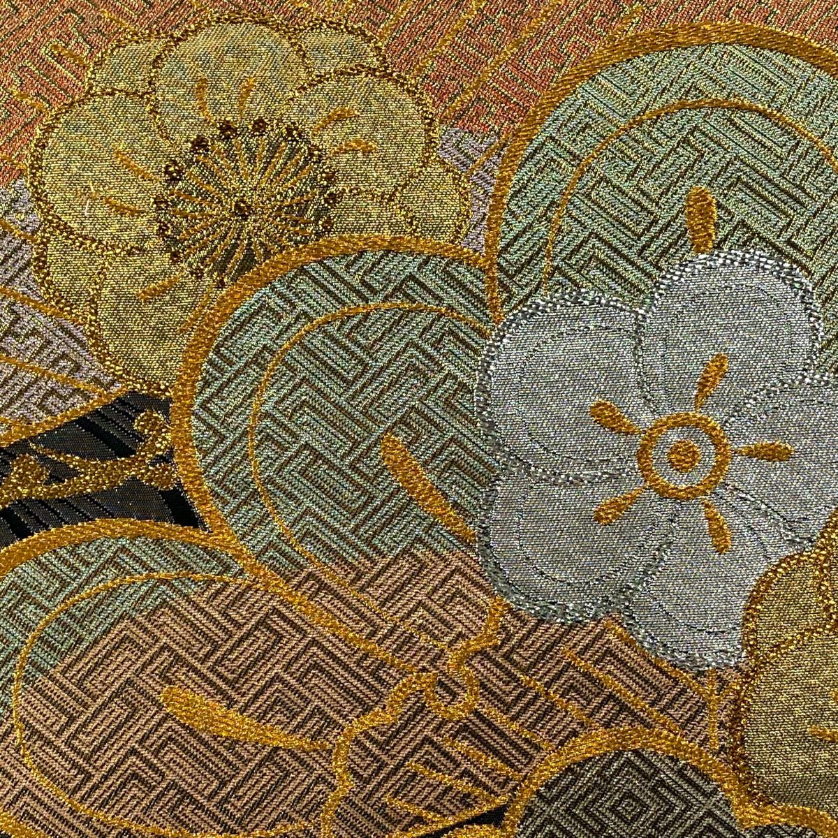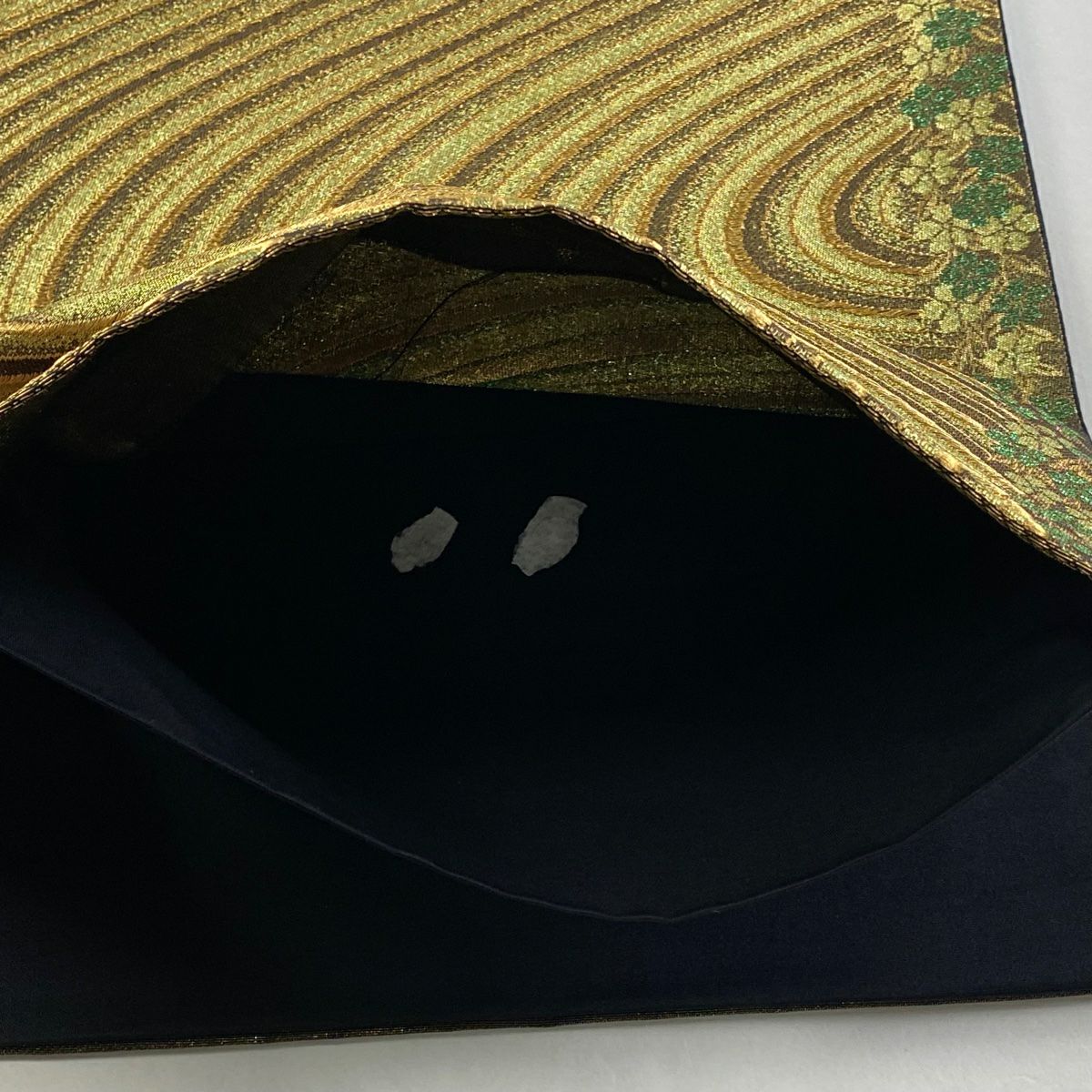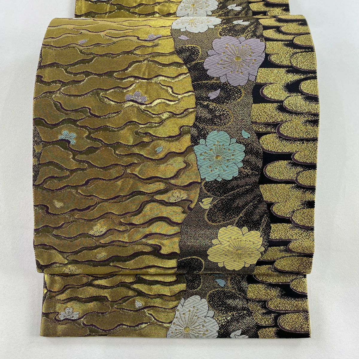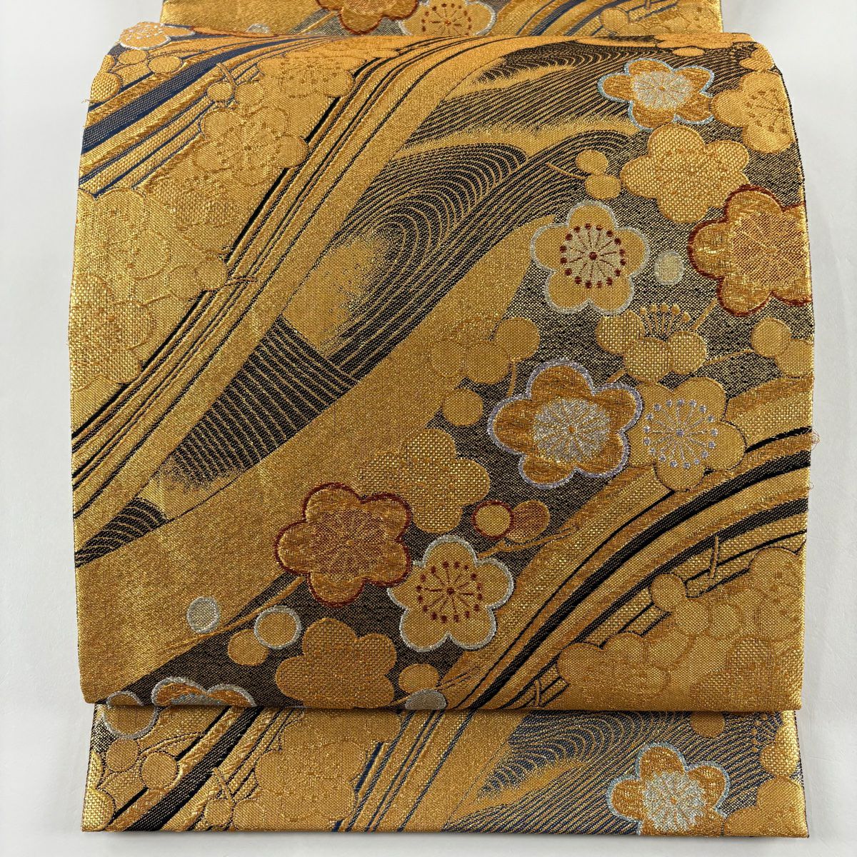 【在庫一掃】 袋帯 秀品 振袖向き 梅 波 金銀糸 箔 金色 六通 正絹