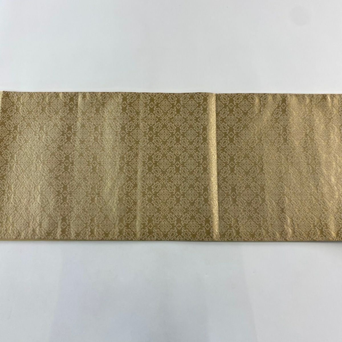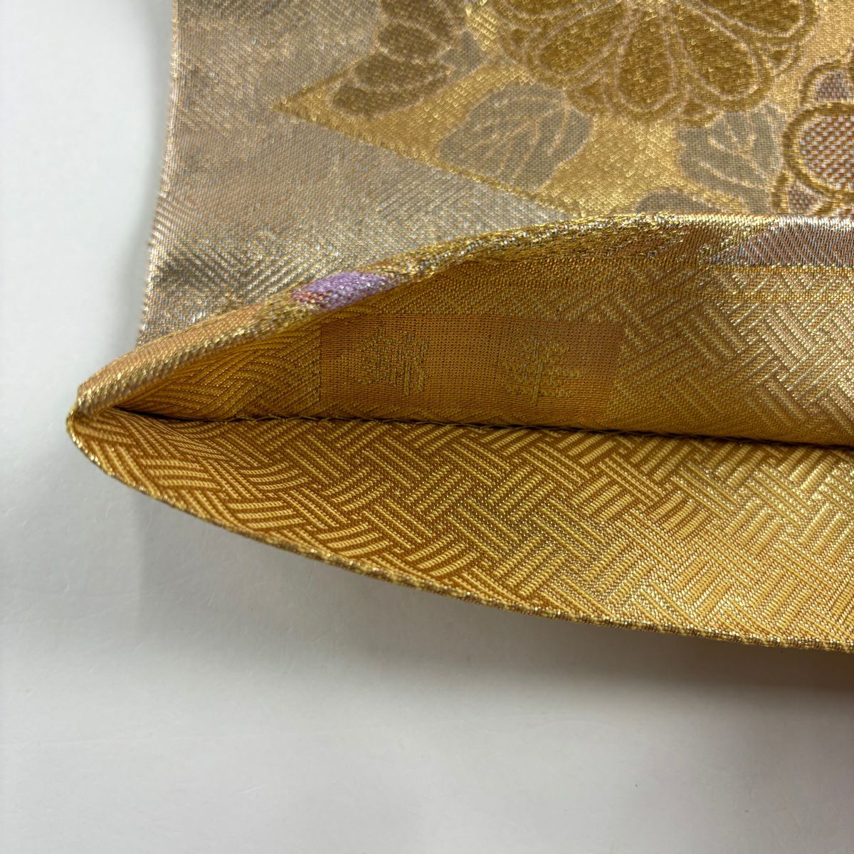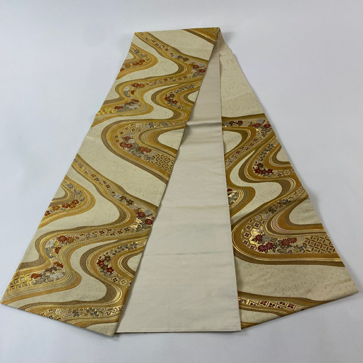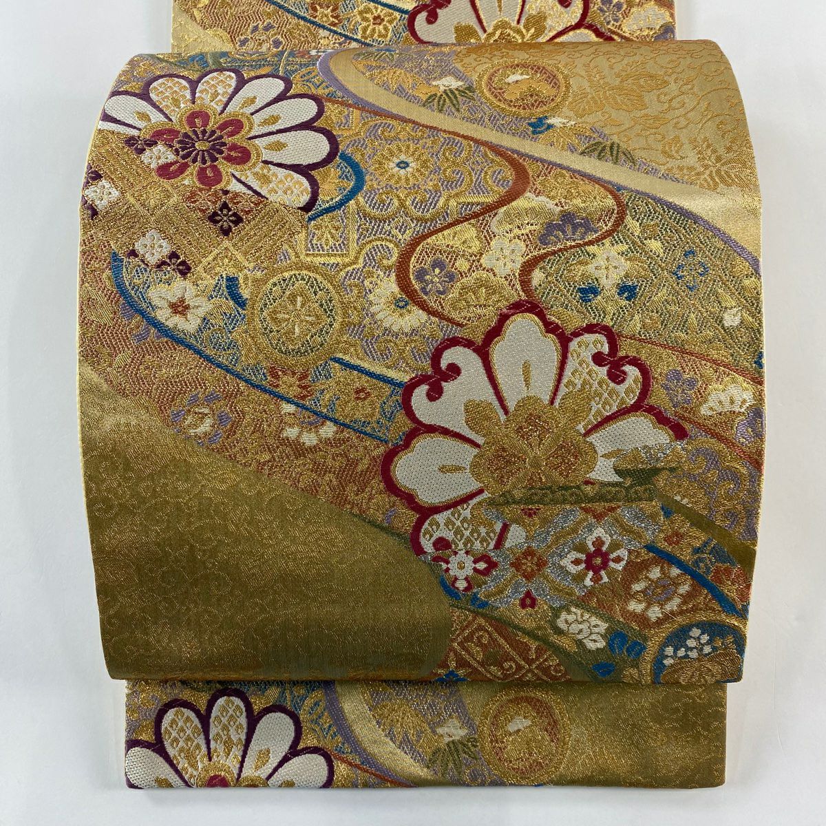 【在庫一掃】 【美品】 袋帯 秀品 流水草花文 金糸 箔 金色 六通 正絹