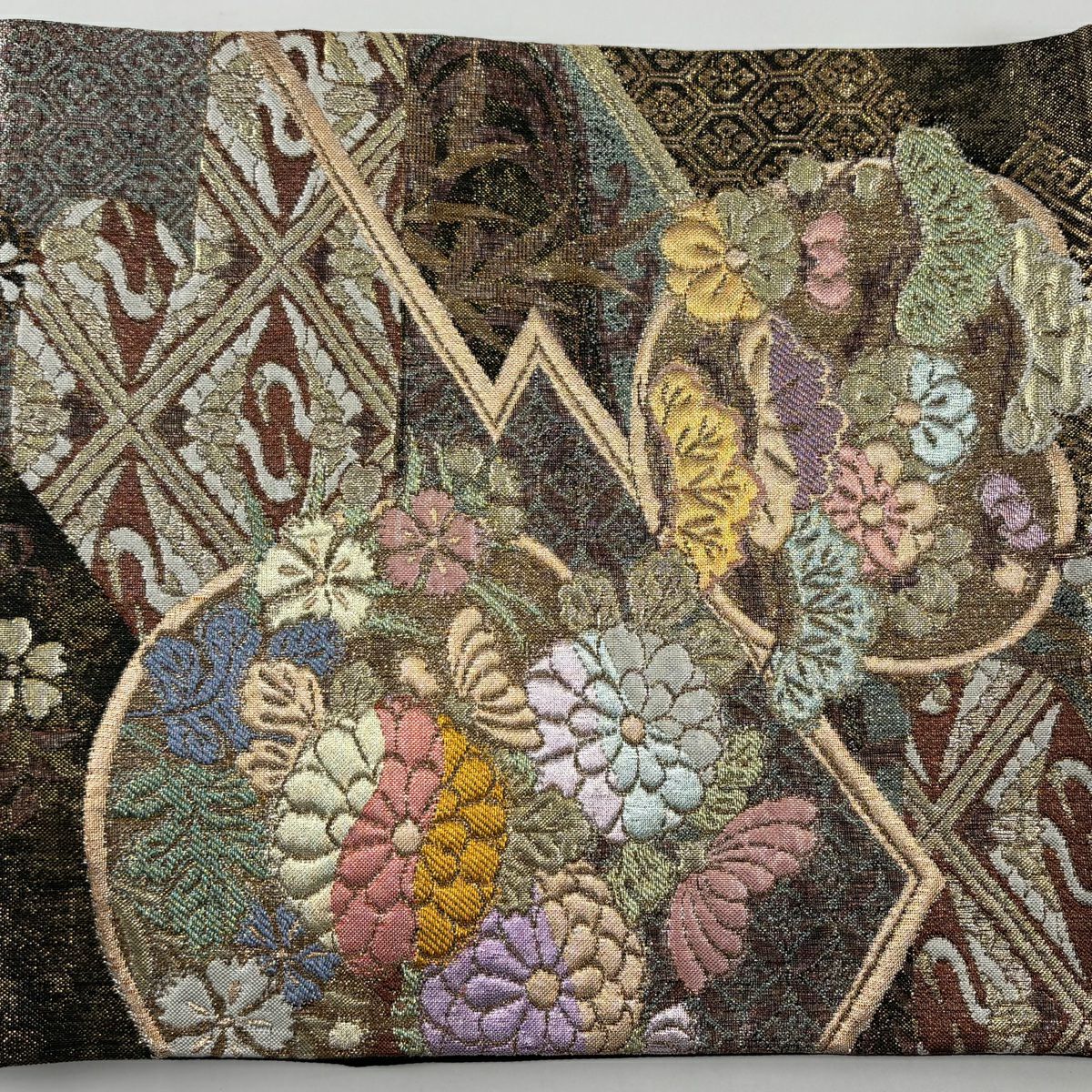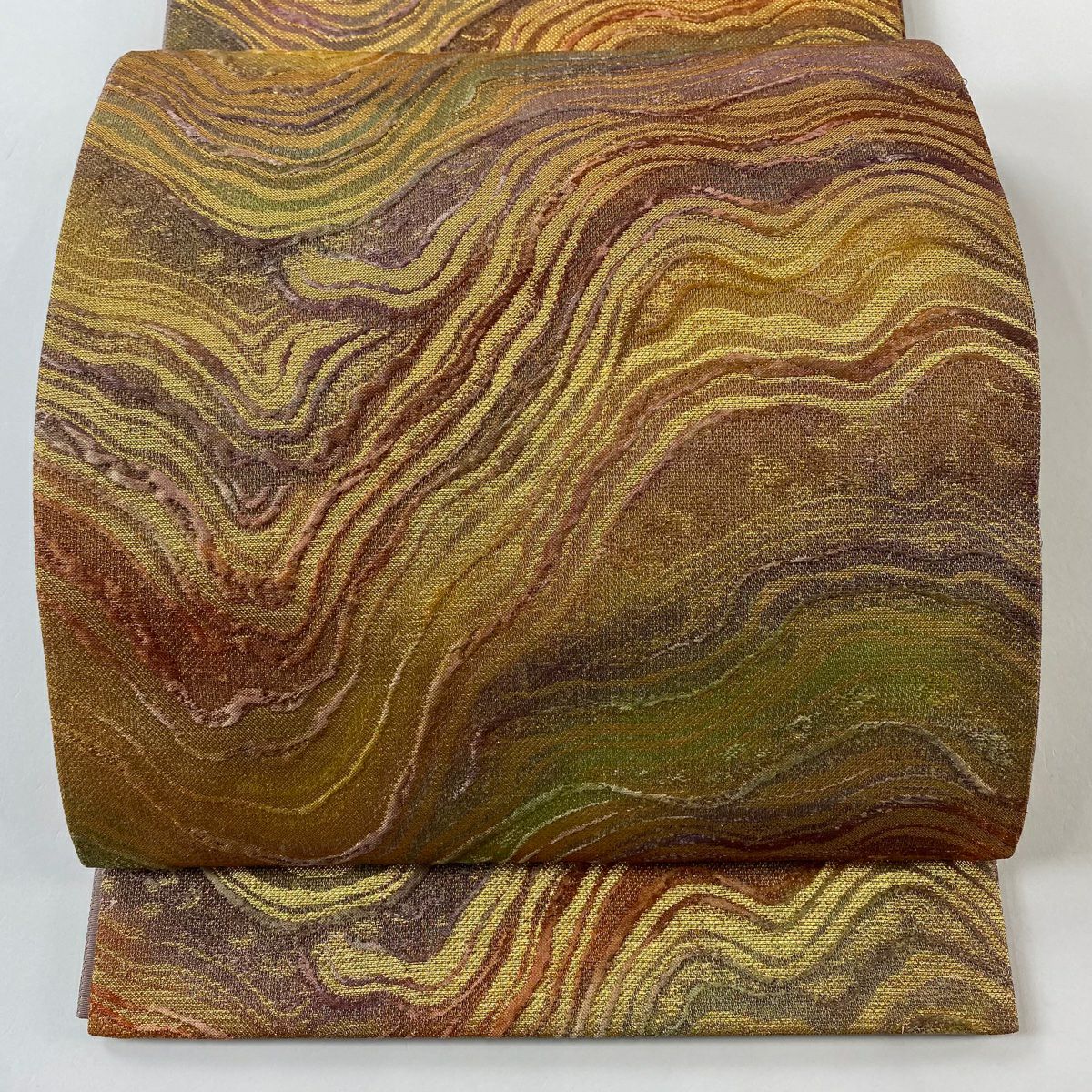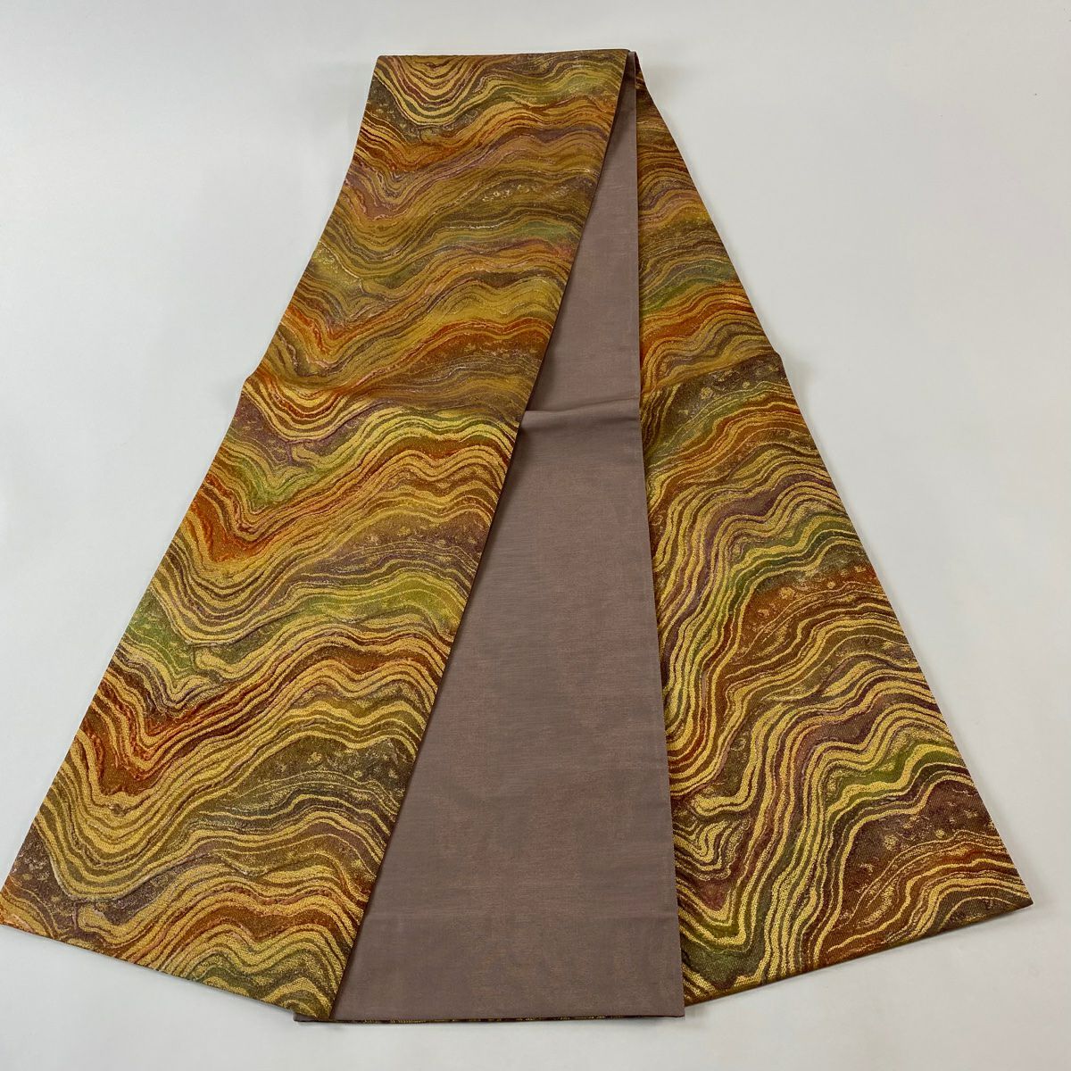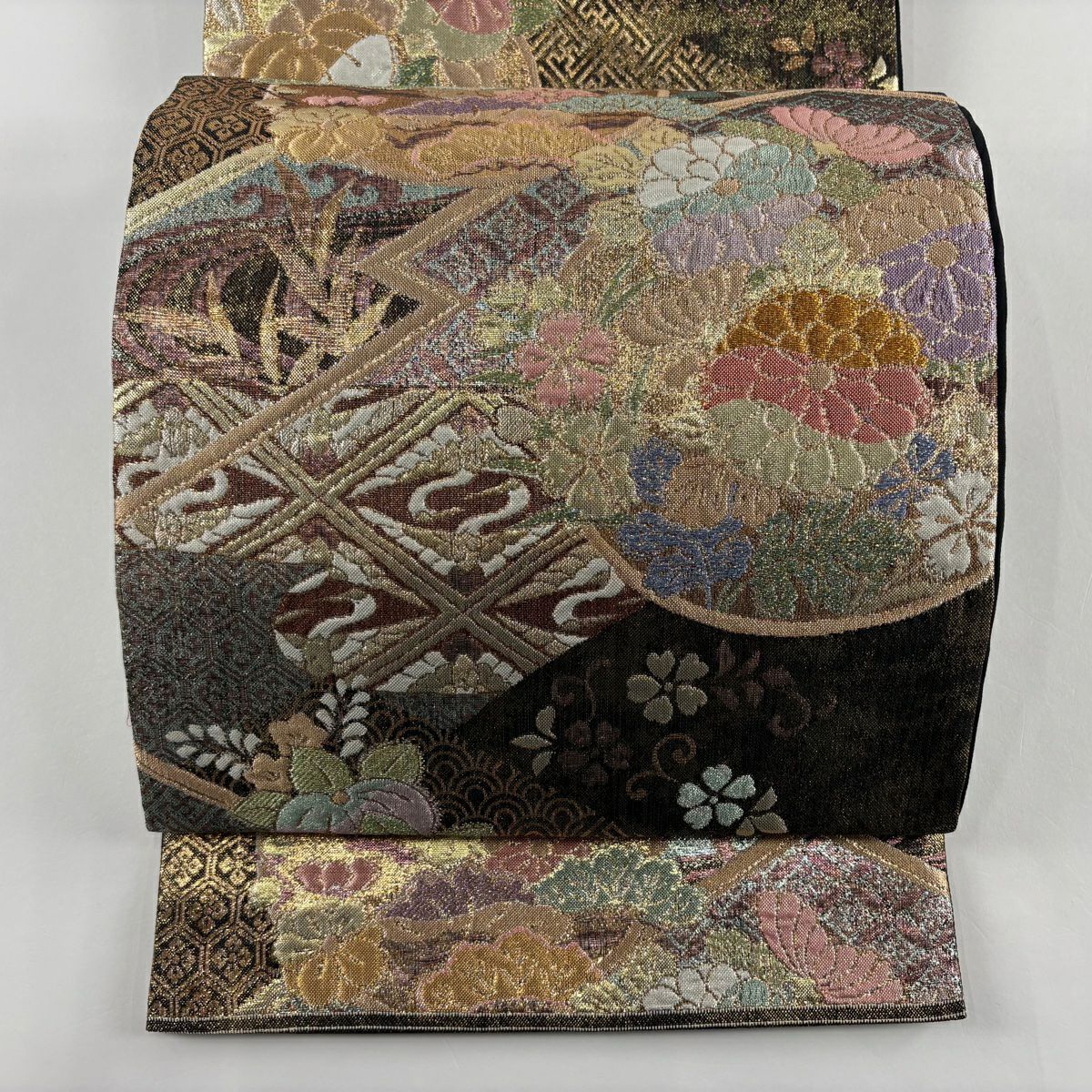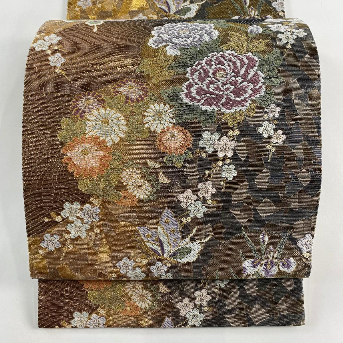 【在庫一掃】 【美品】 袋帯 秀品 霞 幾何学模様 箔 茶色 六通 正絹