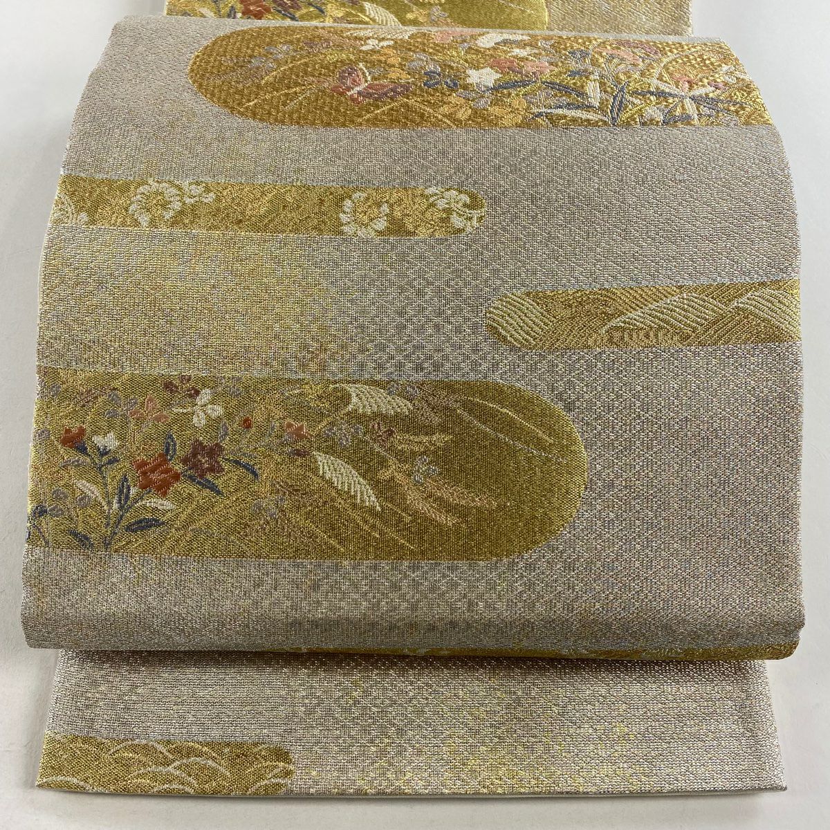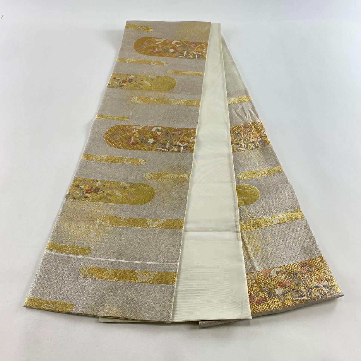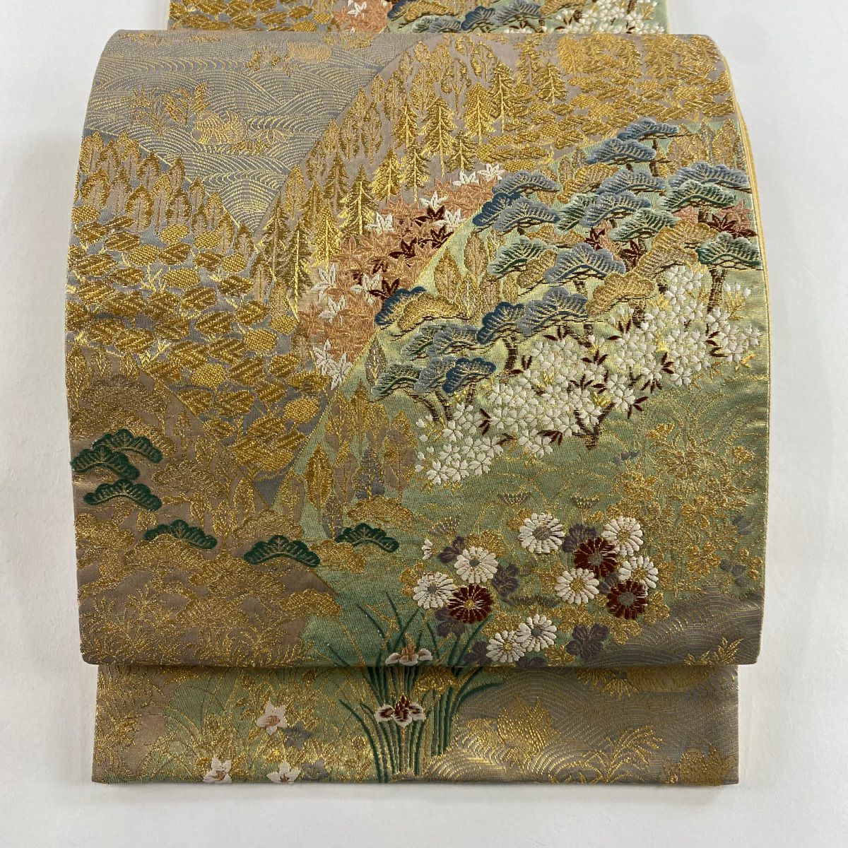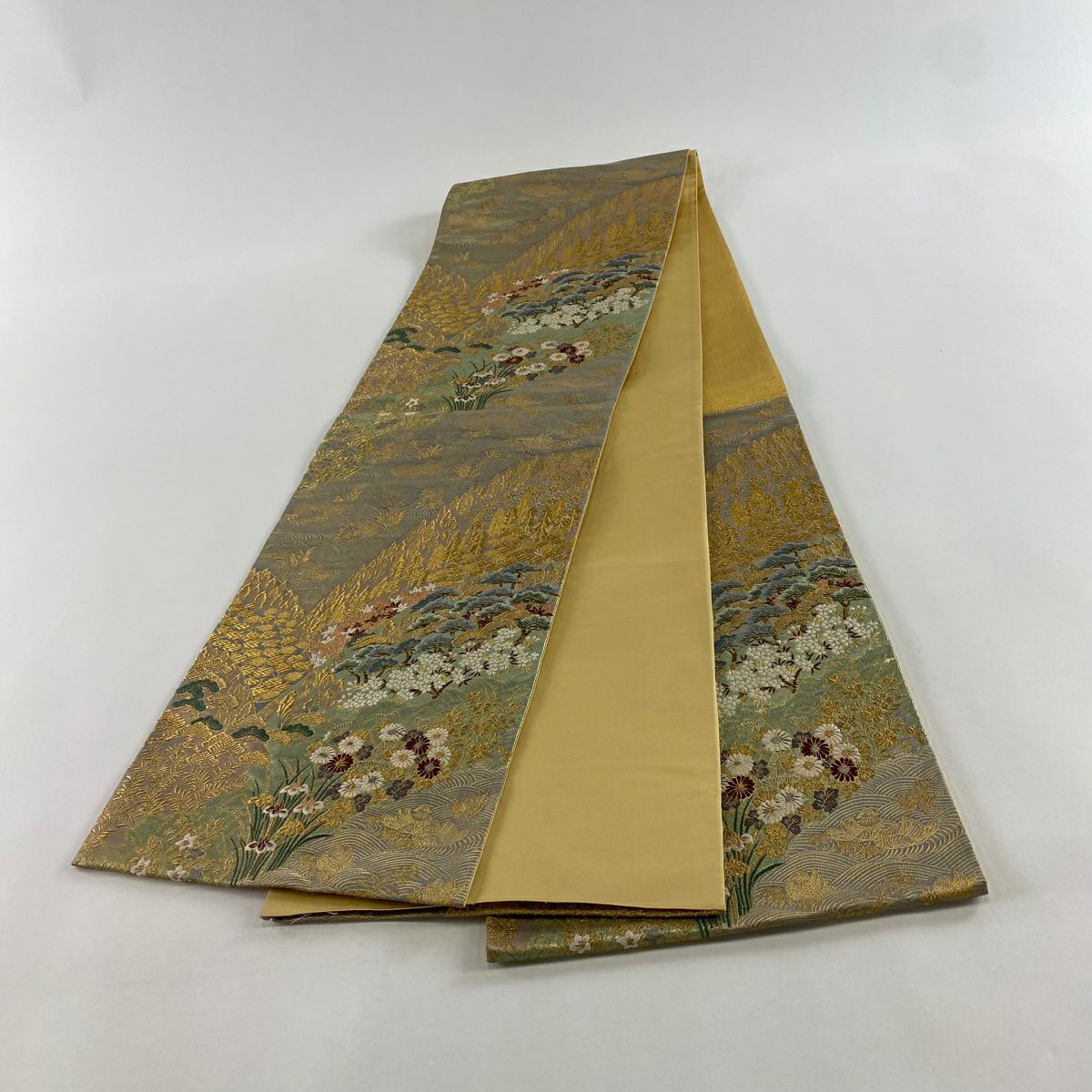 【在庫一掃】 【美品】 袋帯 秀品 秋草 松 金糸 箔 灰茶 六通 正絹