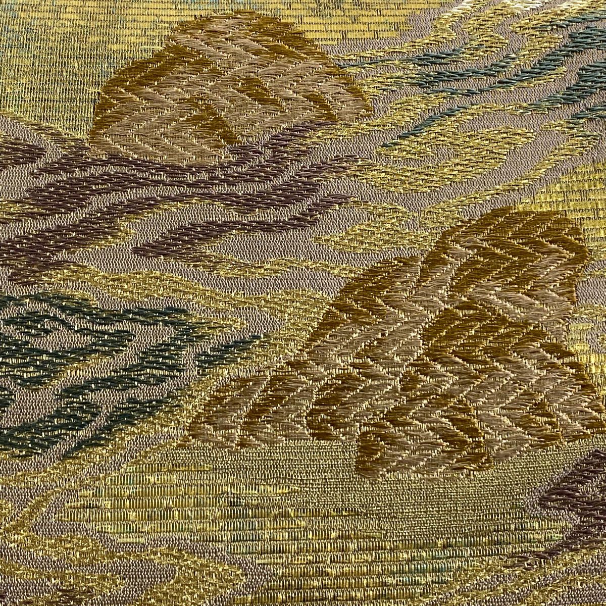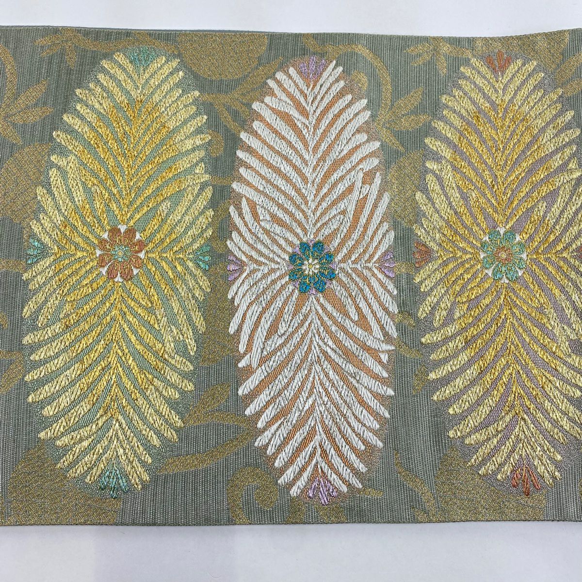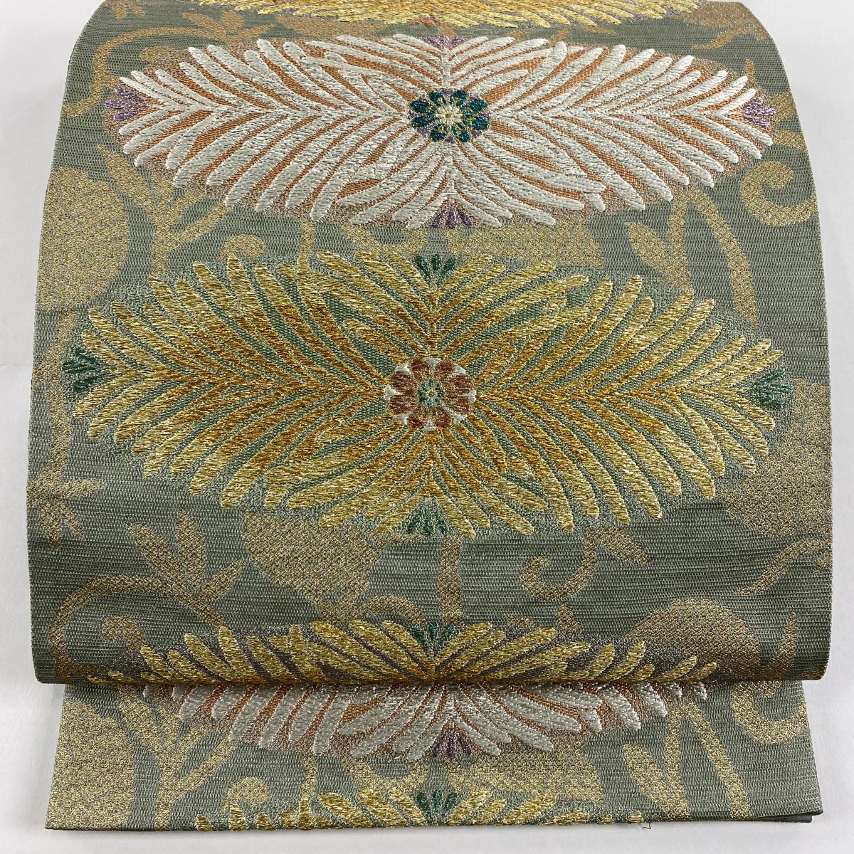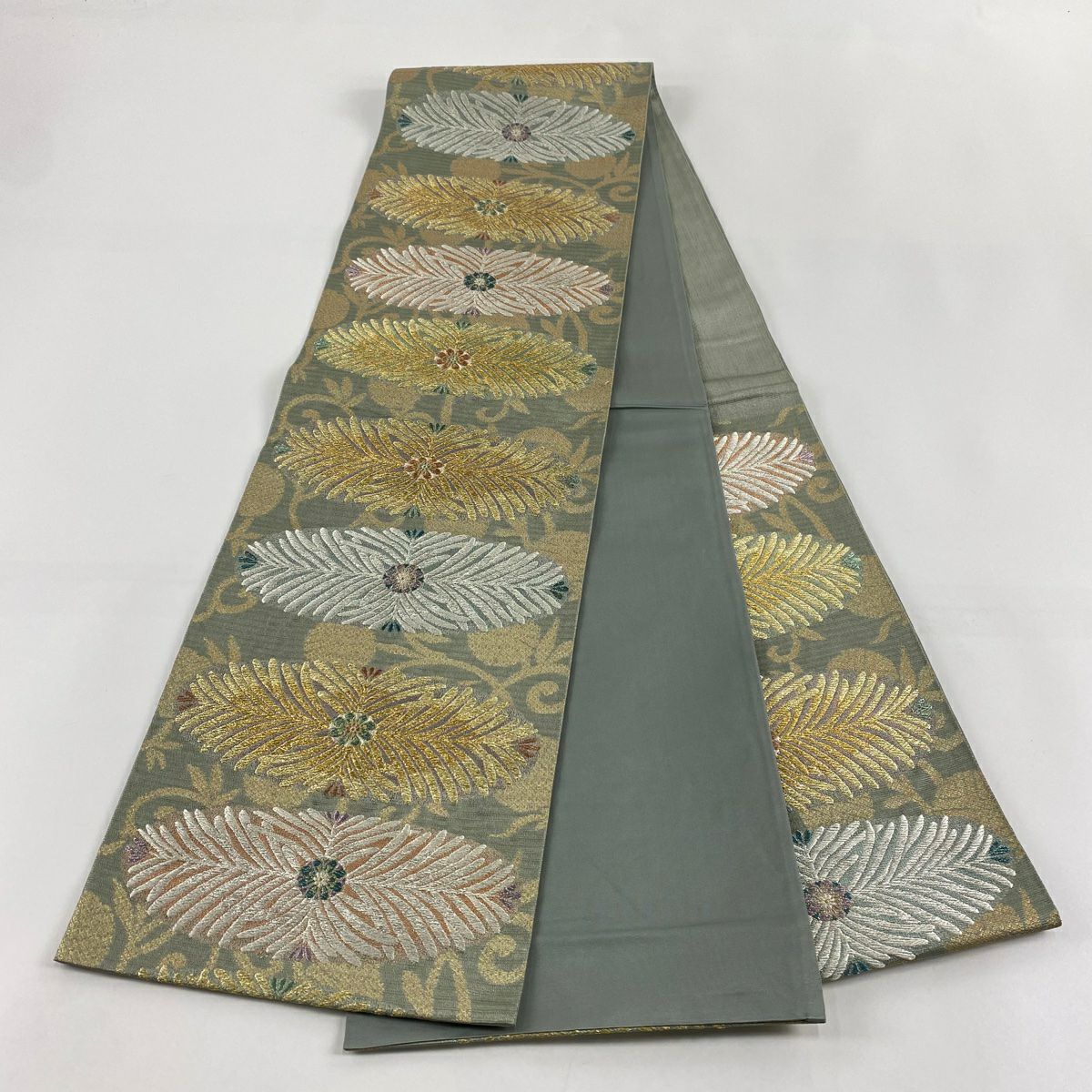 【在庫一掃】 【美品】 袋帯 秀品 秋草 松 金糸 箔 灰茶 六通 正絹