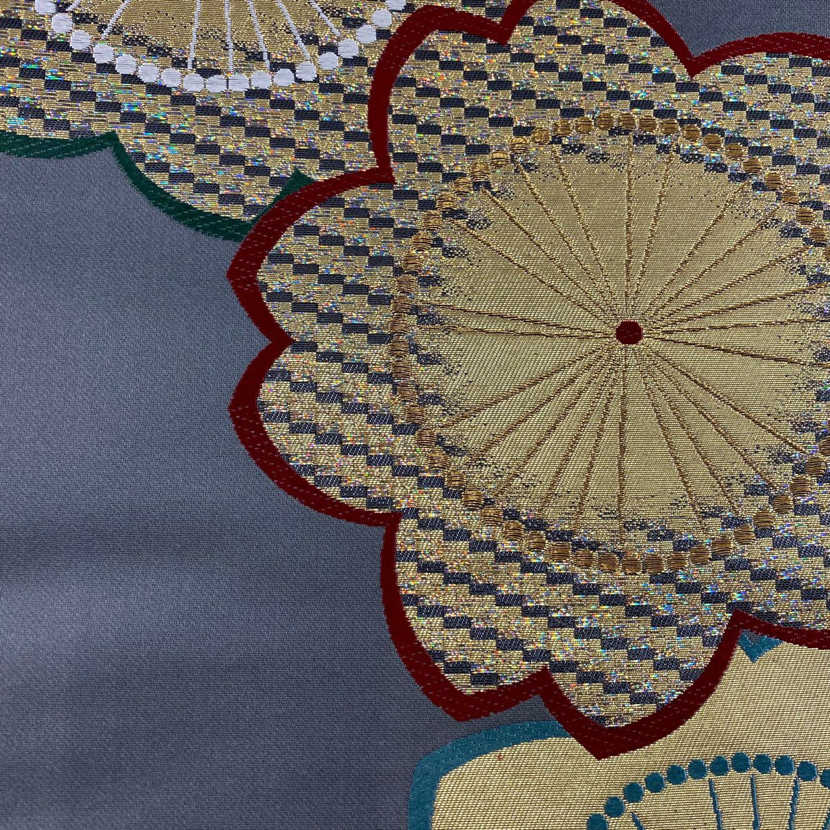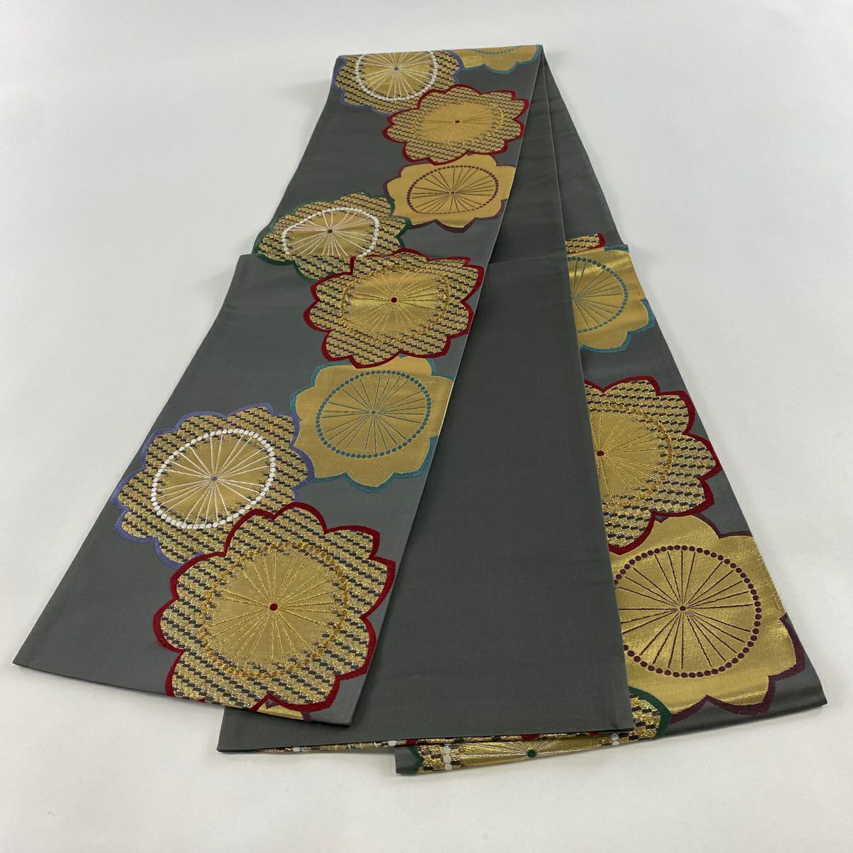 【在庫一掃】 袋帯 秀品 振袖向き 桜 ラメ箔 金糸 灰色 六通 正絹