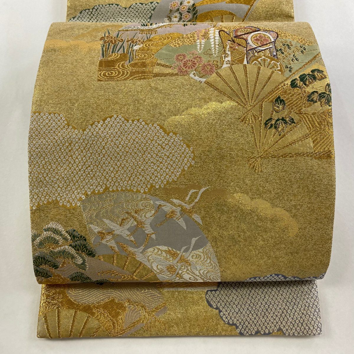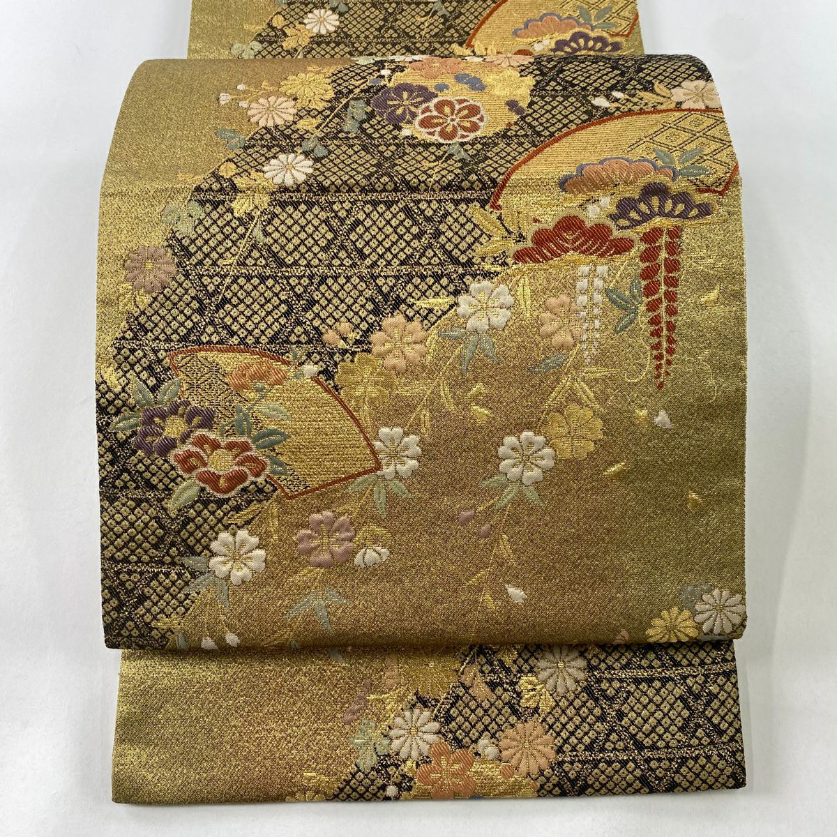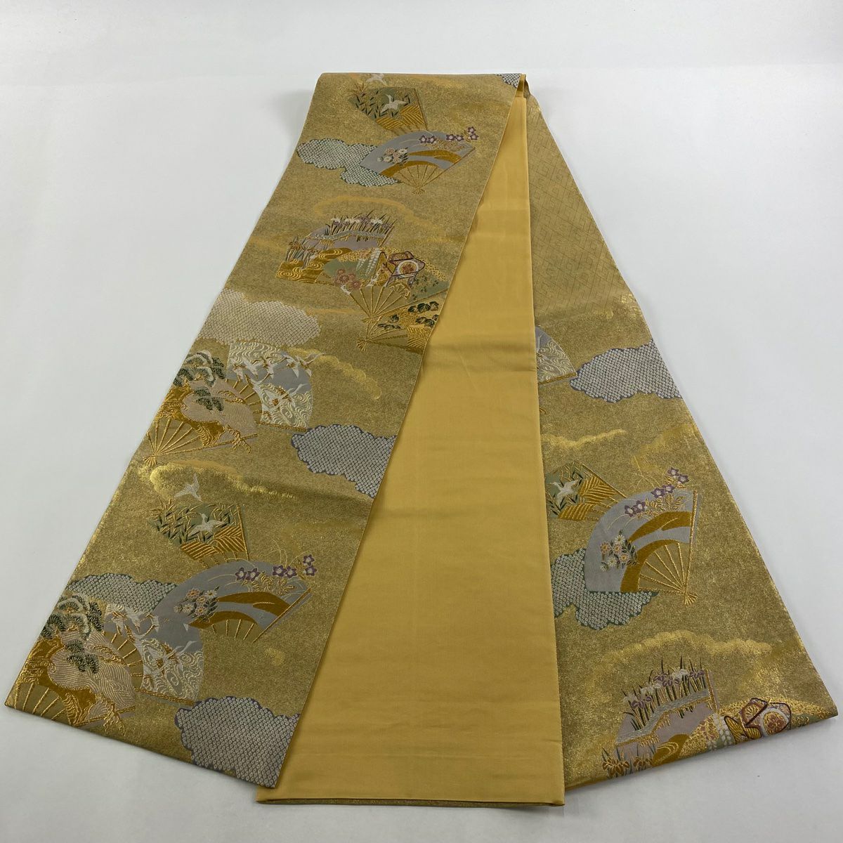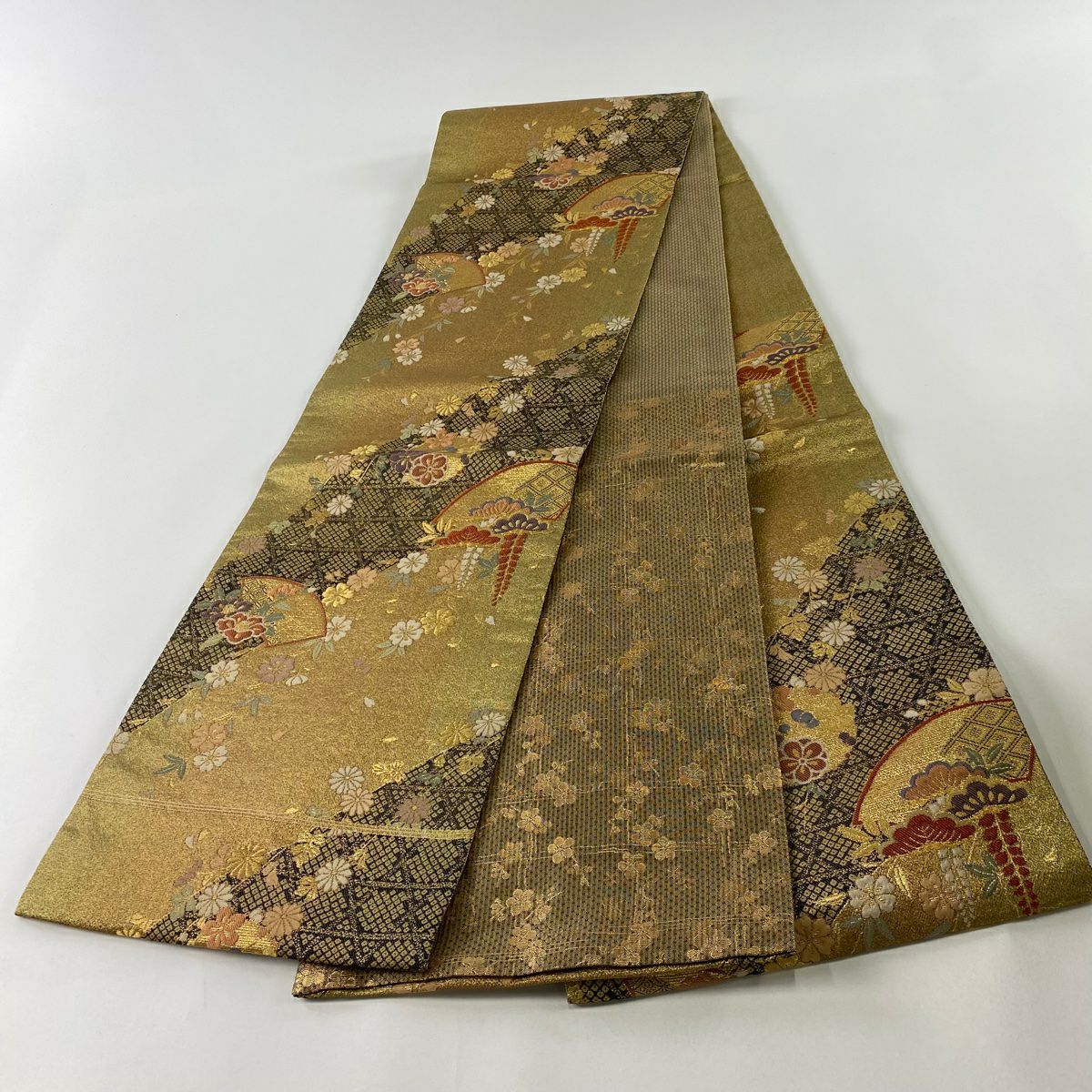【在庫一掃】 【美品】 袋帯 秀品 扇面 笠松 金糸 箔 金色 六通 正絹